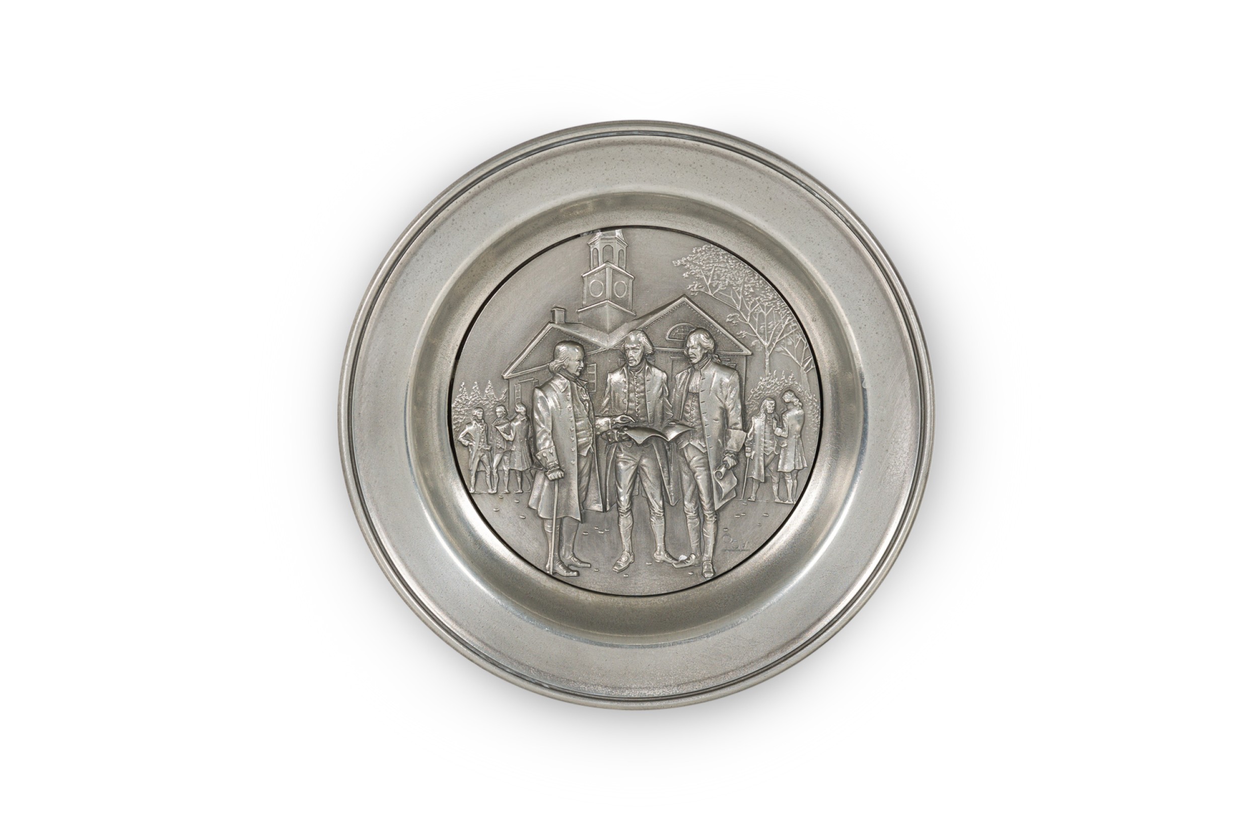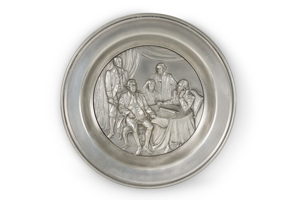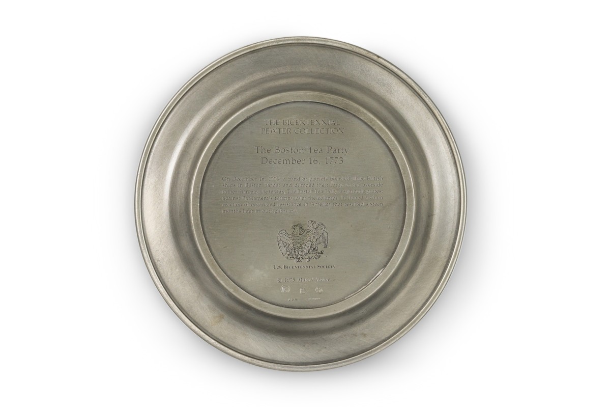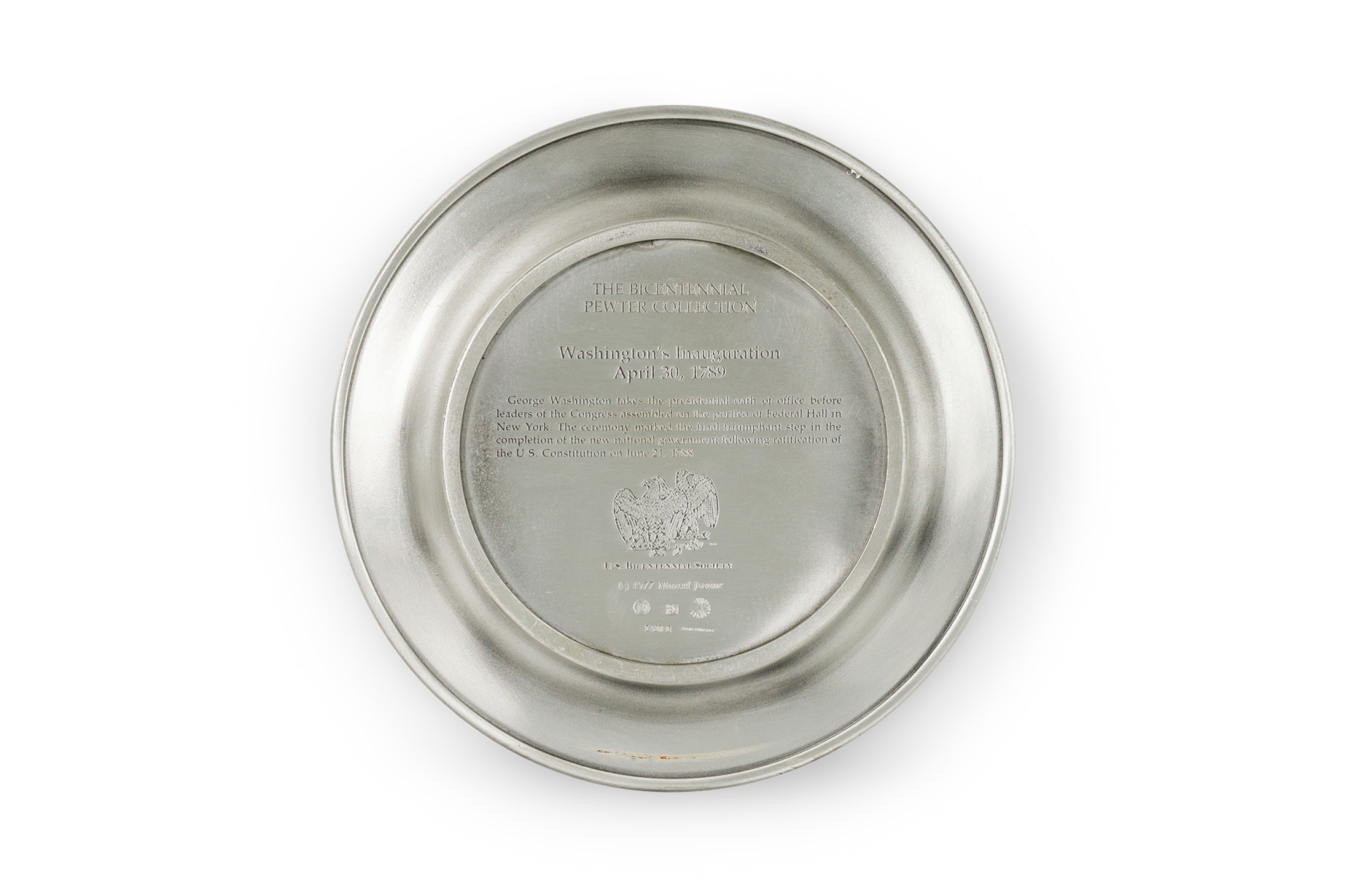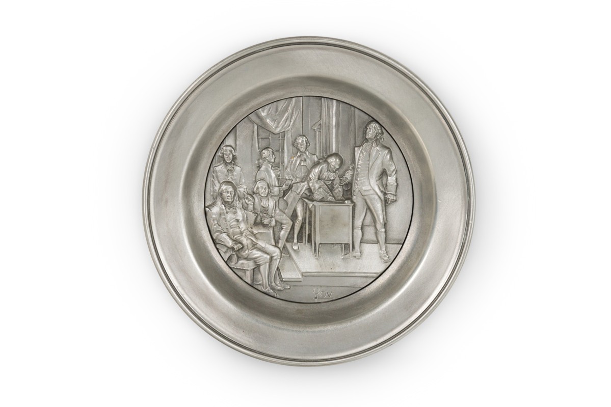 10 American American Mid-Century pewter Bicentennial plates of historical moments each having a different scene in relief (PRICED EACH
