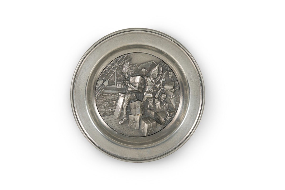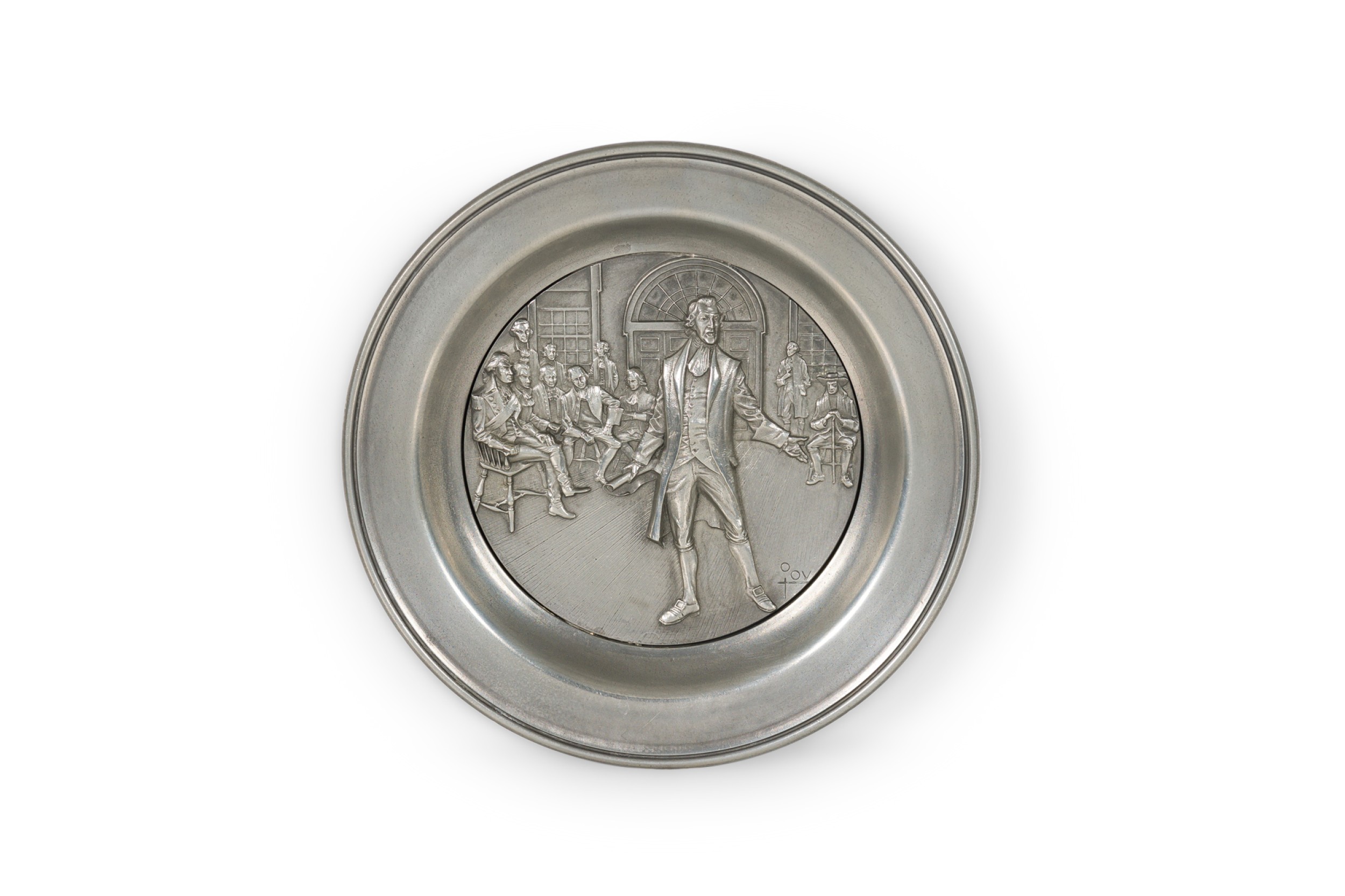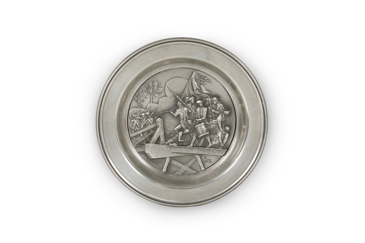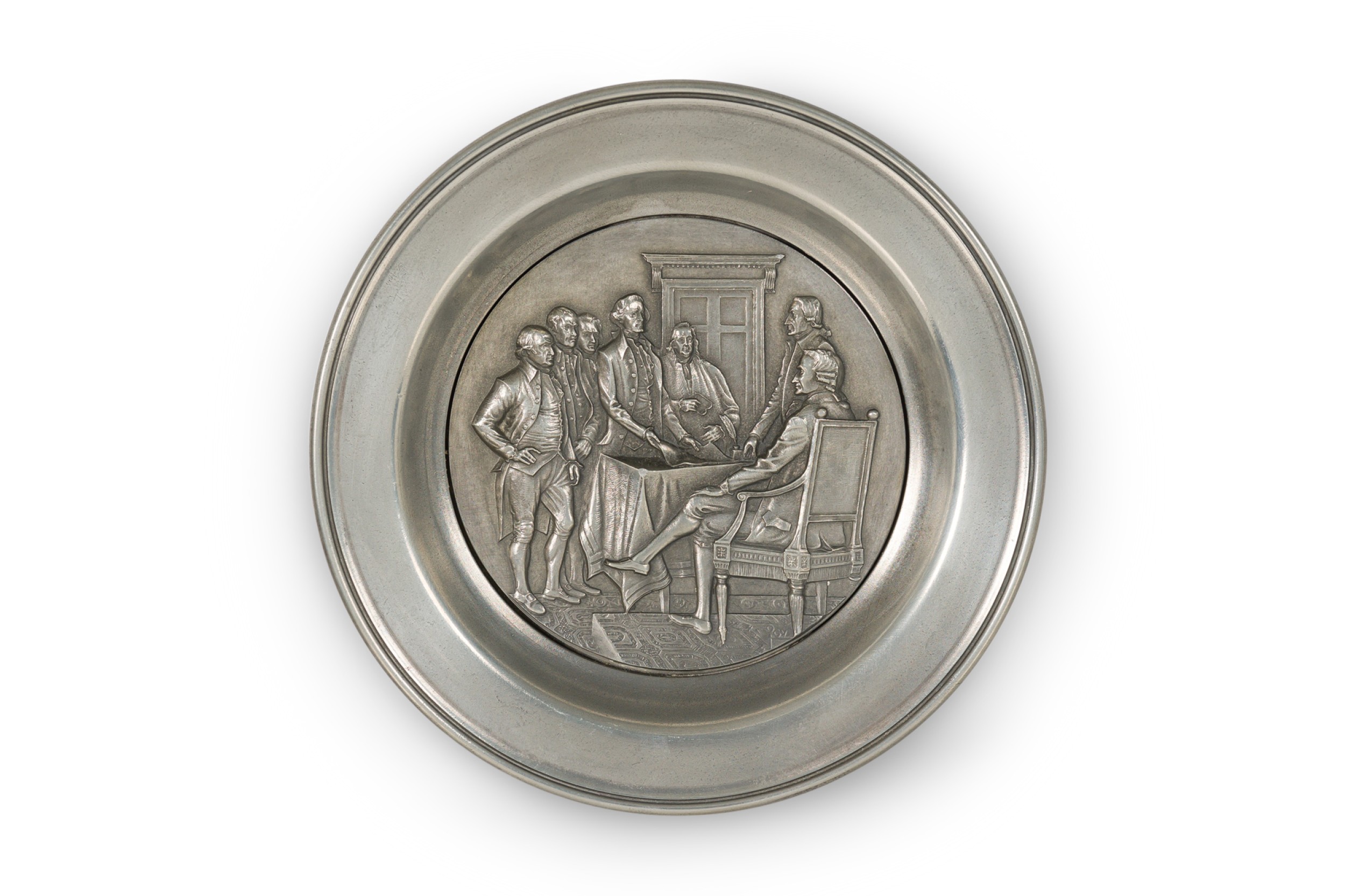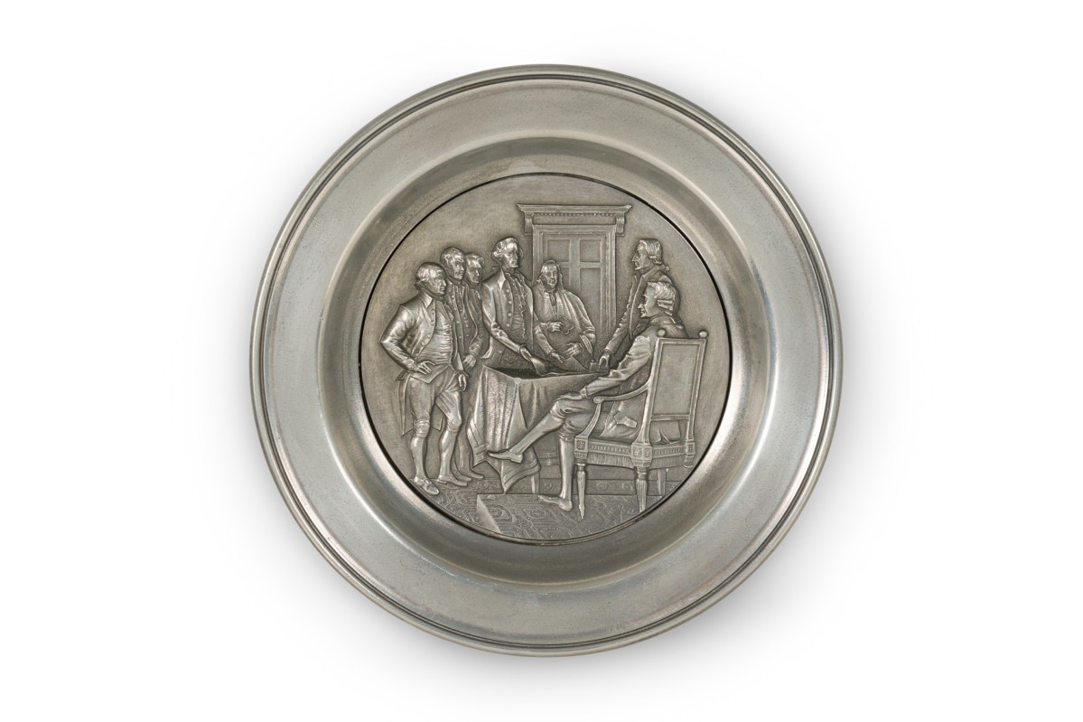 10 American American Mid-Century pewter Bicentennial plates of historical moments each having a different scene in relief (PRICED EACH