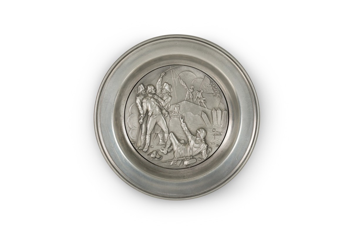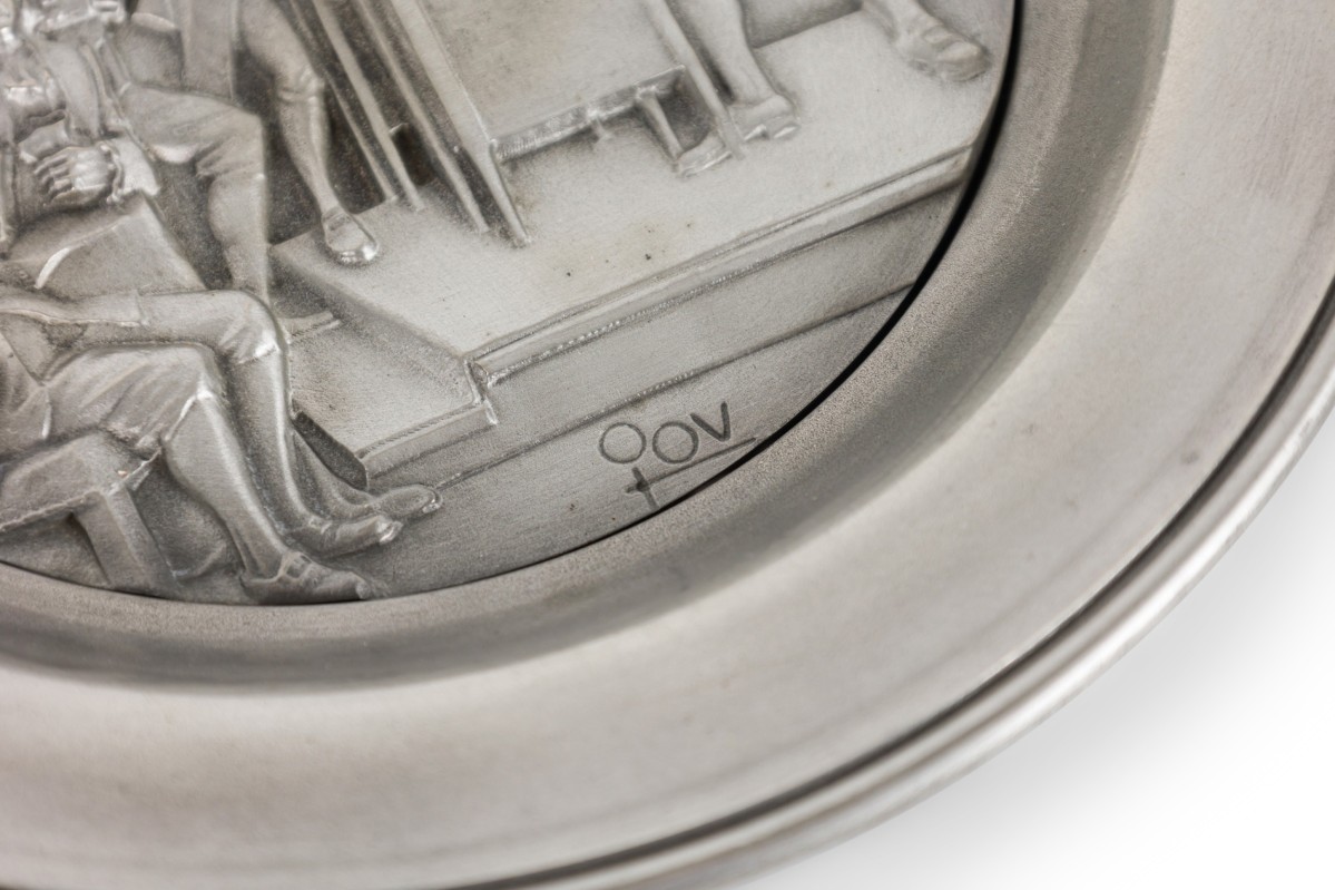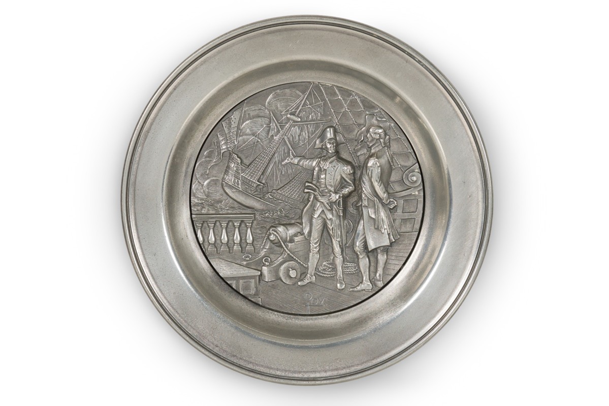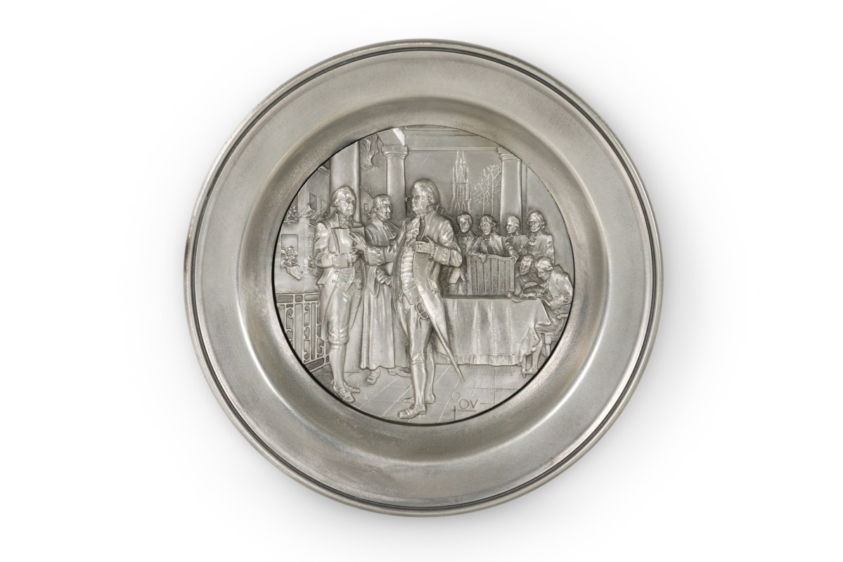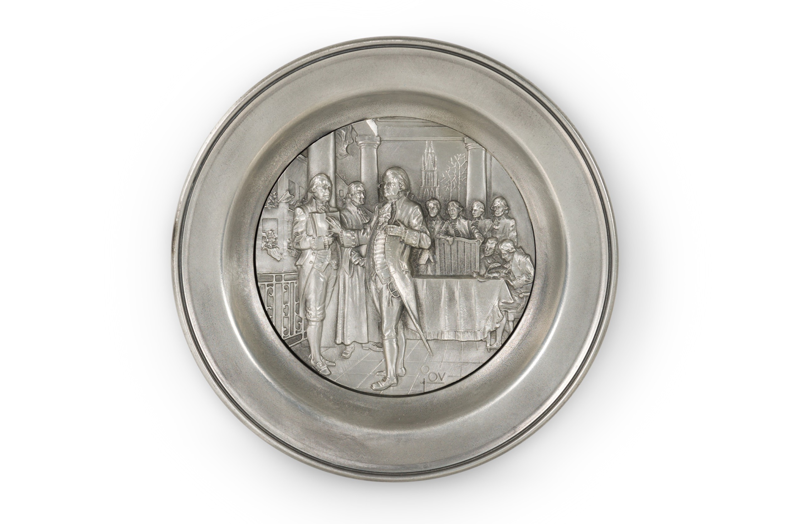10 American American Mid-Century pewter Bicentennial plates of historical moments each having a different scene in relief (PRICED EACH