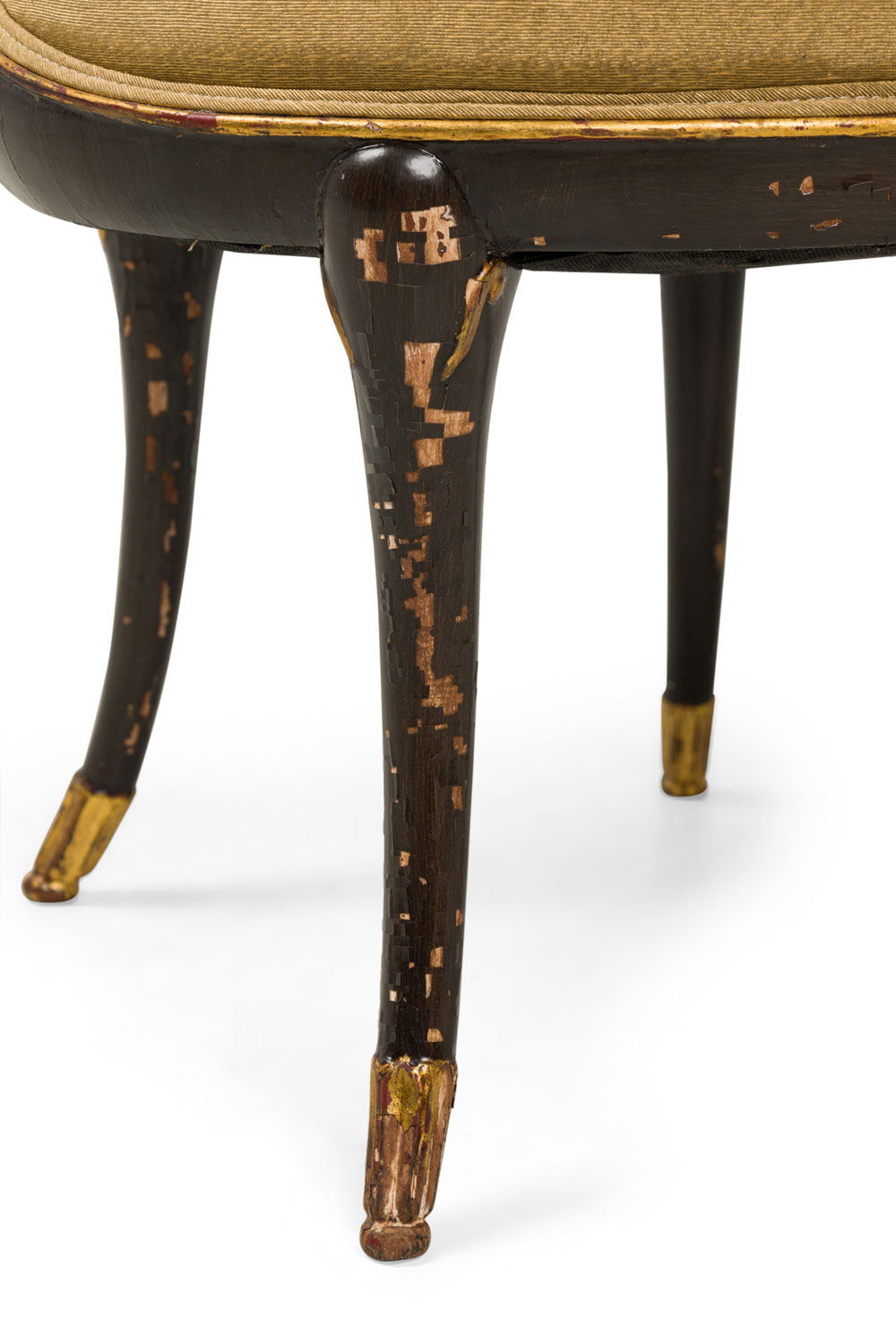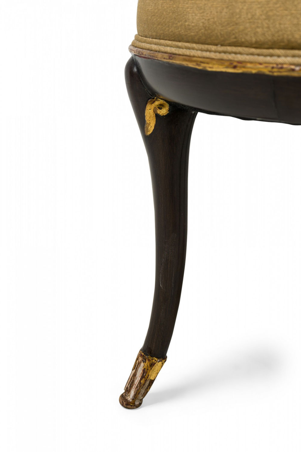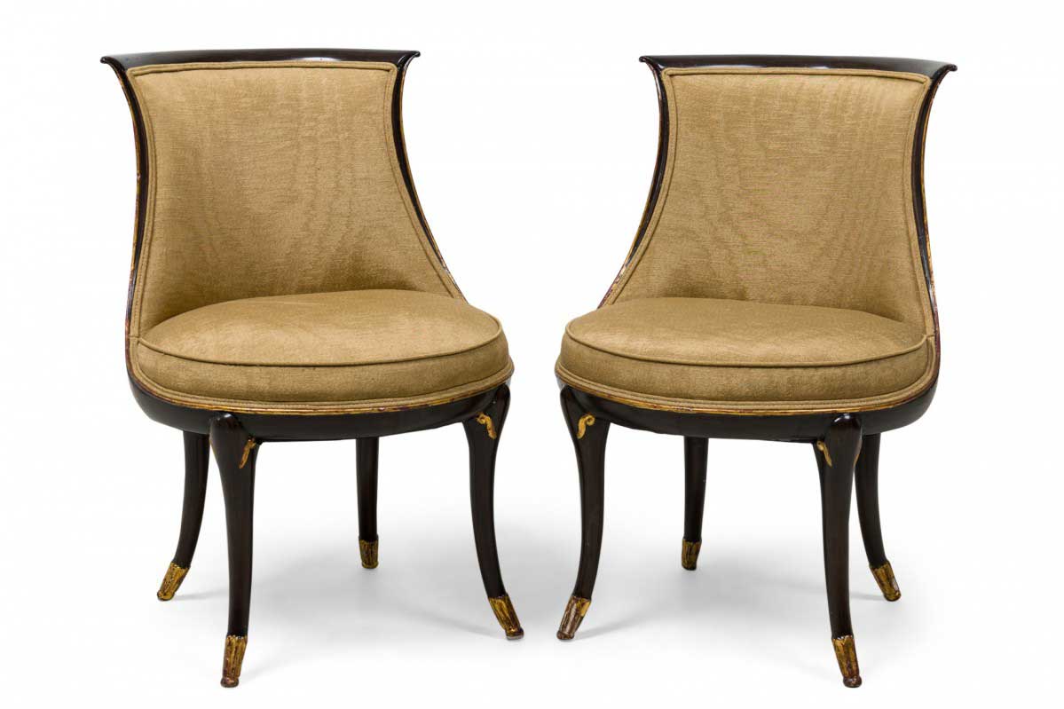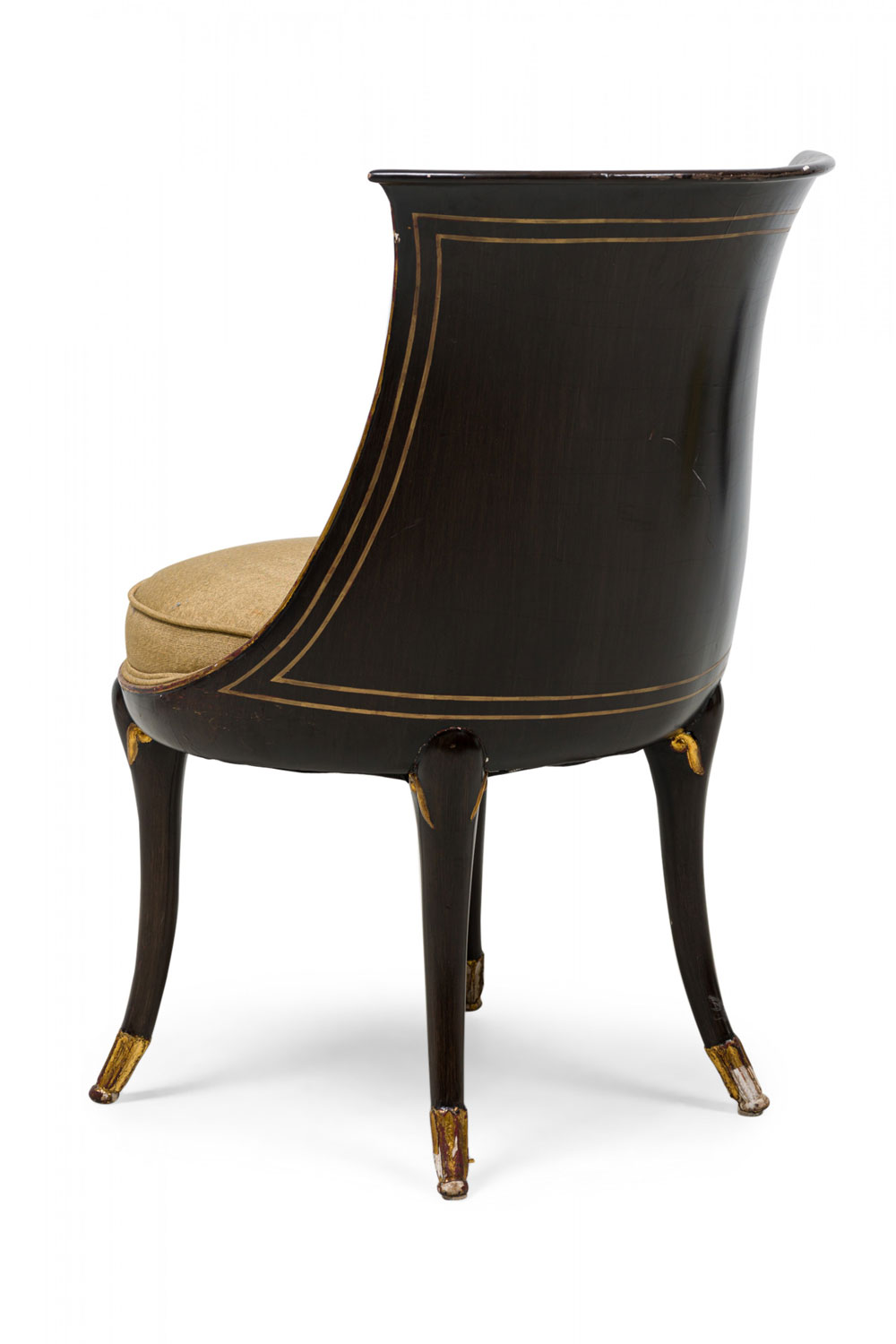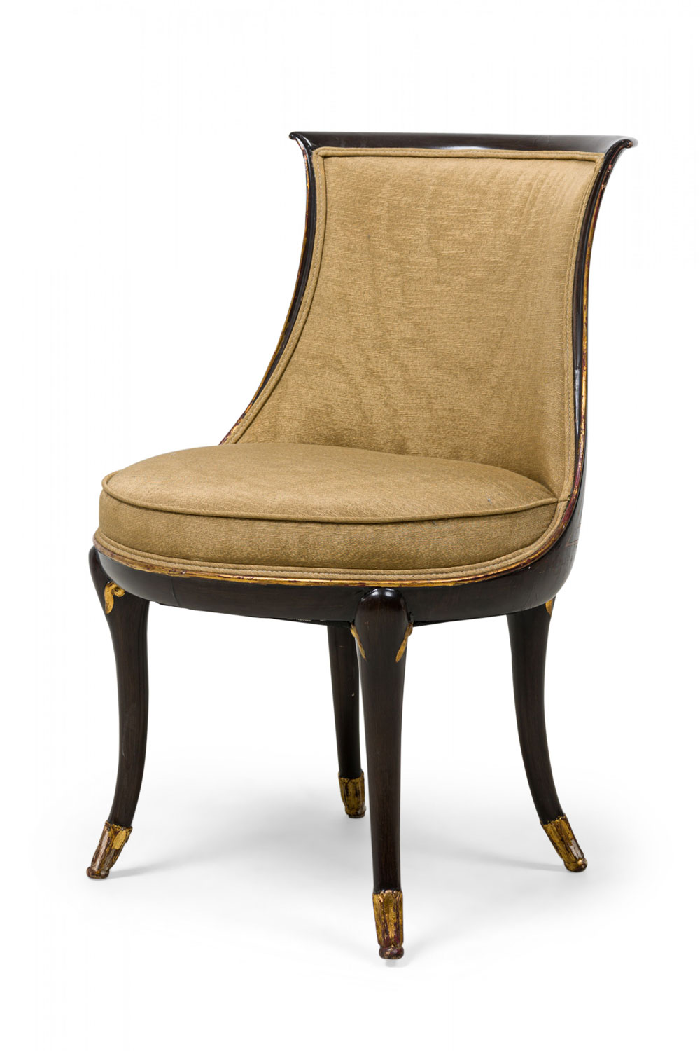 4 Mid-Century American walnut painted and parcel-gilt dining chairs with concave tapered backs inlaid with a parallel brass double border, upholstered in a beige and gold fabric, the splayed legs topped by decorative gilt-highlighted, carved embellishments, n gilt fluted and carved feet. (PRICED EACH)