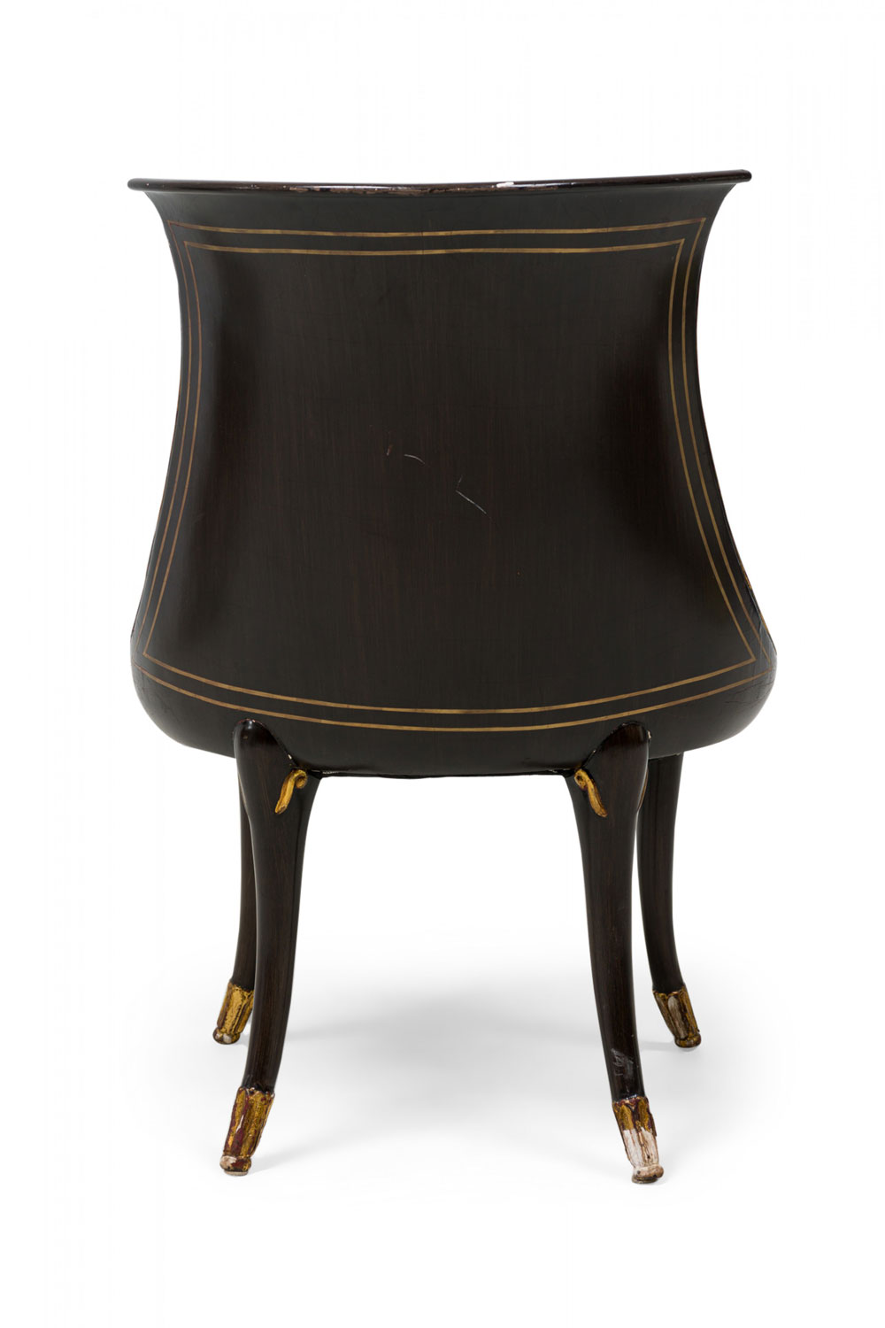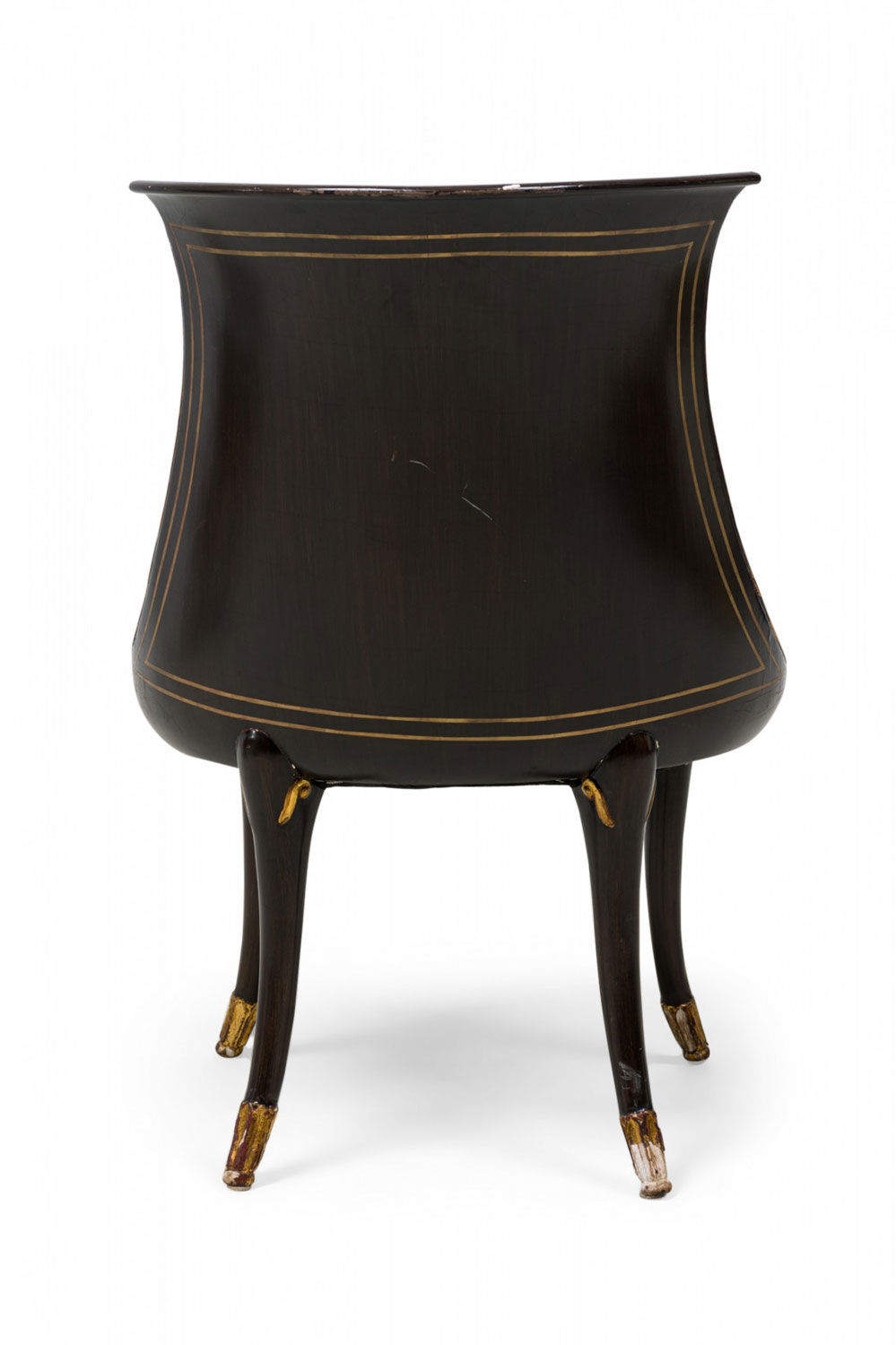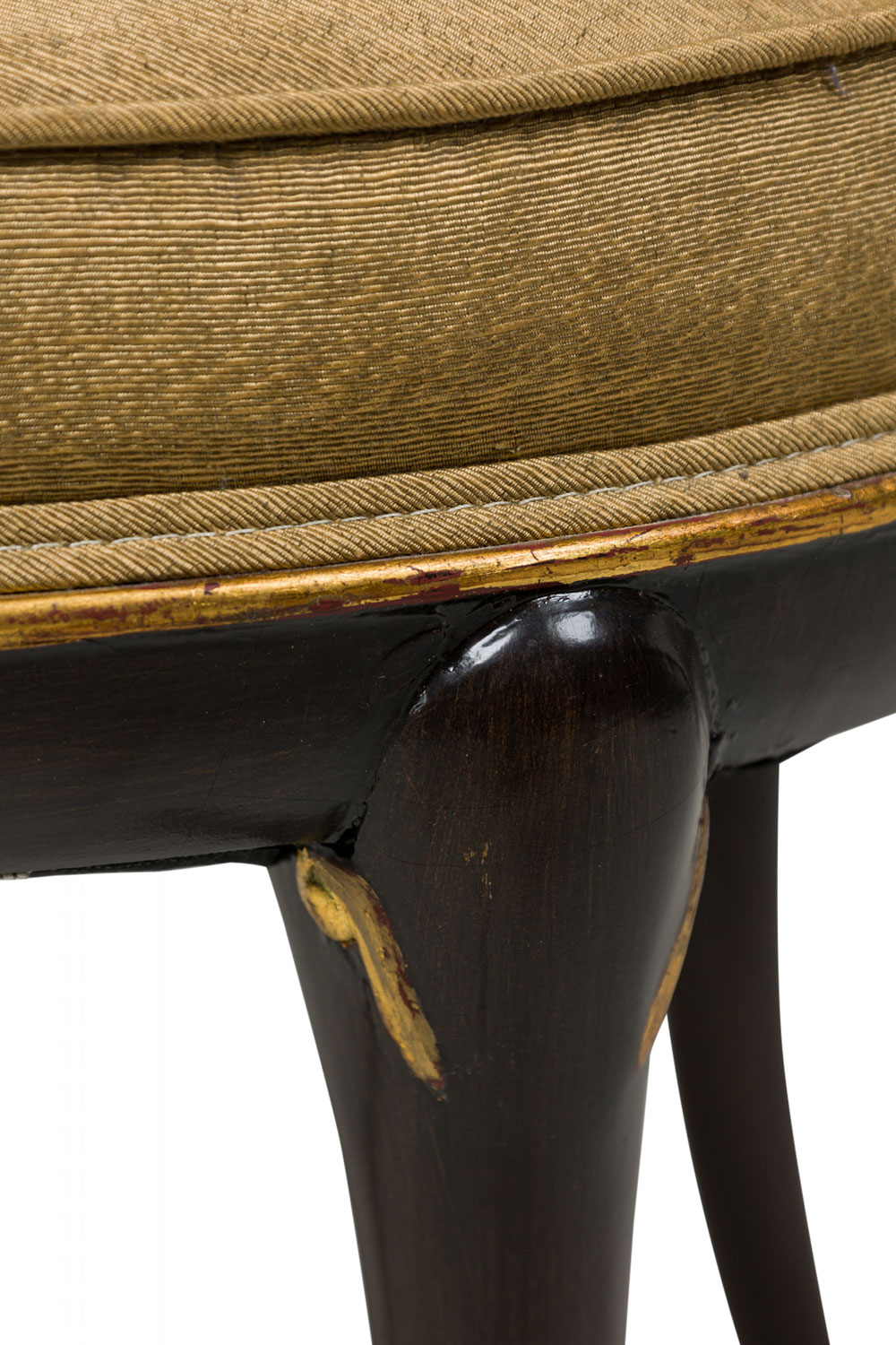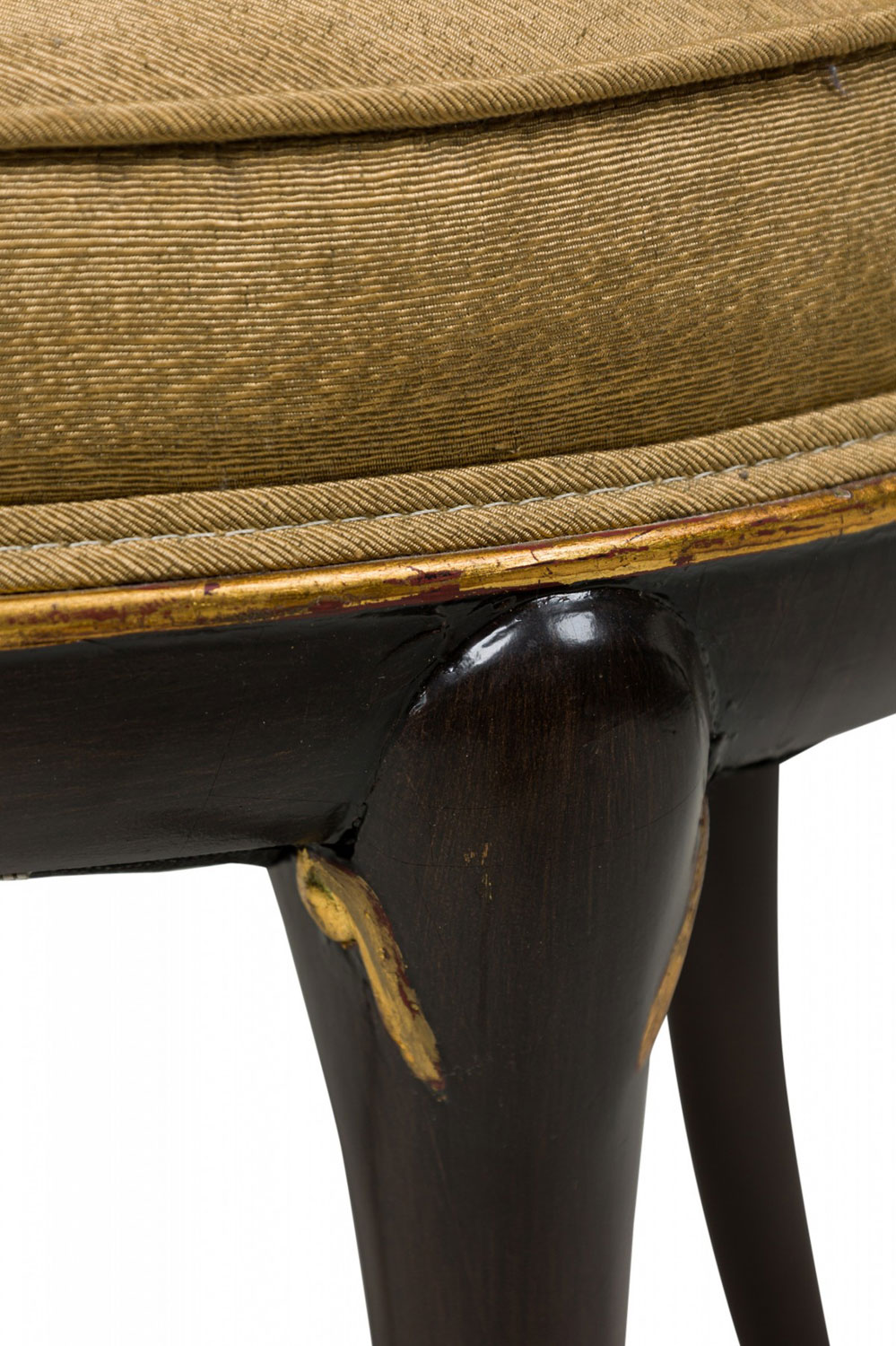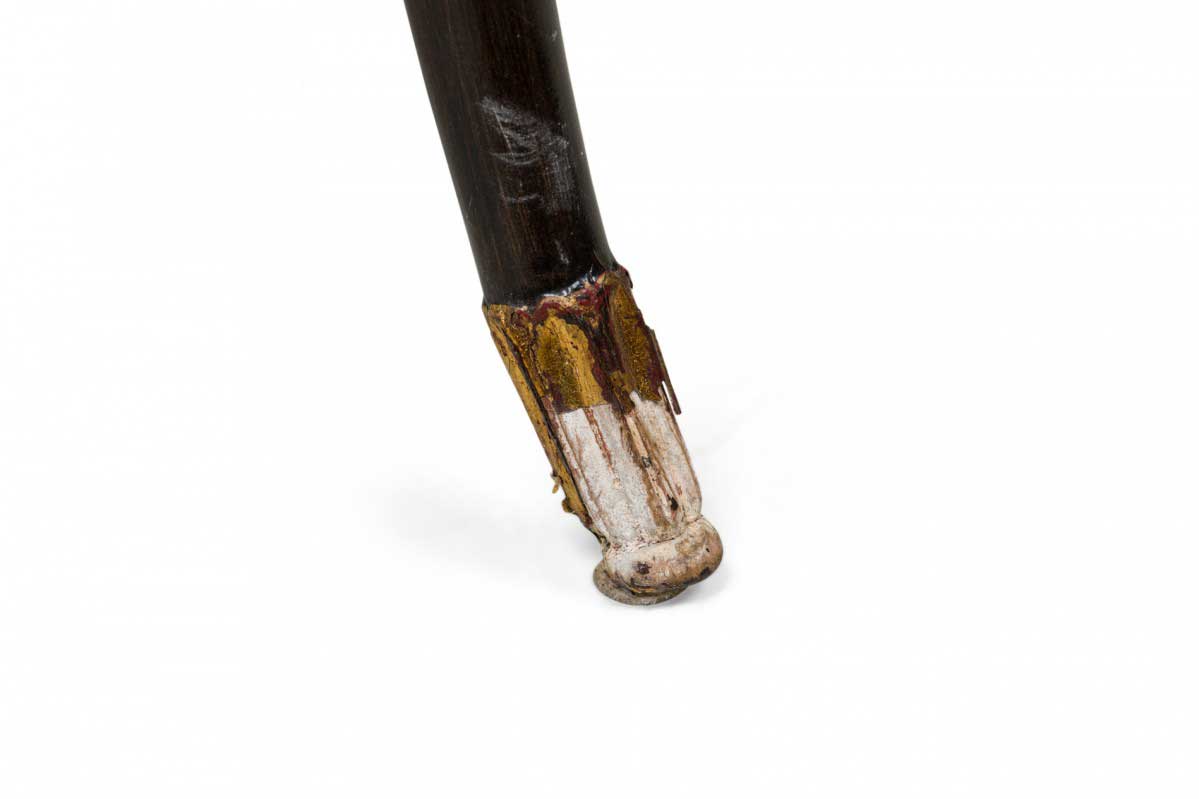 4 Mid-Century American walnut painted and parcel-gilt dining chairs with concave tapered backs inlaid with a parallel brass double border, upholstered in a beige and gold fabric, the splayed legs topped by decorative gilt-highlighted, carved embellishments, n gilt fluted and carved feet. (PRICED EACH)