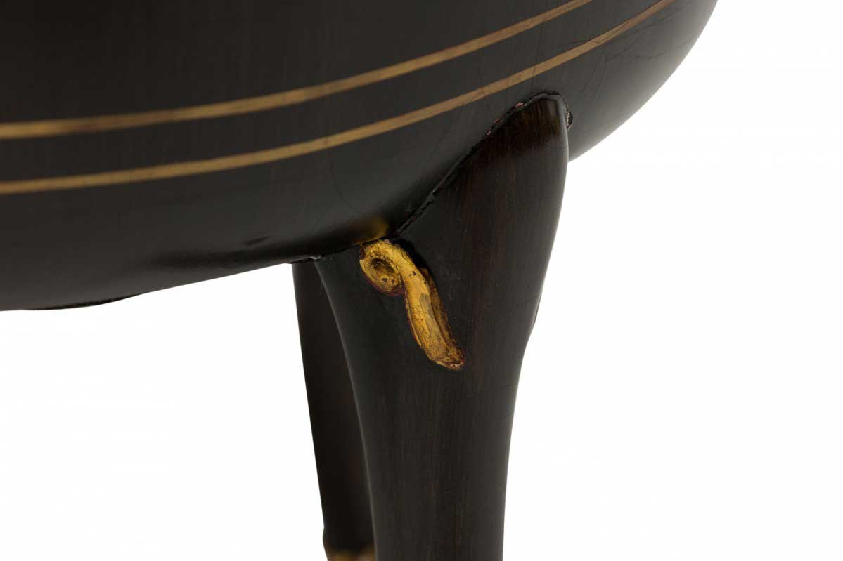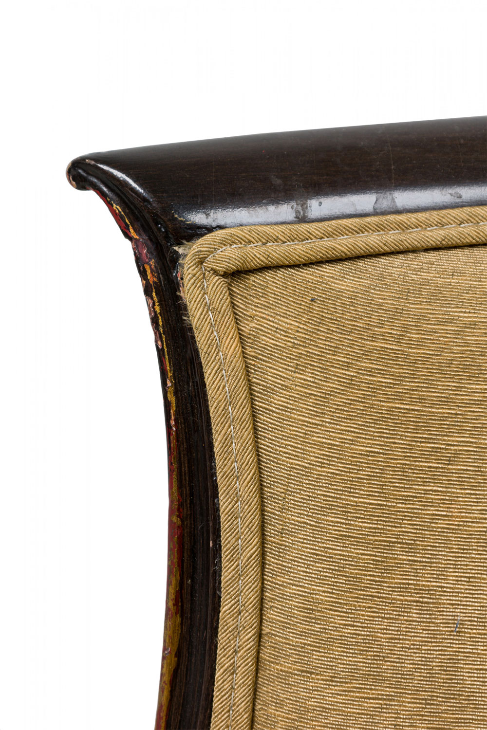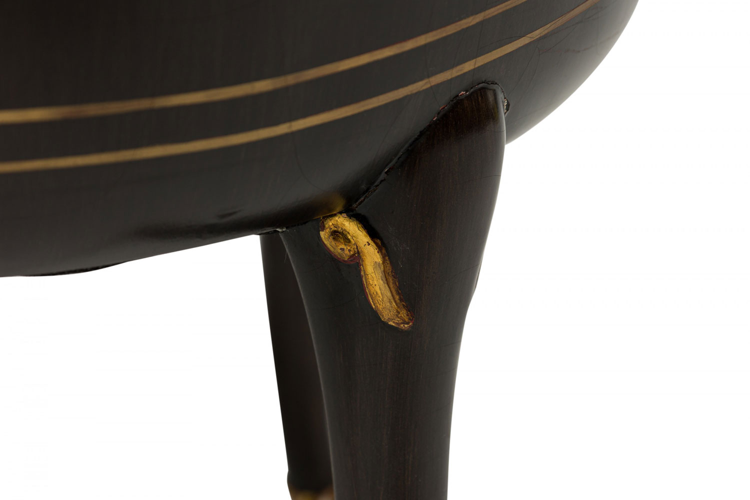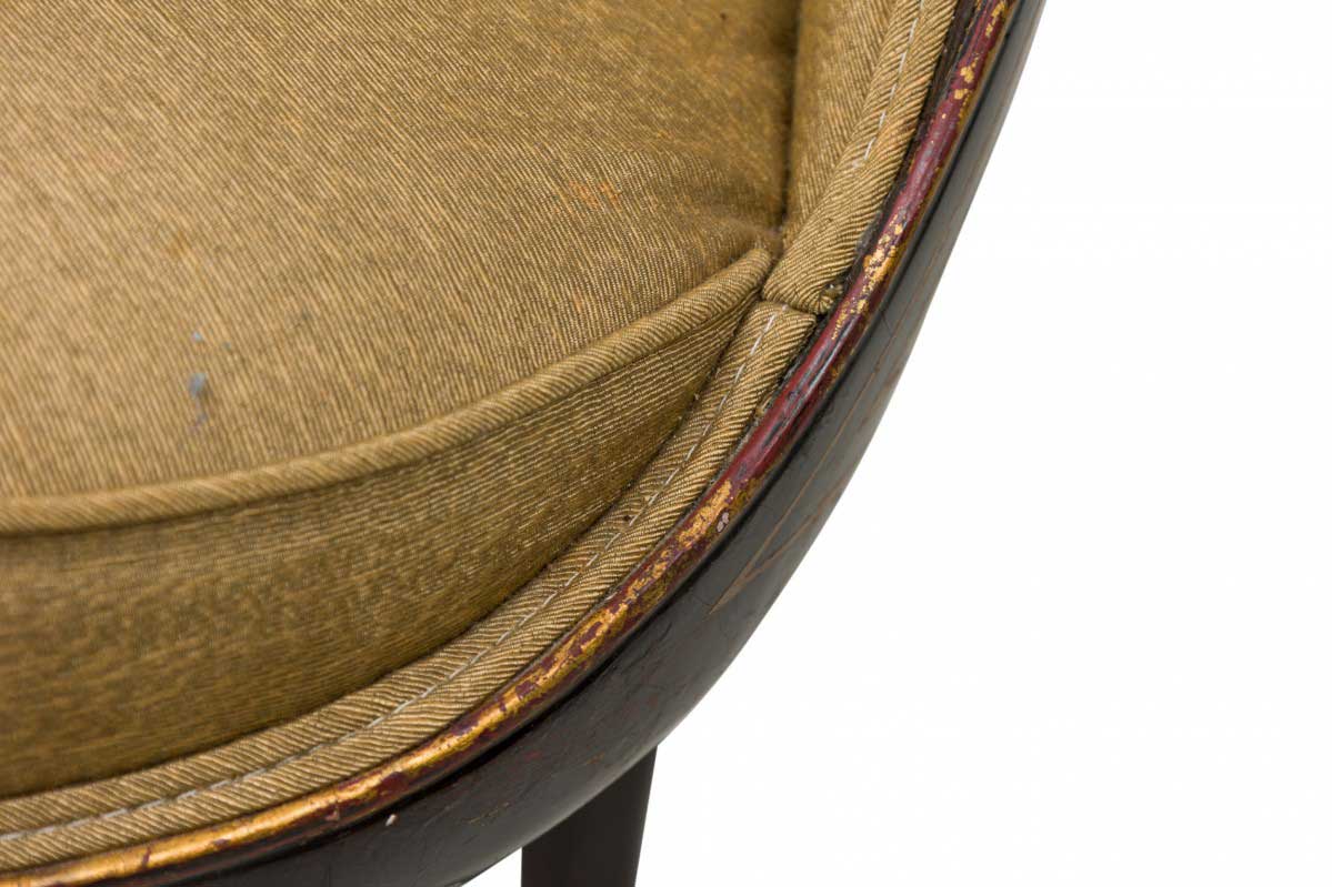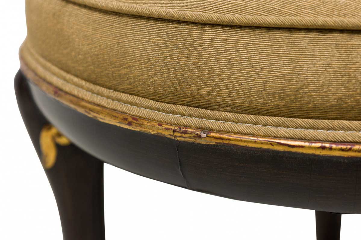 4 Mid-Century American walnut painted and parcel-gilt dining chairs with concave tapered backs inlaid with a parallel brass double border, upholstered in a beige and gold fabric, the splayed legs topped by decorative gilt-highlighted, carved embellishments, n gilt fluted and carved feet. (PRICED EACH)