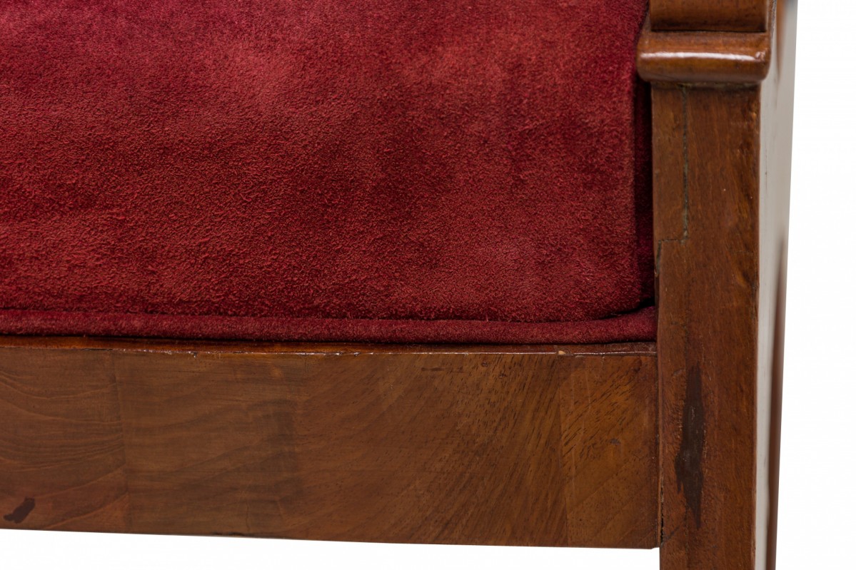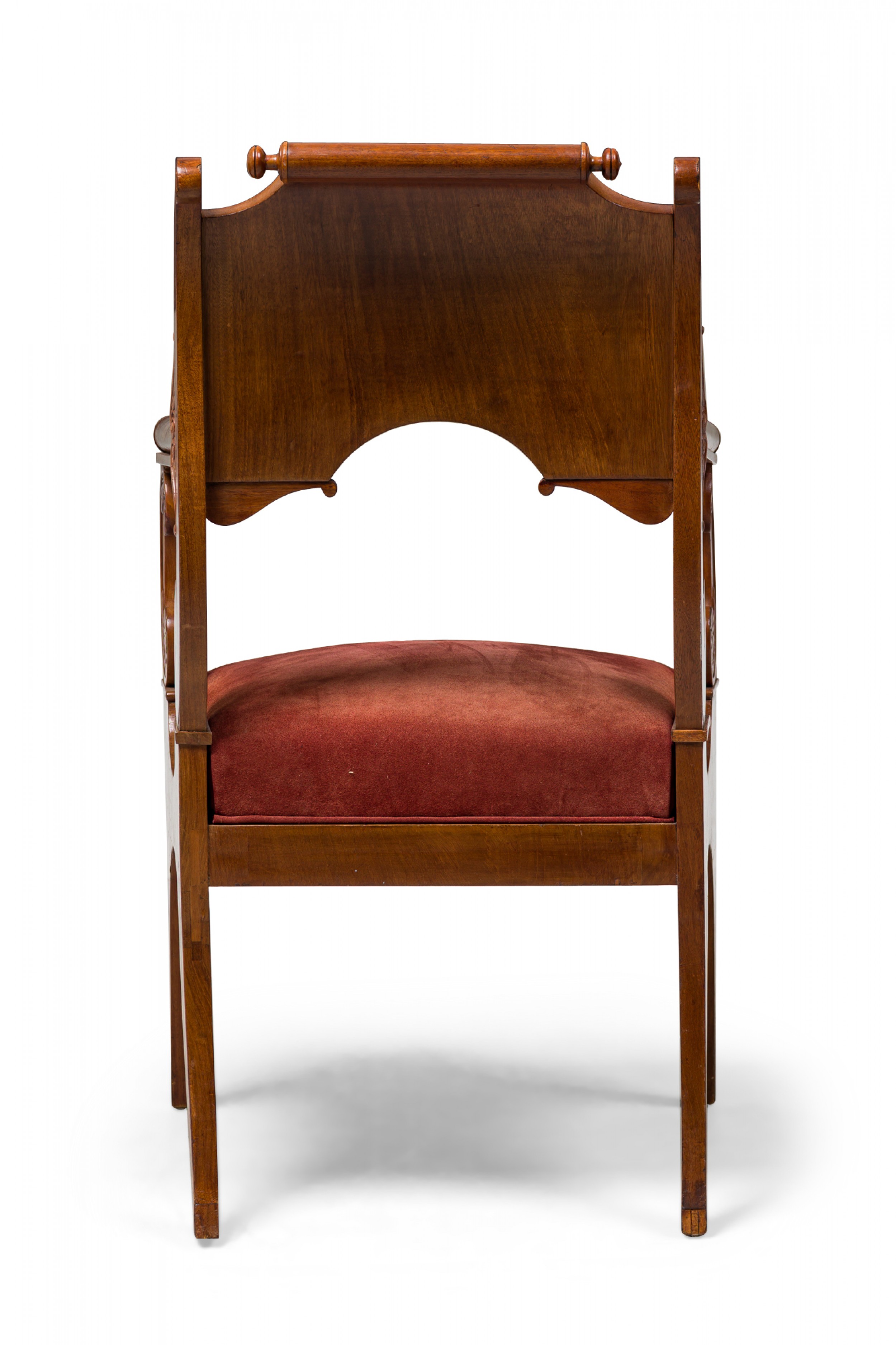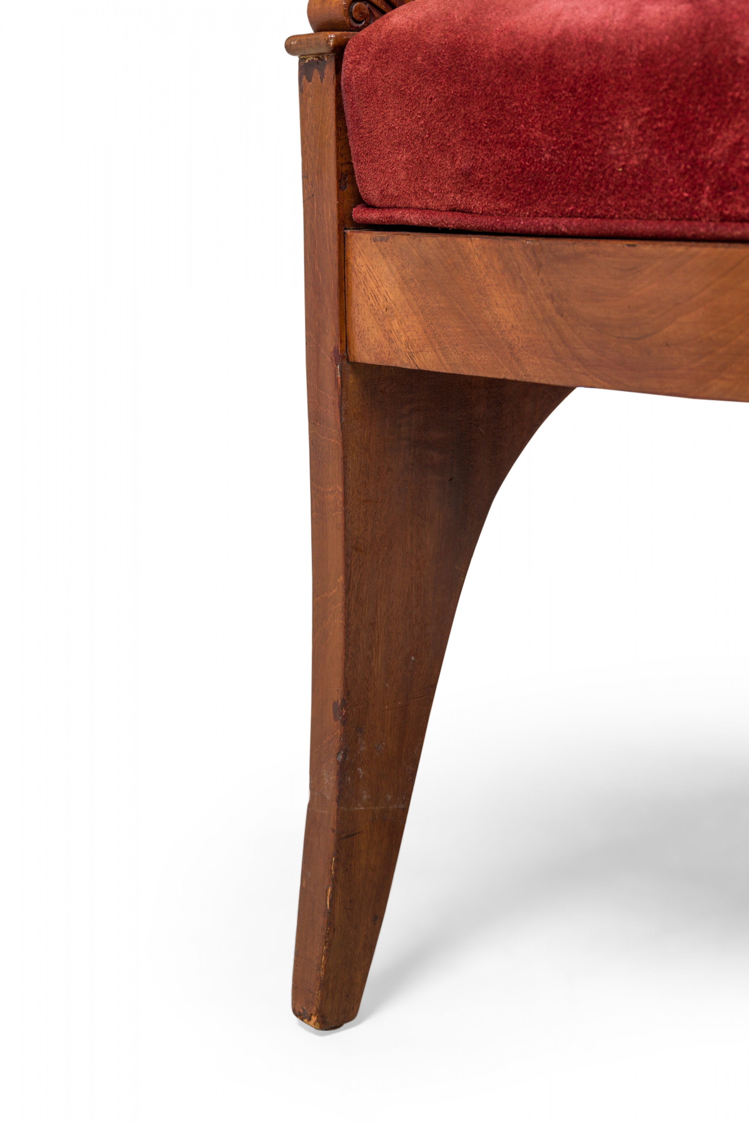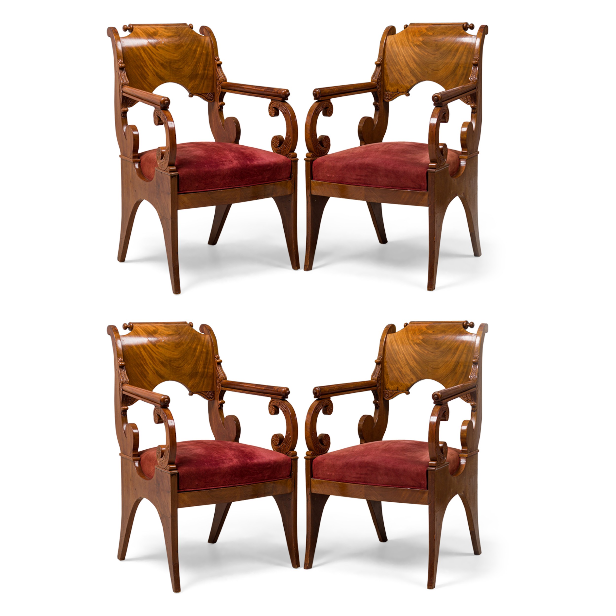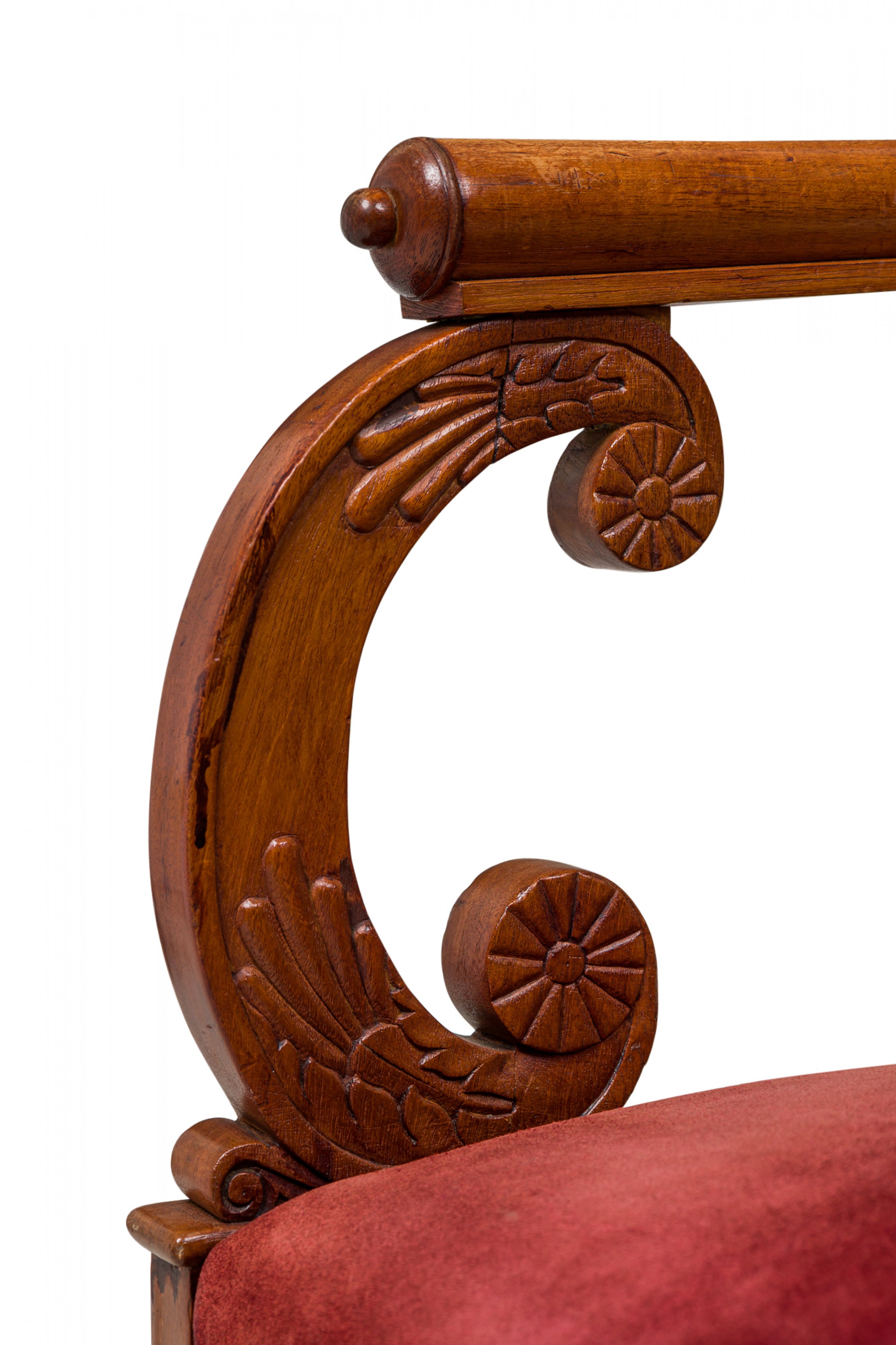 4 Russian Neo-Classic Mahogany Scroll Form Red Upholstered Armchairs