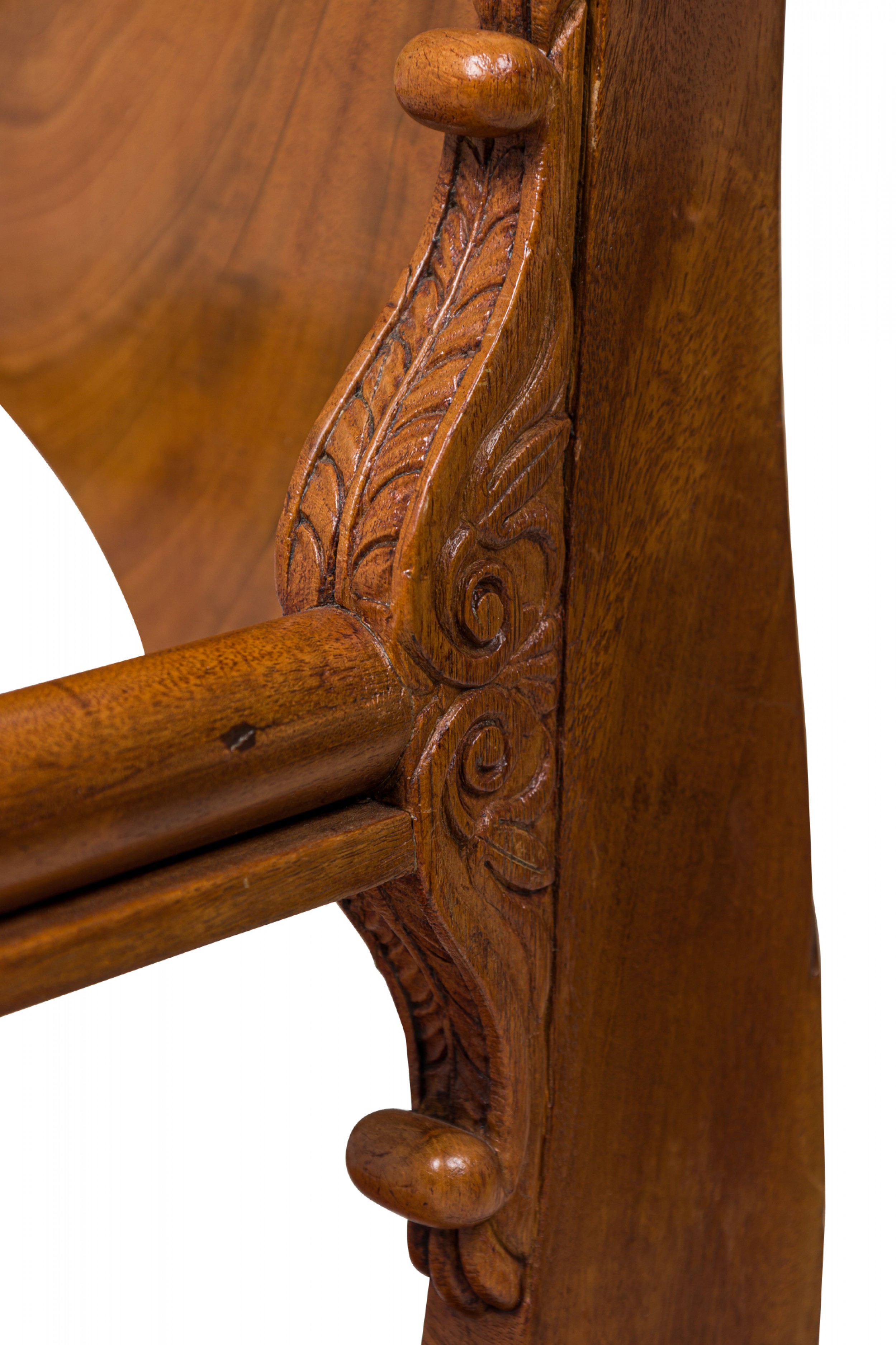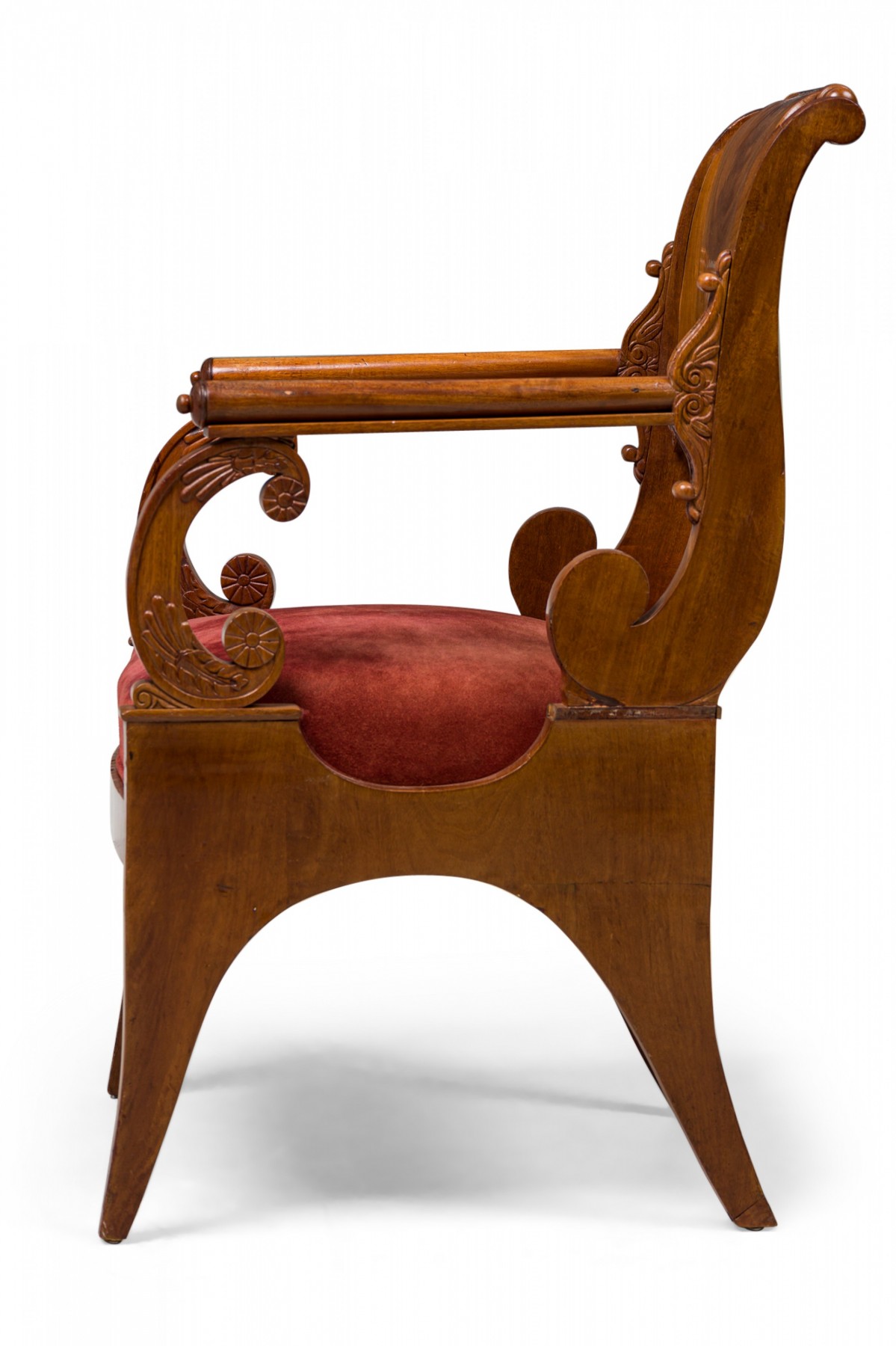 4 Russian Neo-Classic mahogany armchairs in elaborate scroll form with a curved upper backrest and arms, carved acanthus decoration with reeding and floral medallions, and red suede upholstered seats and cut out arched legs. (PRICED EACH)