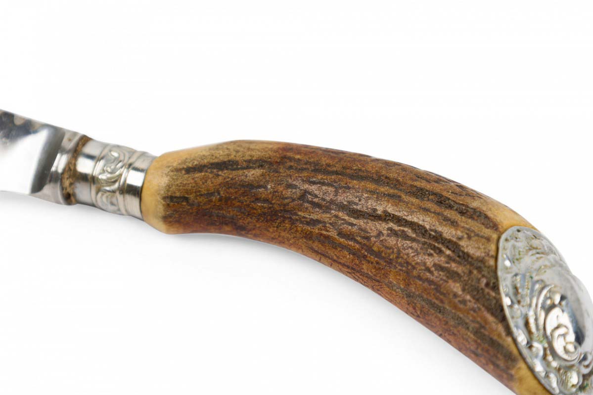 SET of 6 English Rustic style steak knives with curved serrated stainless steel blades mounted in antler handles with pressed metal decorative end caps. (PRICED AS SET)