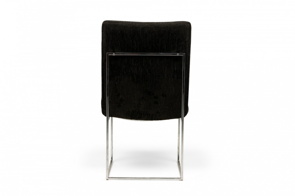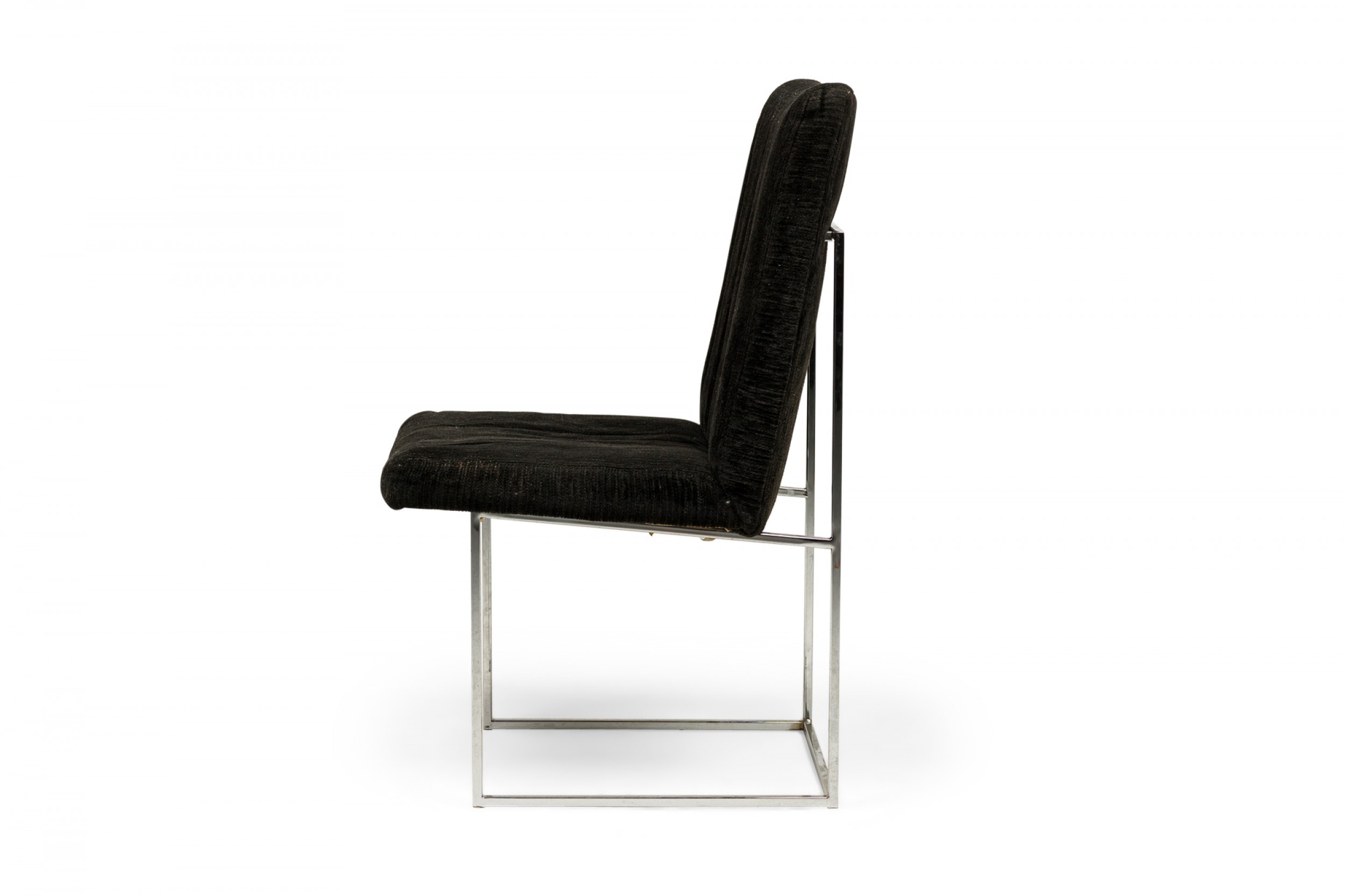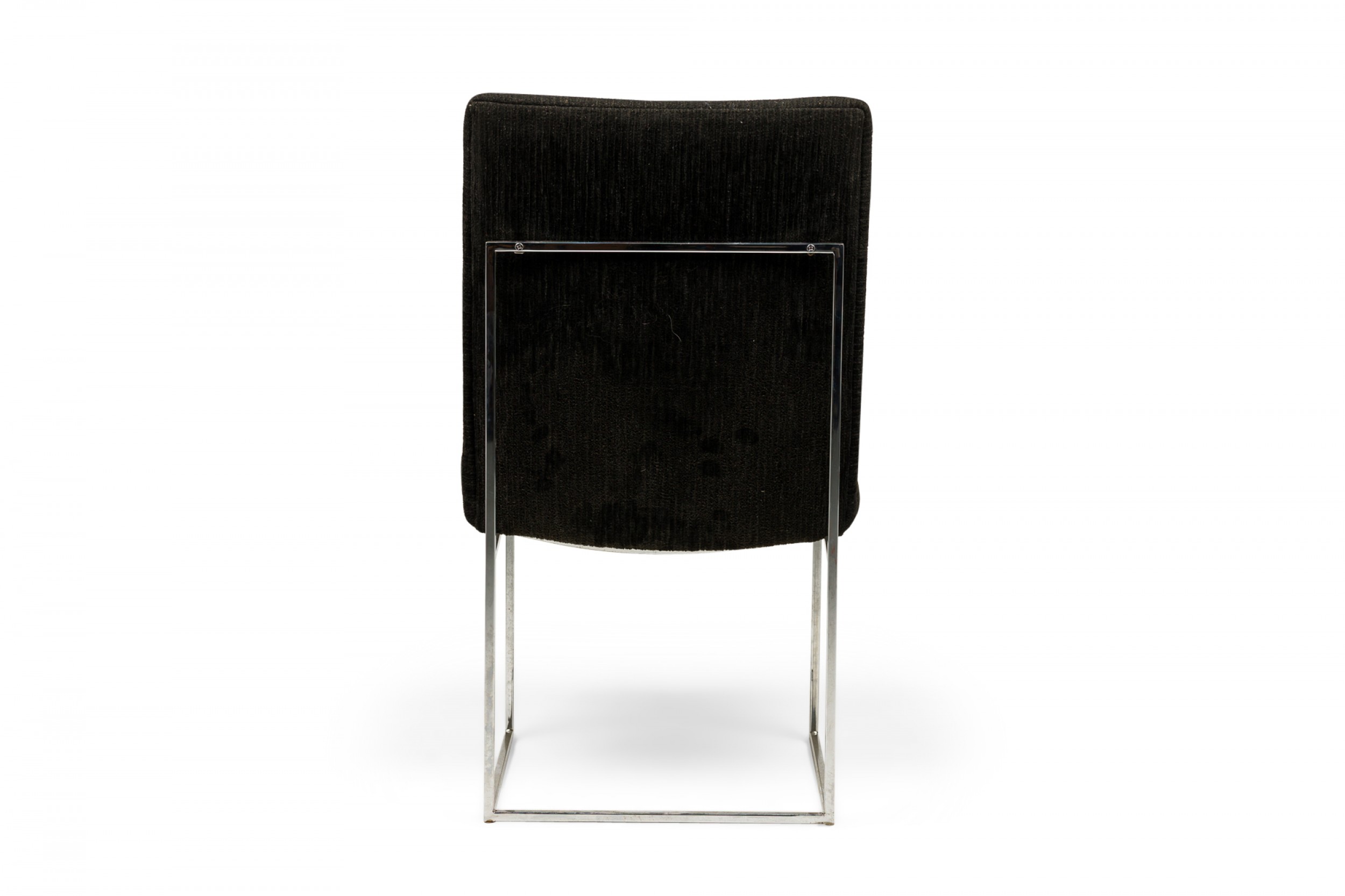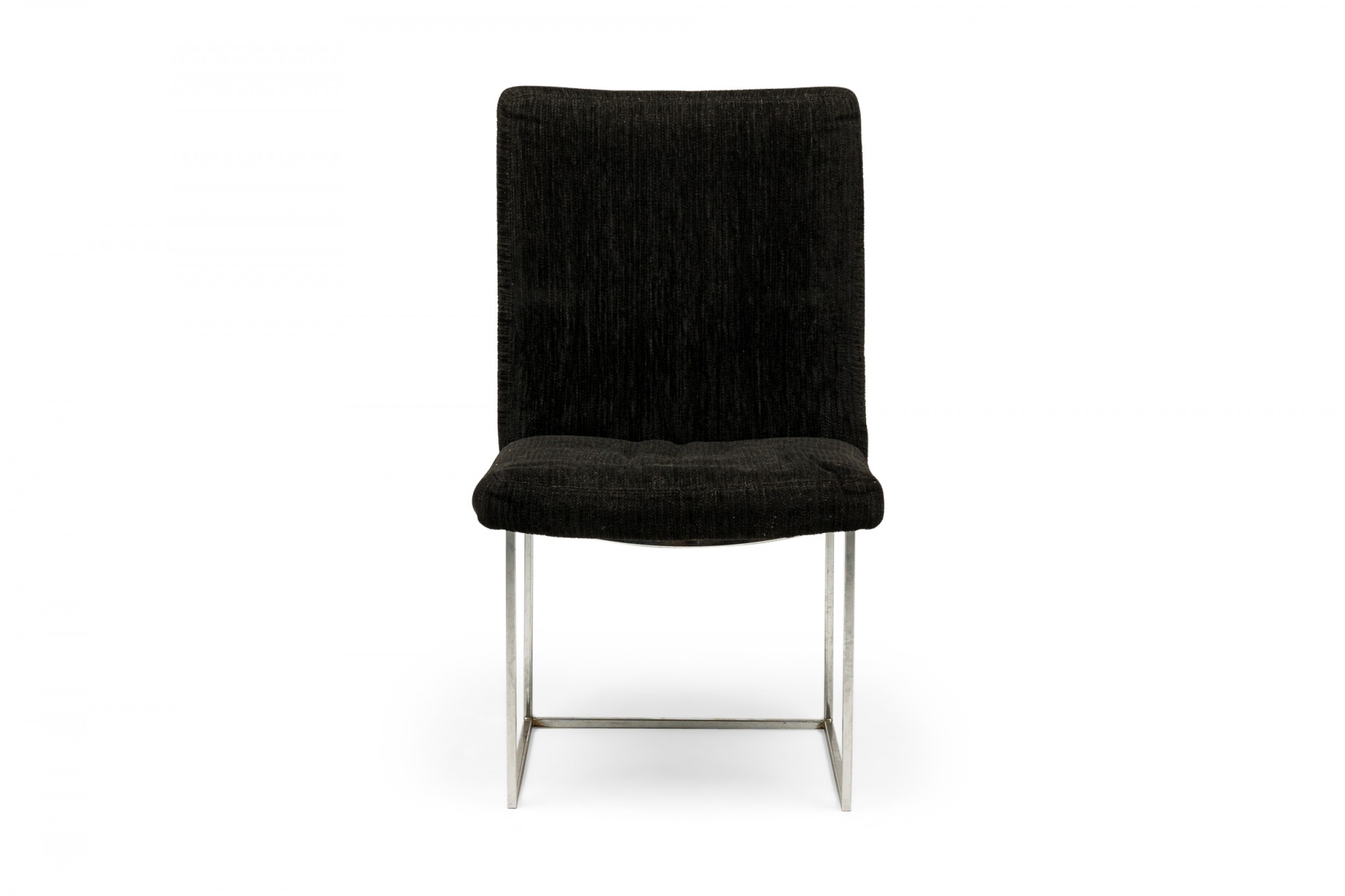 6 American Mid-Century 'Captain' dining side chairs with silver metal square tube frames and black chenille fabric upholstery with a textural line pattern. (PRICED EACH)(Other examples in different upholstery: DUF0798-DUF0801)