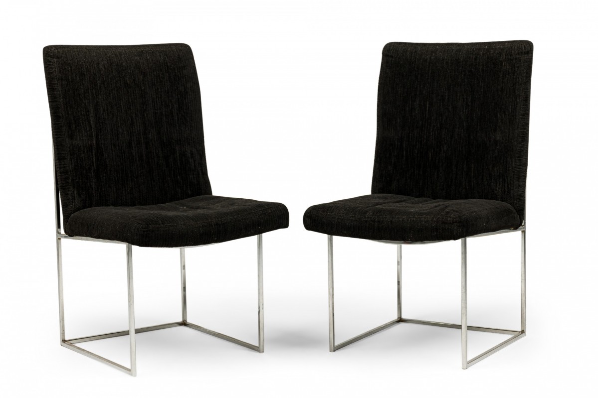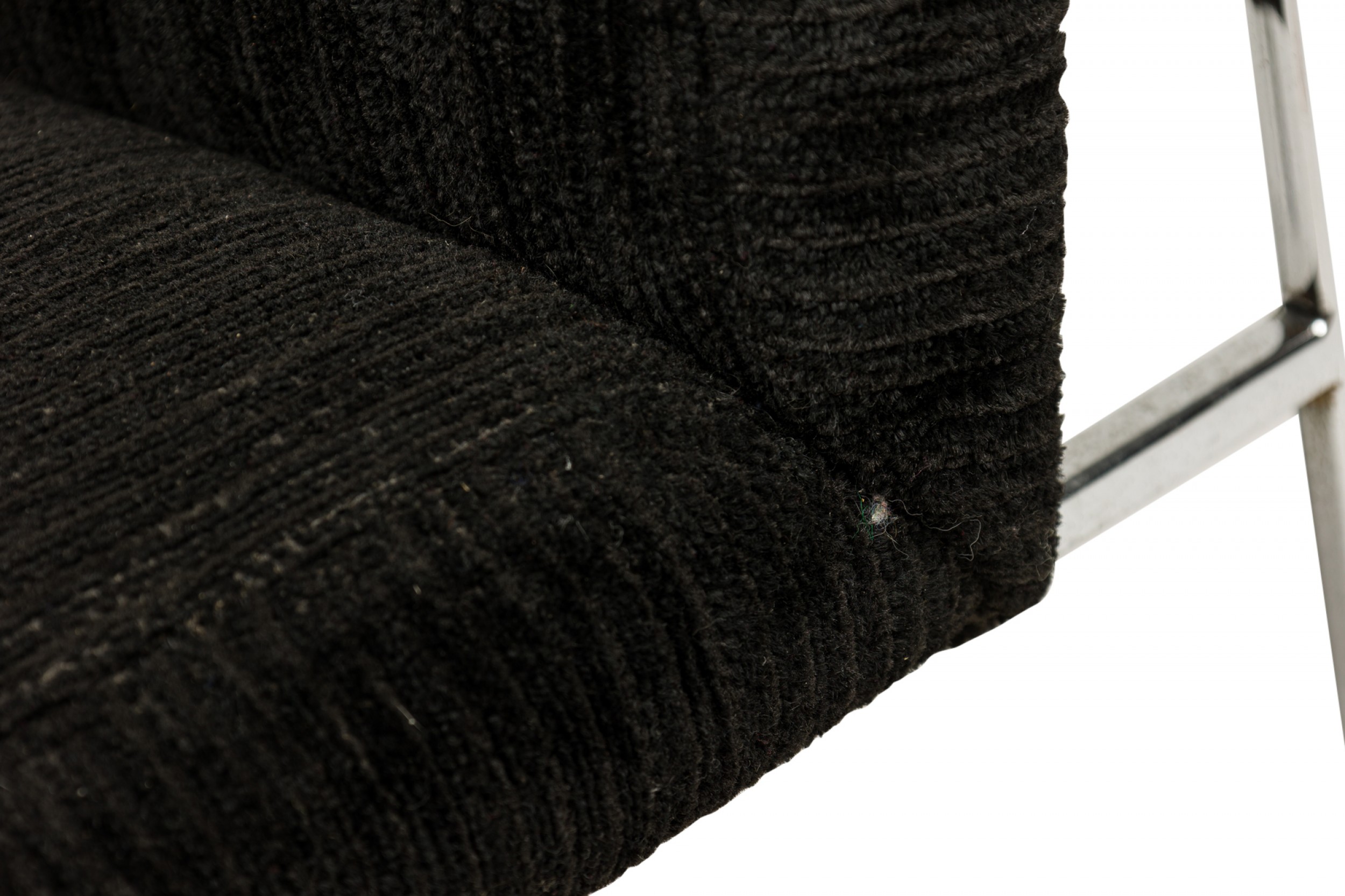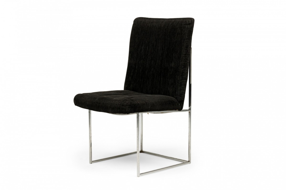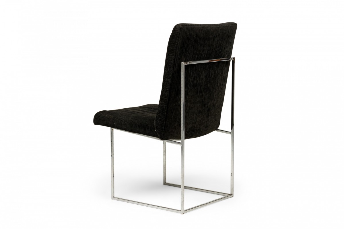 6 American Mid-Century 'Captain' dining side chairs with silver metal square tube frames and black chenille fabric upholstery with a textural line pattern. (PRICED EACH)(Other examples in different upholstery: DUF0798-DUF0801)