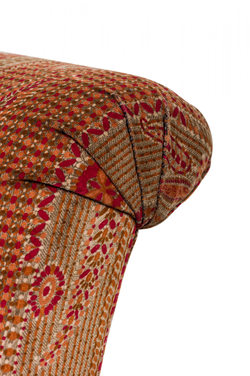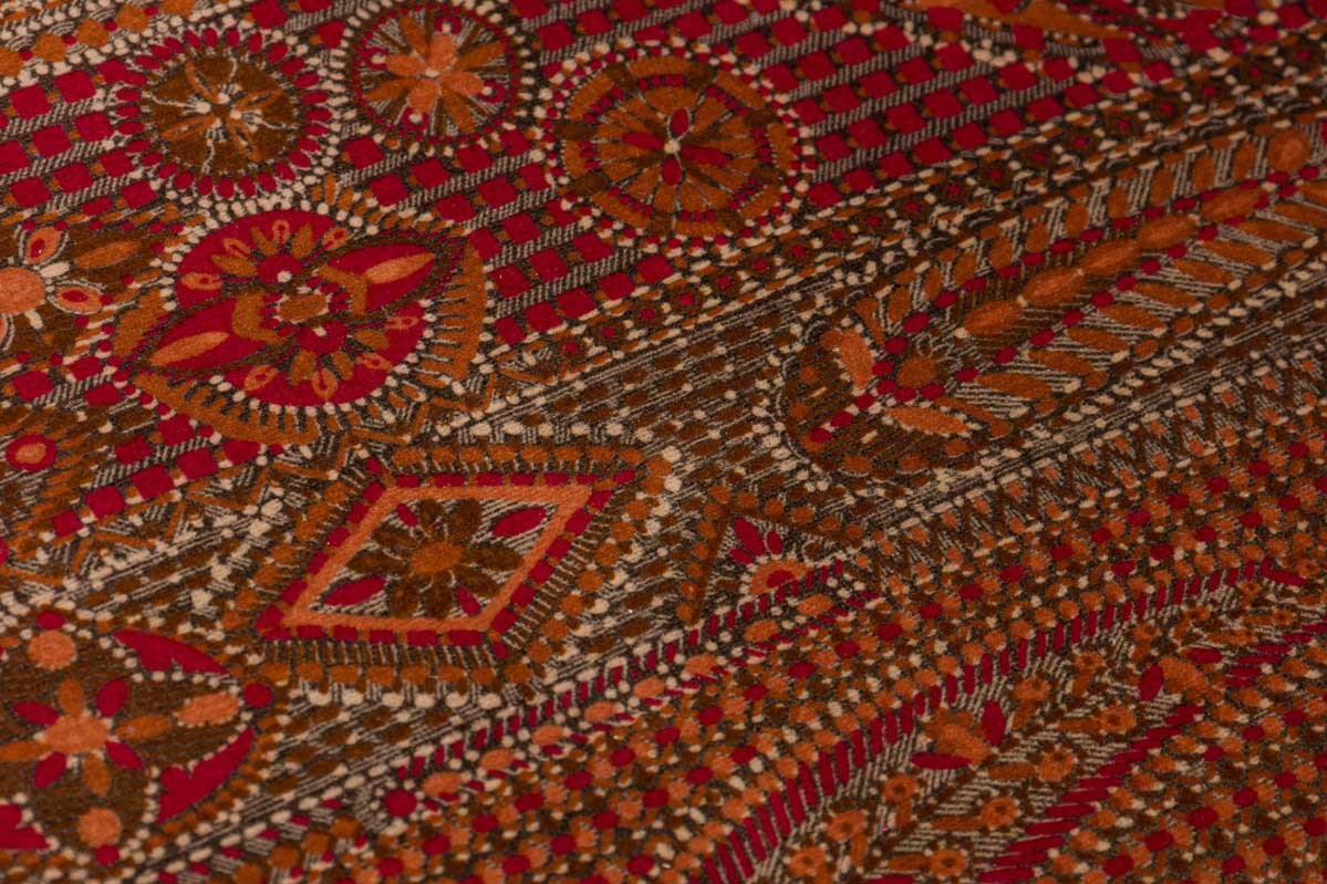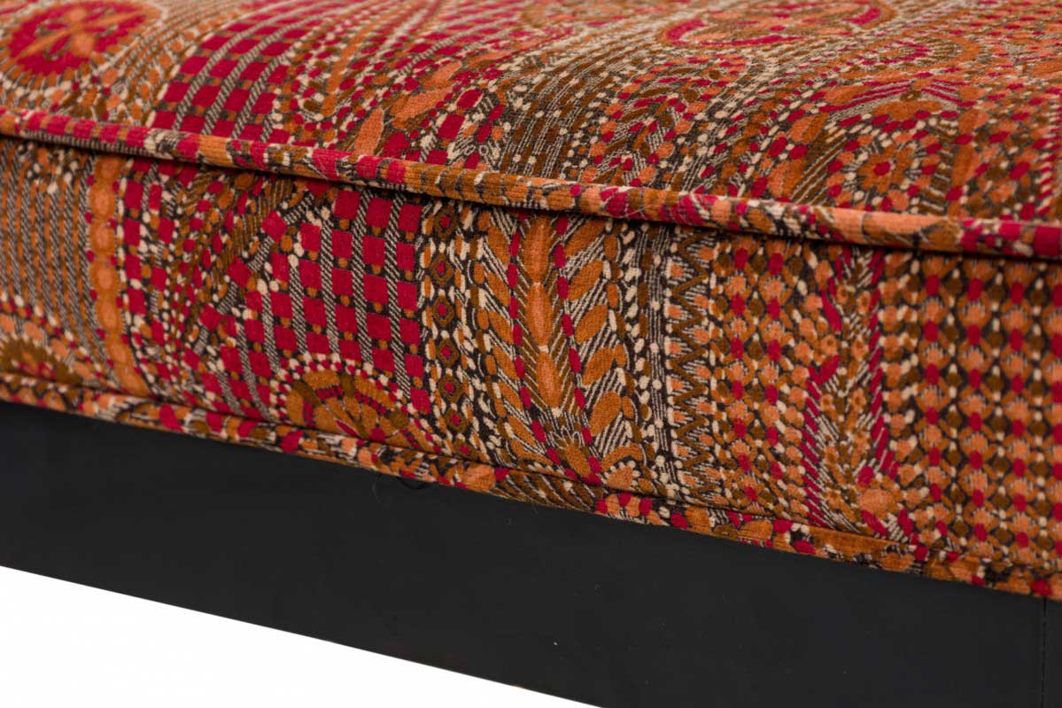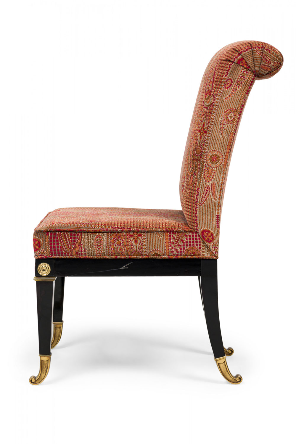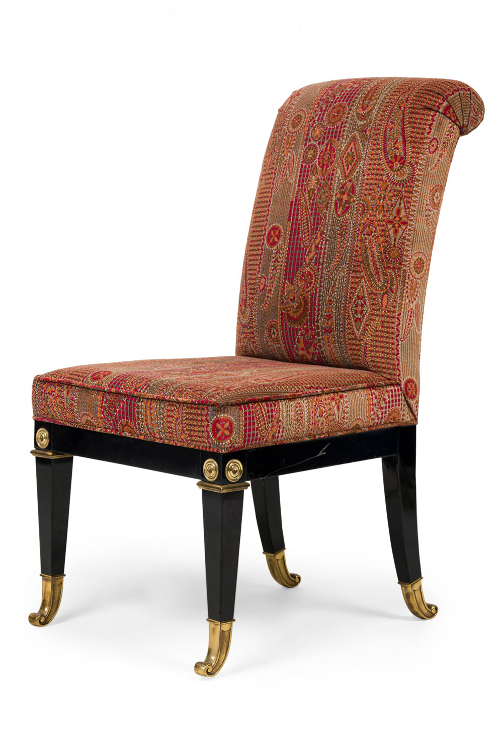 6 Russian Neo-Classic-style dining side chairs with tall rectangular backs with scroll curved back rails, and black lacquered wooden frames mounted with decorative polished bronze medallions and sabots, upholstered in a textured and patterned red, orange, and green fabric. (PRICED EACH)(Part of set: REG4042, matching armchairs: REG4042A)