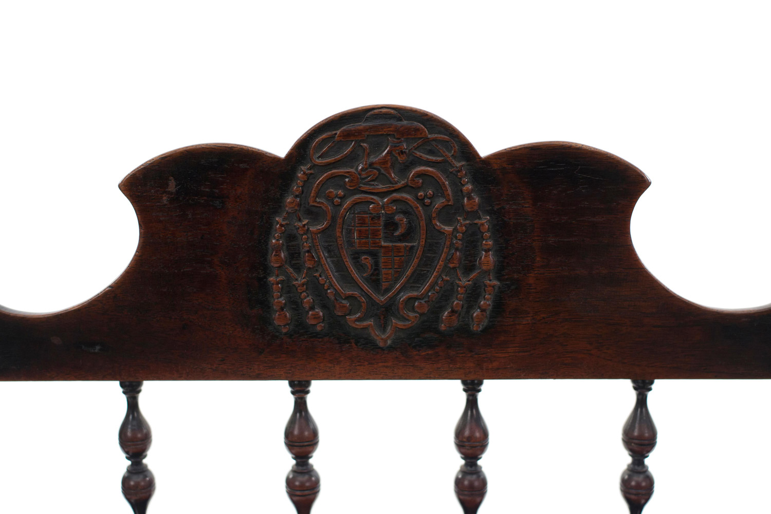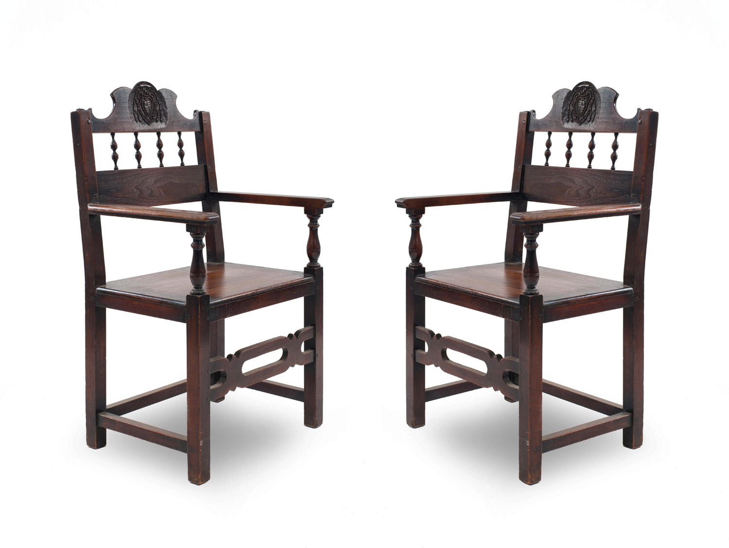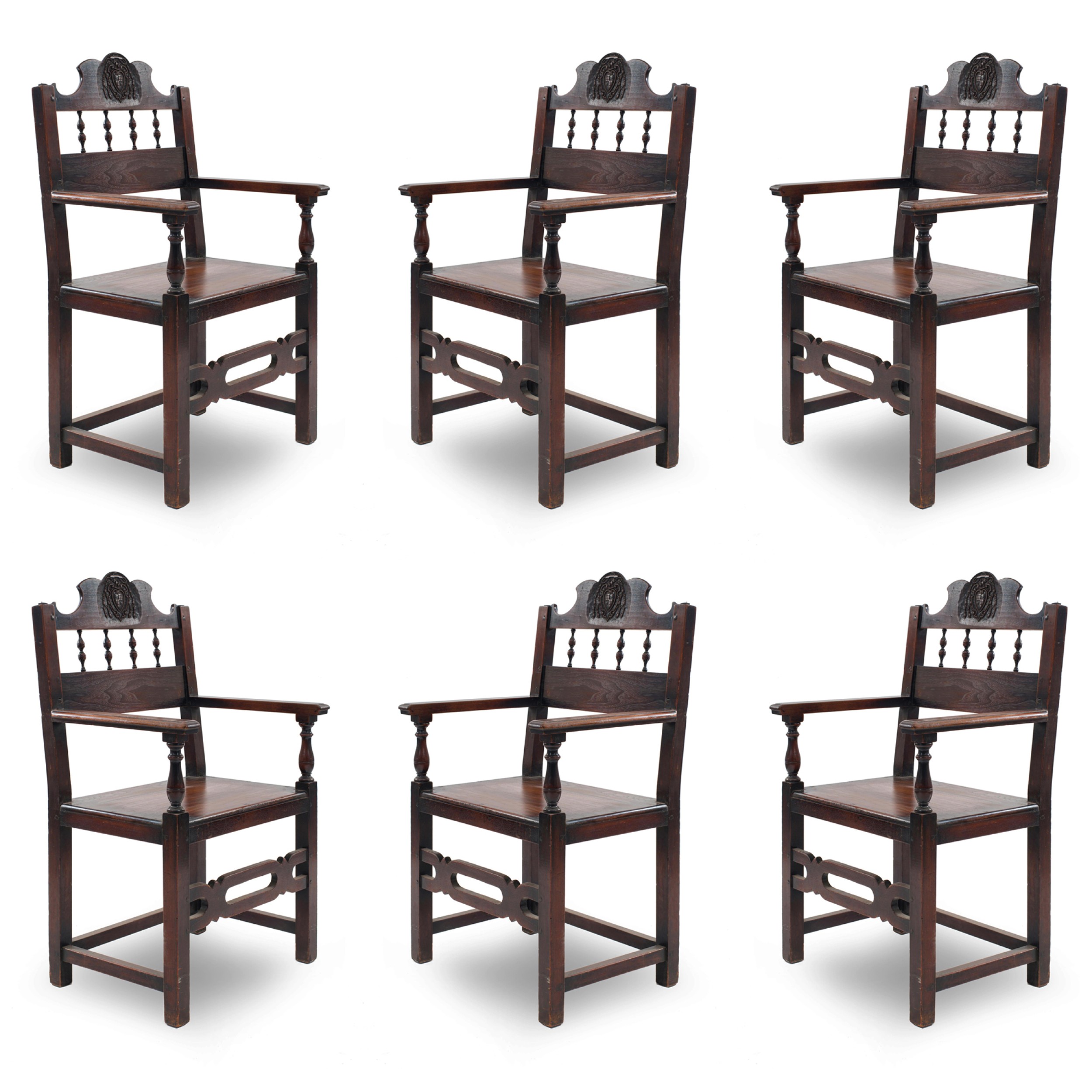 7 English Renaissance-style (19th Century) walnut arm chairs with spindle design and carved crest on back. (PRICED EACH)
