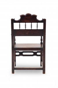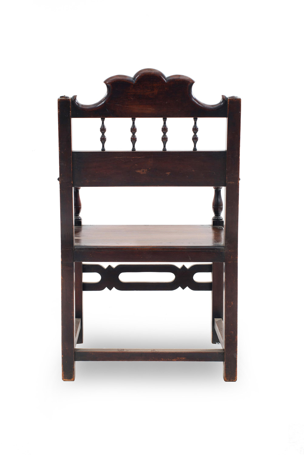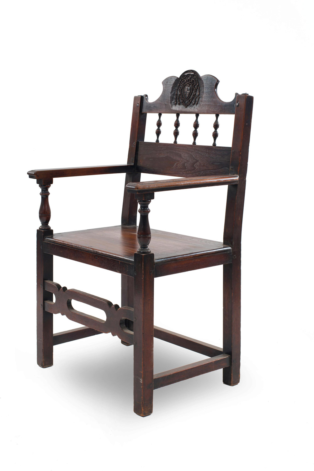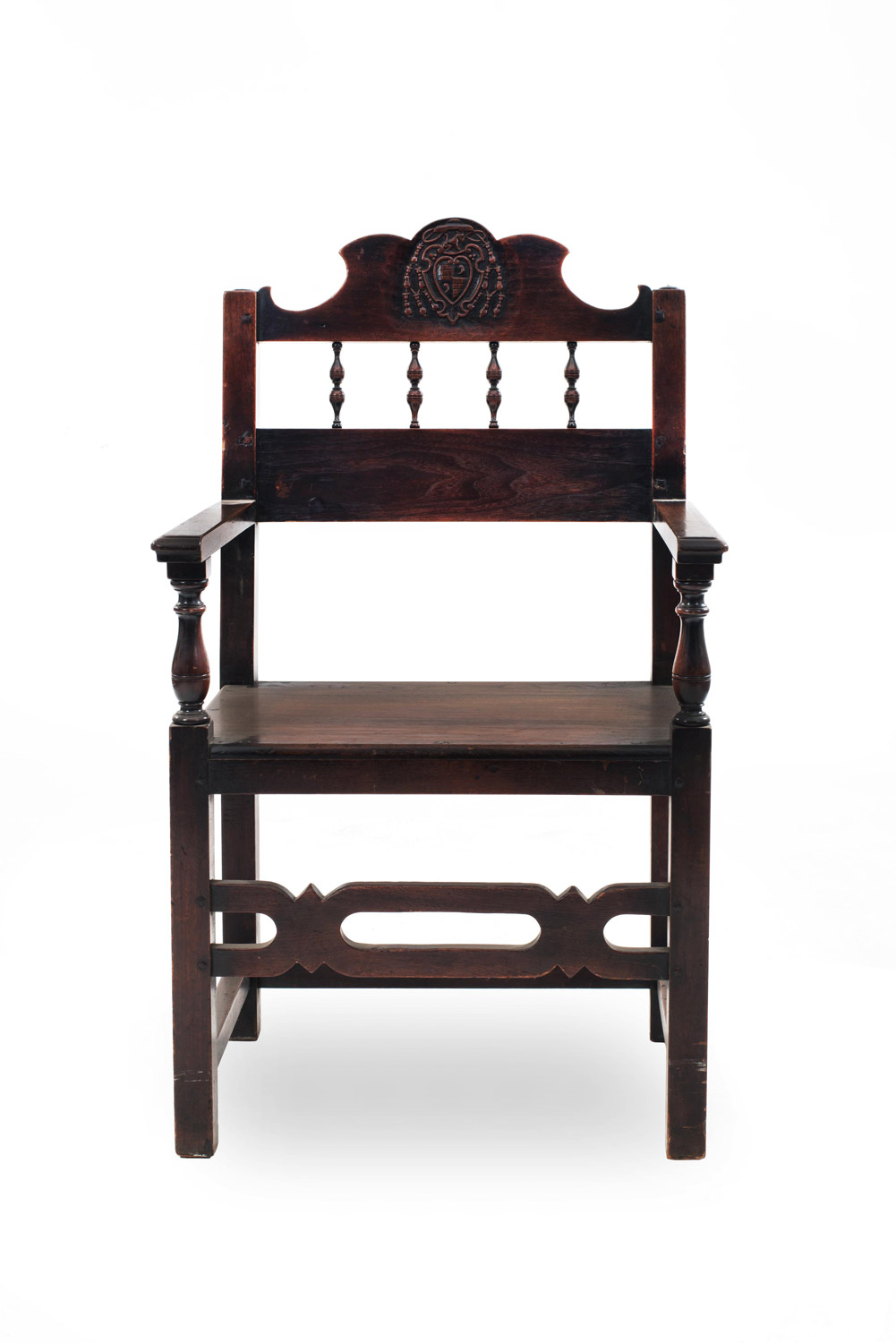 7 English Renaissance-style (19th Century) walnut arm chairs with spindle design and carved crest on back. (PRICED EACH)