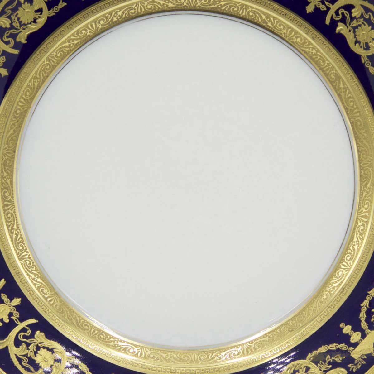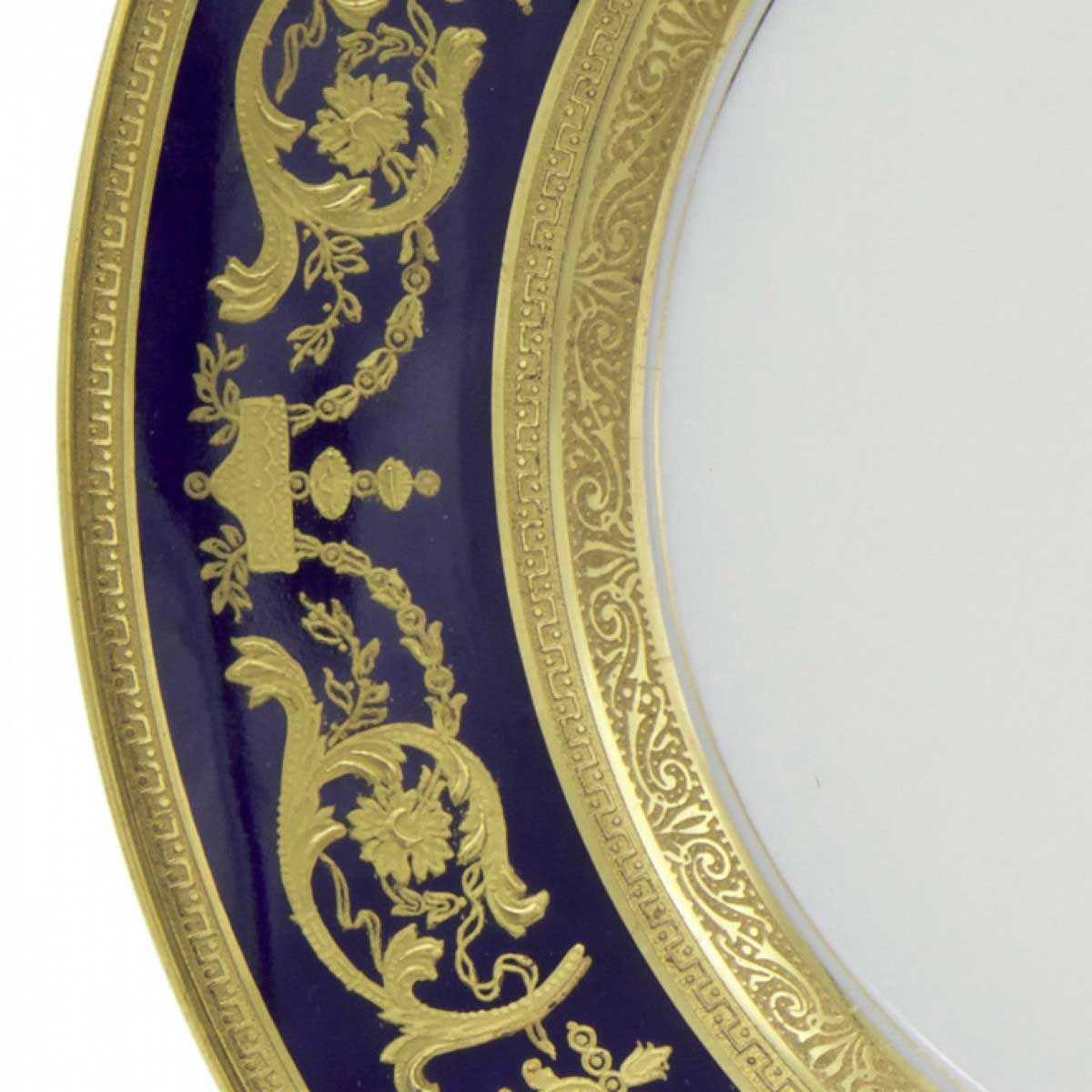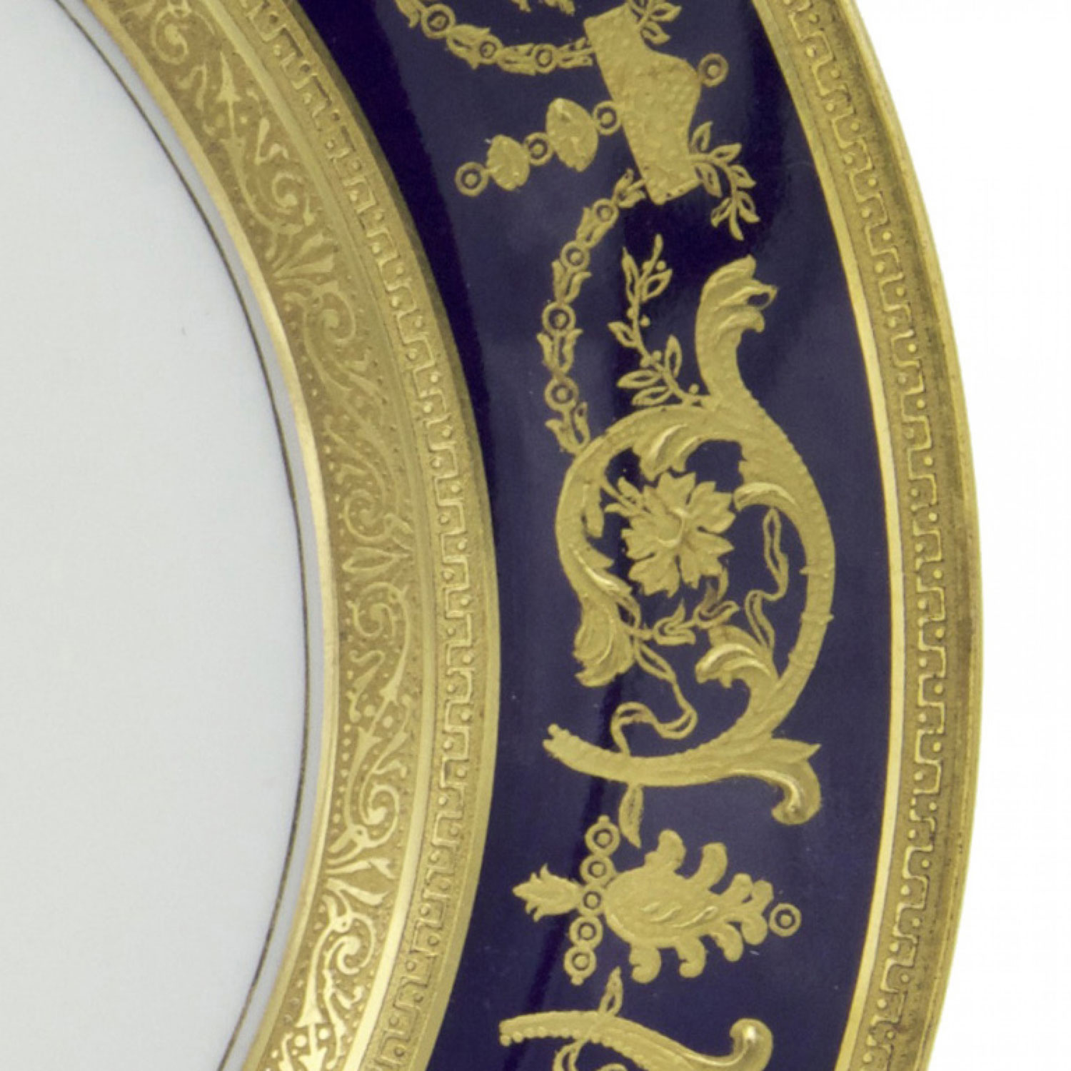 Set of 12 French Victorian blue and white porcelain dinner plates with gilt edge with scroll and festoon border (Haviland) (PRICED AS SET)