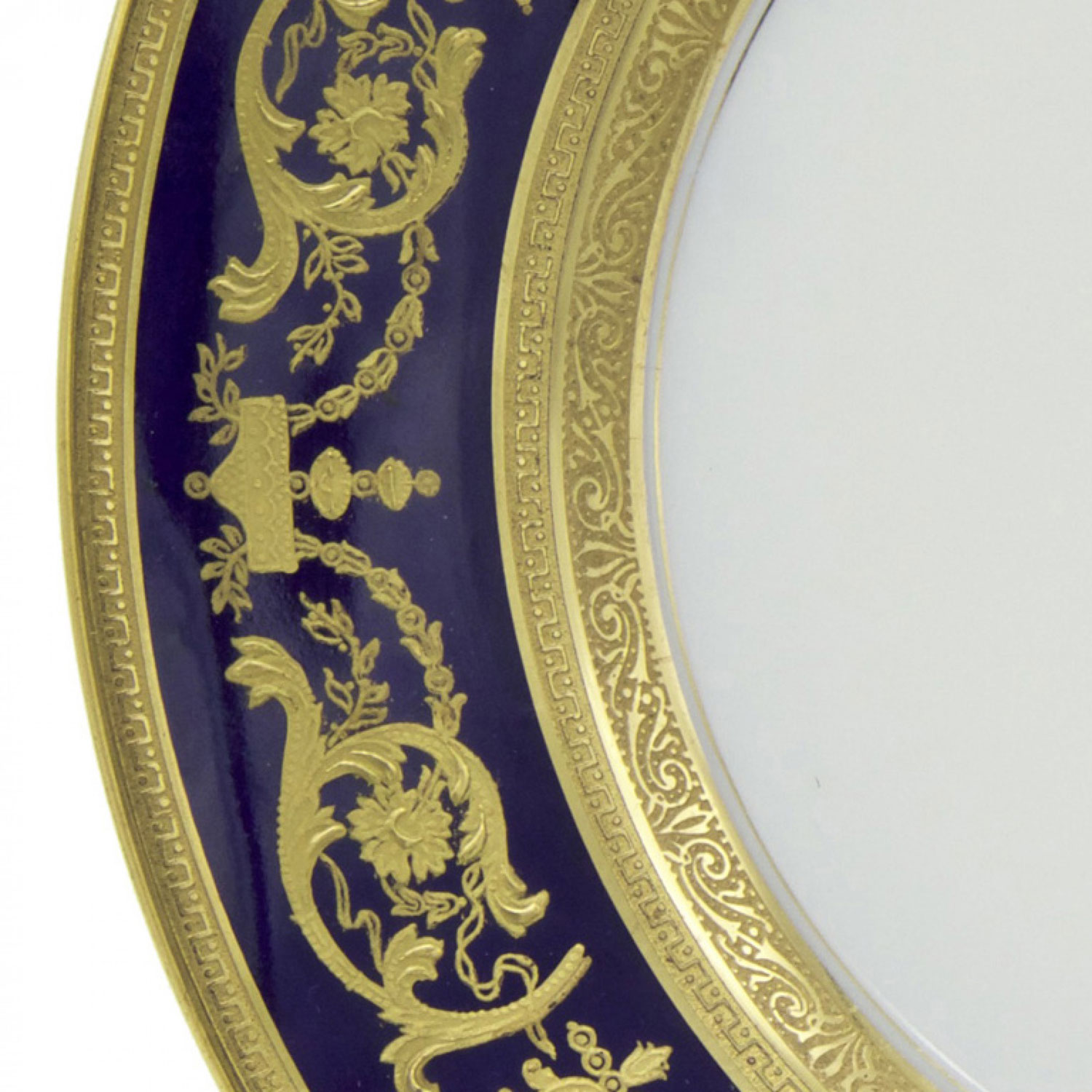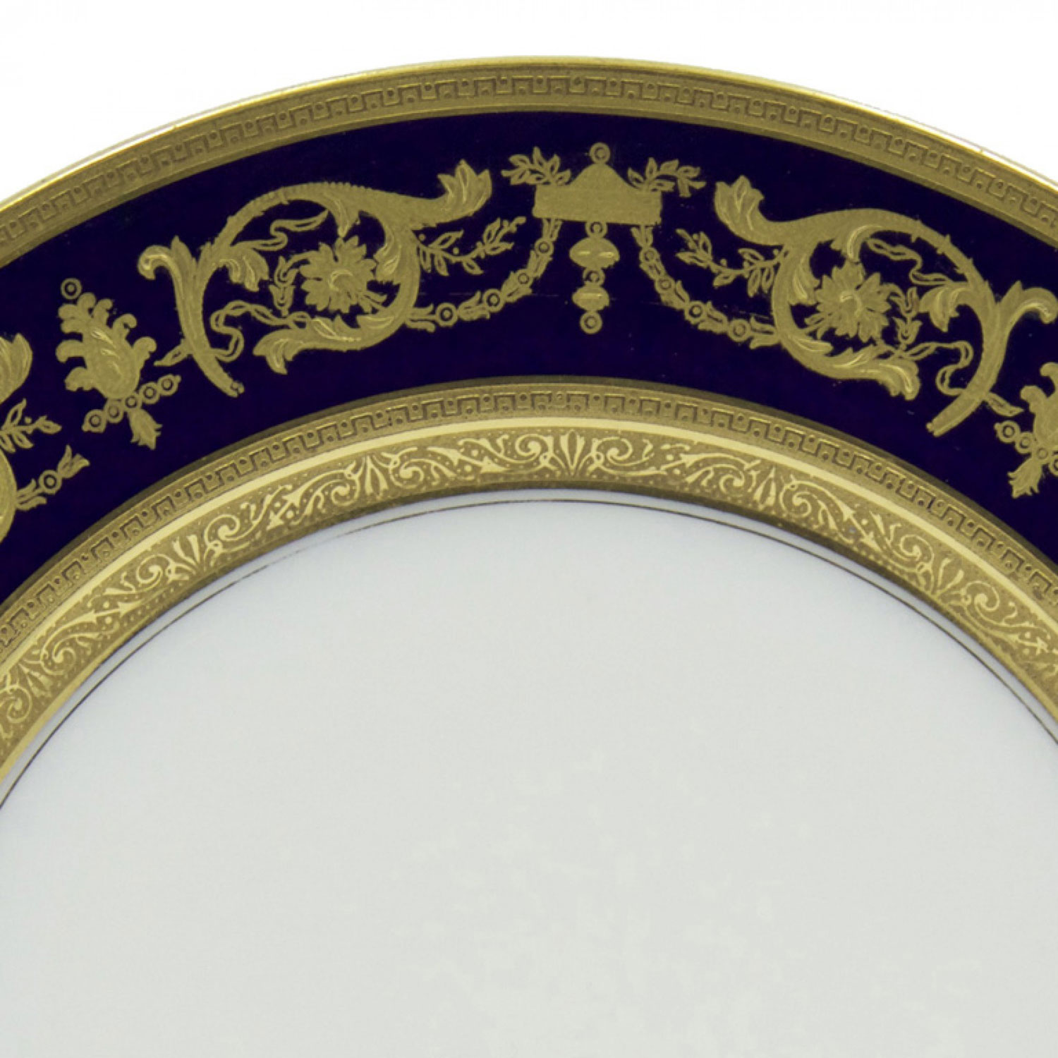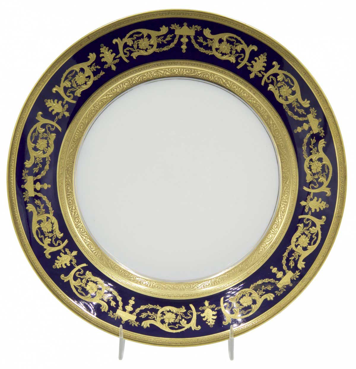 Set of 12 French Victorian blue and white porcelain dinner plates with gilt edge with scroll and festoon border (Haviland) (PRICED AS SET)