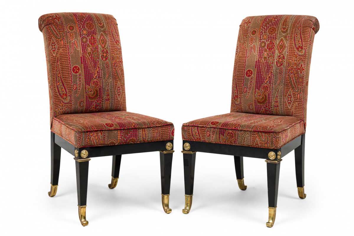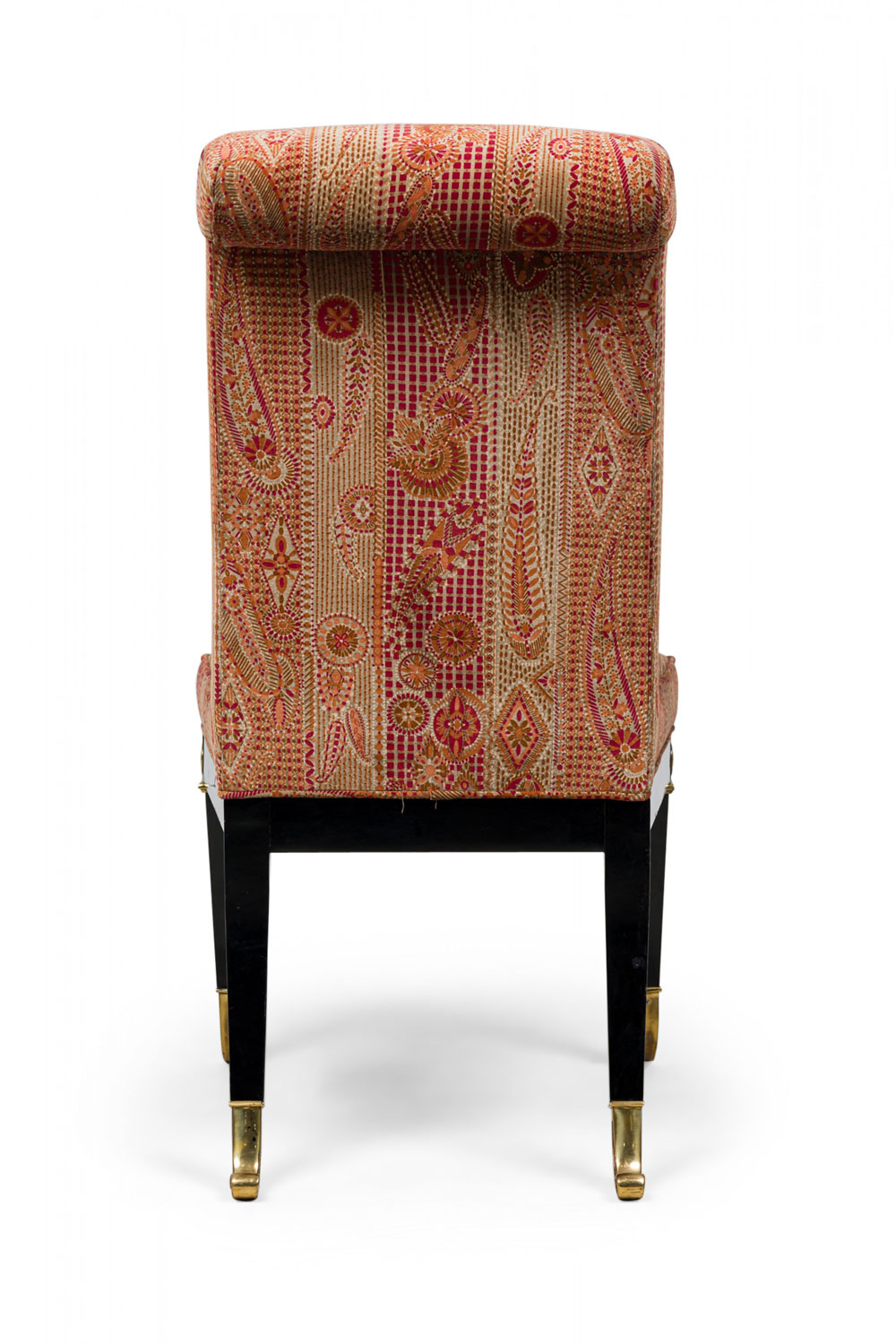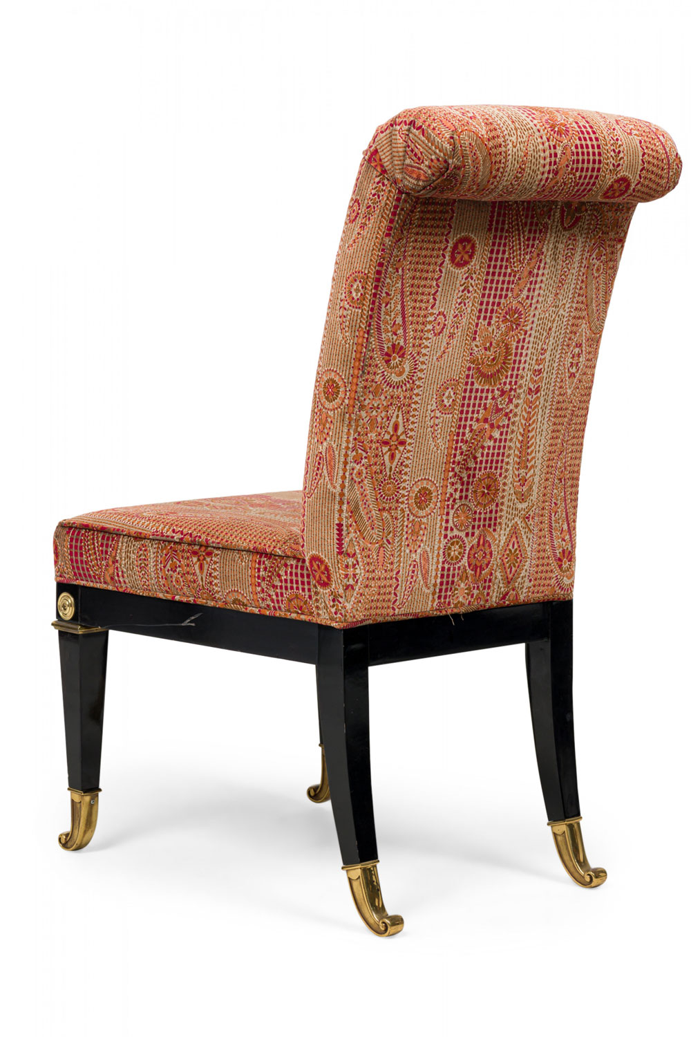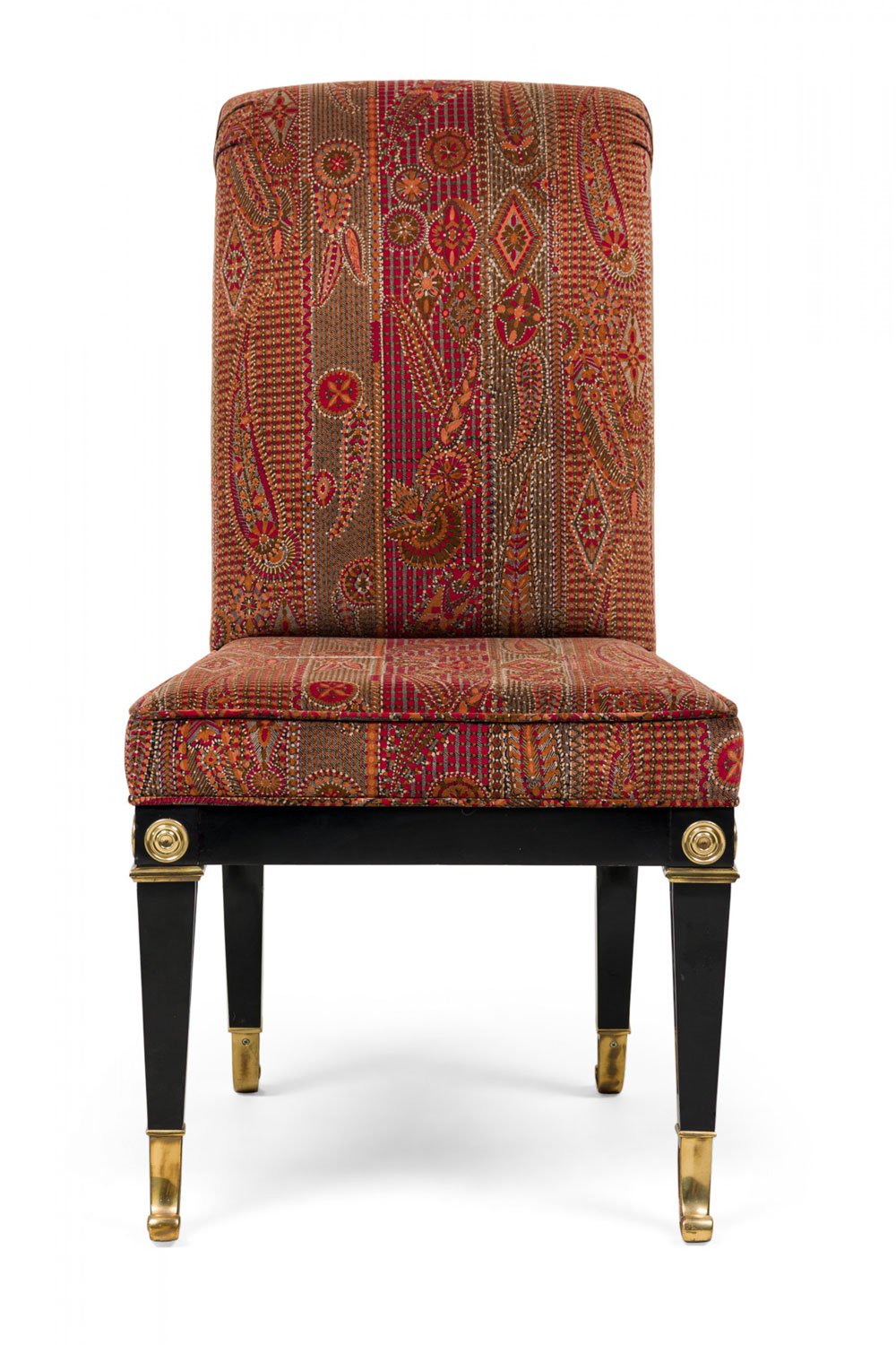 SET of 8 Russian Neo-Classic-style dining chairs (2 armchairs, 6 side chairs) with tall rectangular backs with scroll curved back rails and black lacquered wooden frames mounted with decorative polished bronze medallions and sabots, upholstered in a textured and patterned red, orange, and green fabric. (PRICED AS SET)(Available individually: armchairs: REG4042A, side chairs: REG4042B)