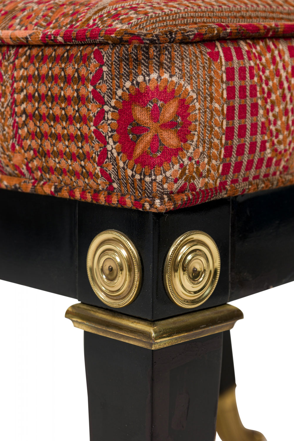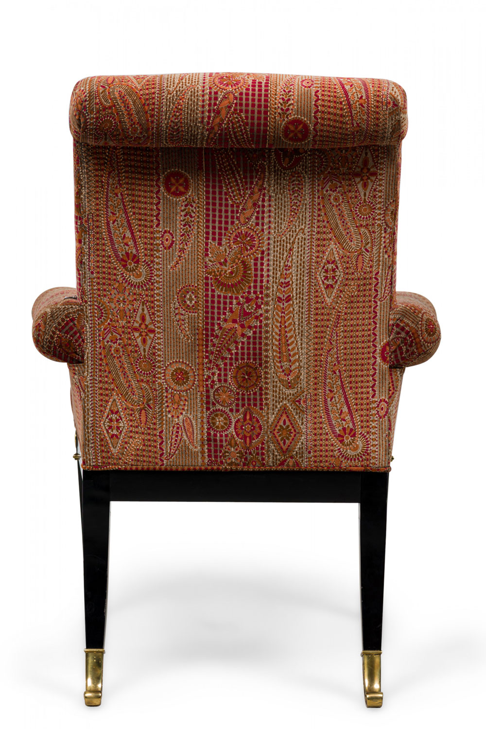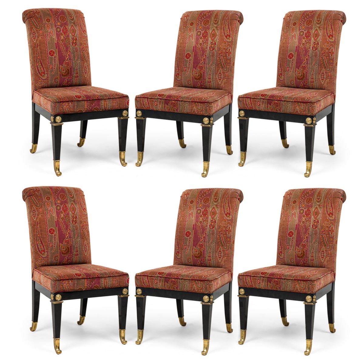SET of 8 Russian Neo-Classic-style dining chairs (2 armchairs, 6 side chairs) with tall rectangular backs with scroll curved back rails and black lacquered wooden frames mounted with decorative polished bronze medallions and sabots, upholstered in a textured and patterned red, orange, and green fabric. (PRICED AS SET)(Available individually: armchairs: REG4042A, side chairs: REG4042B)