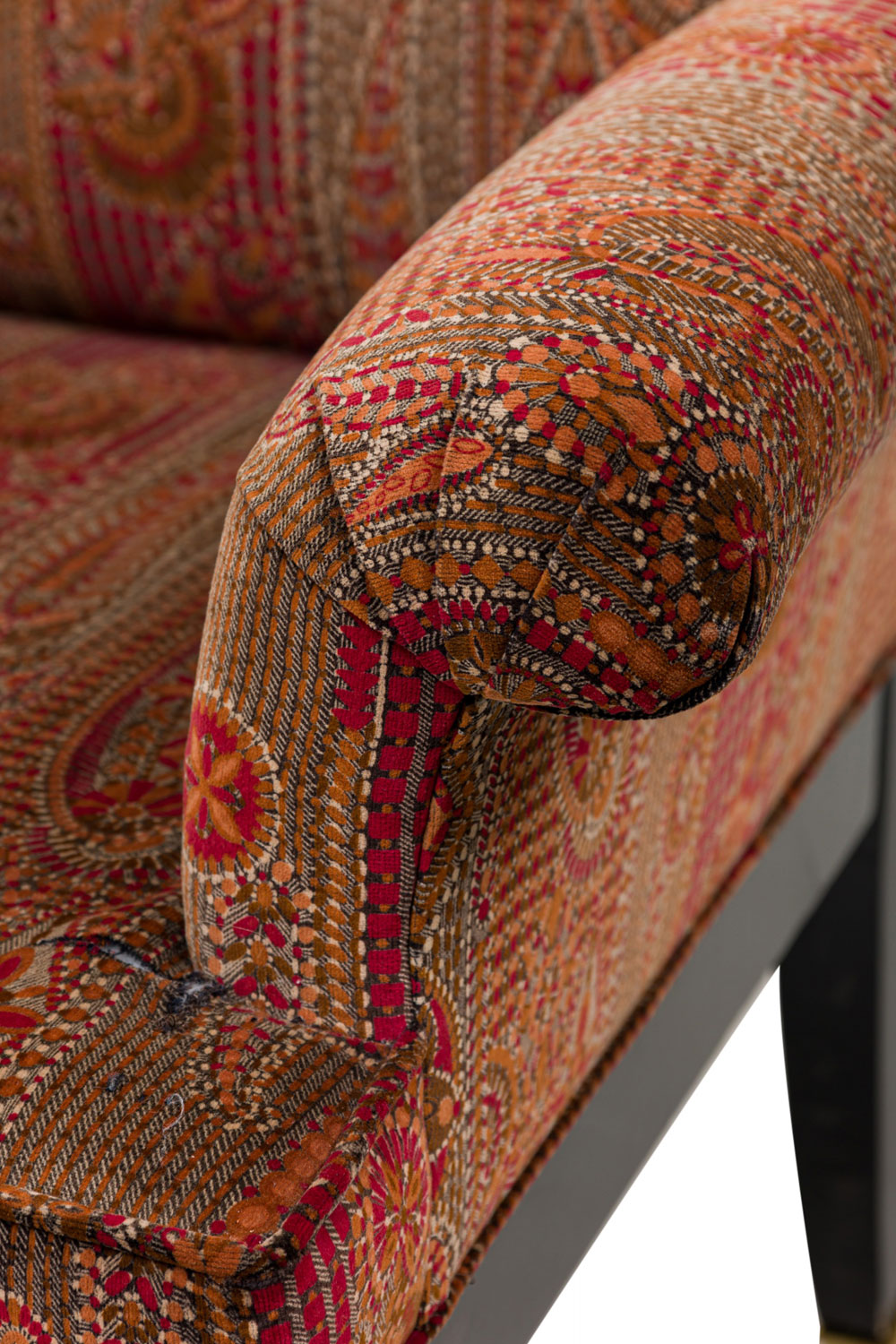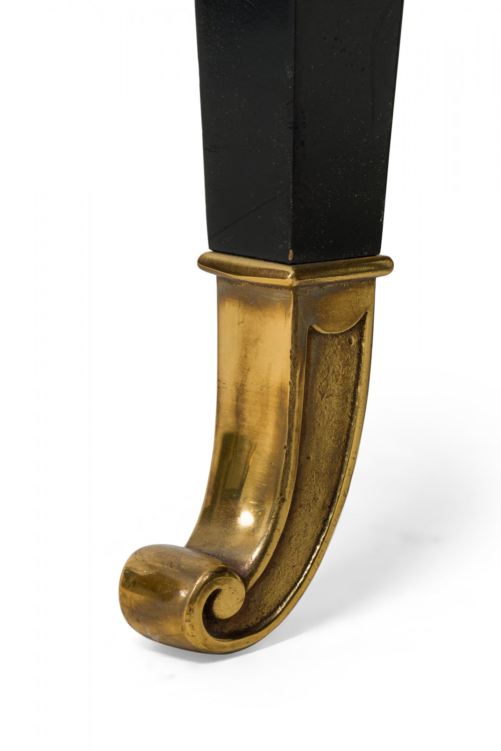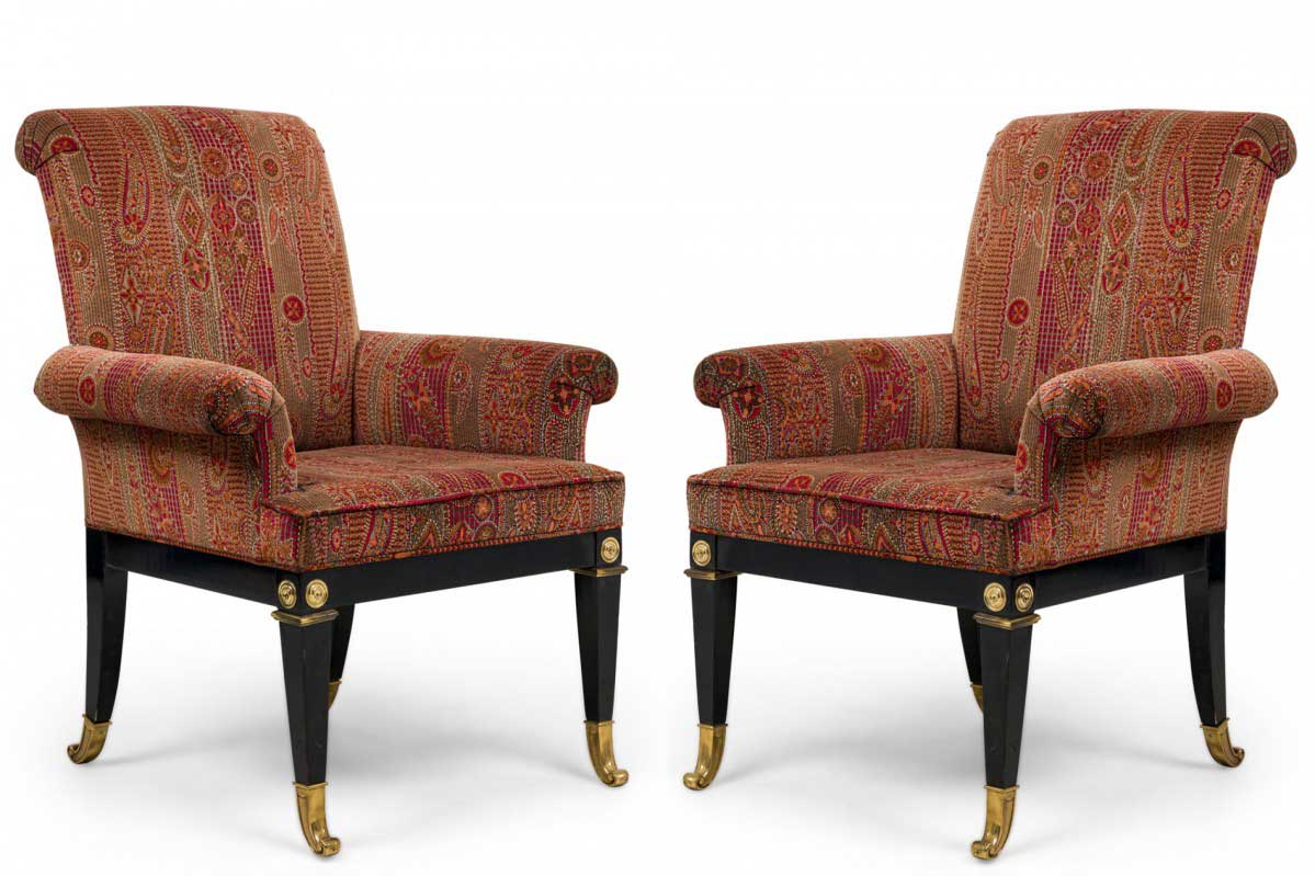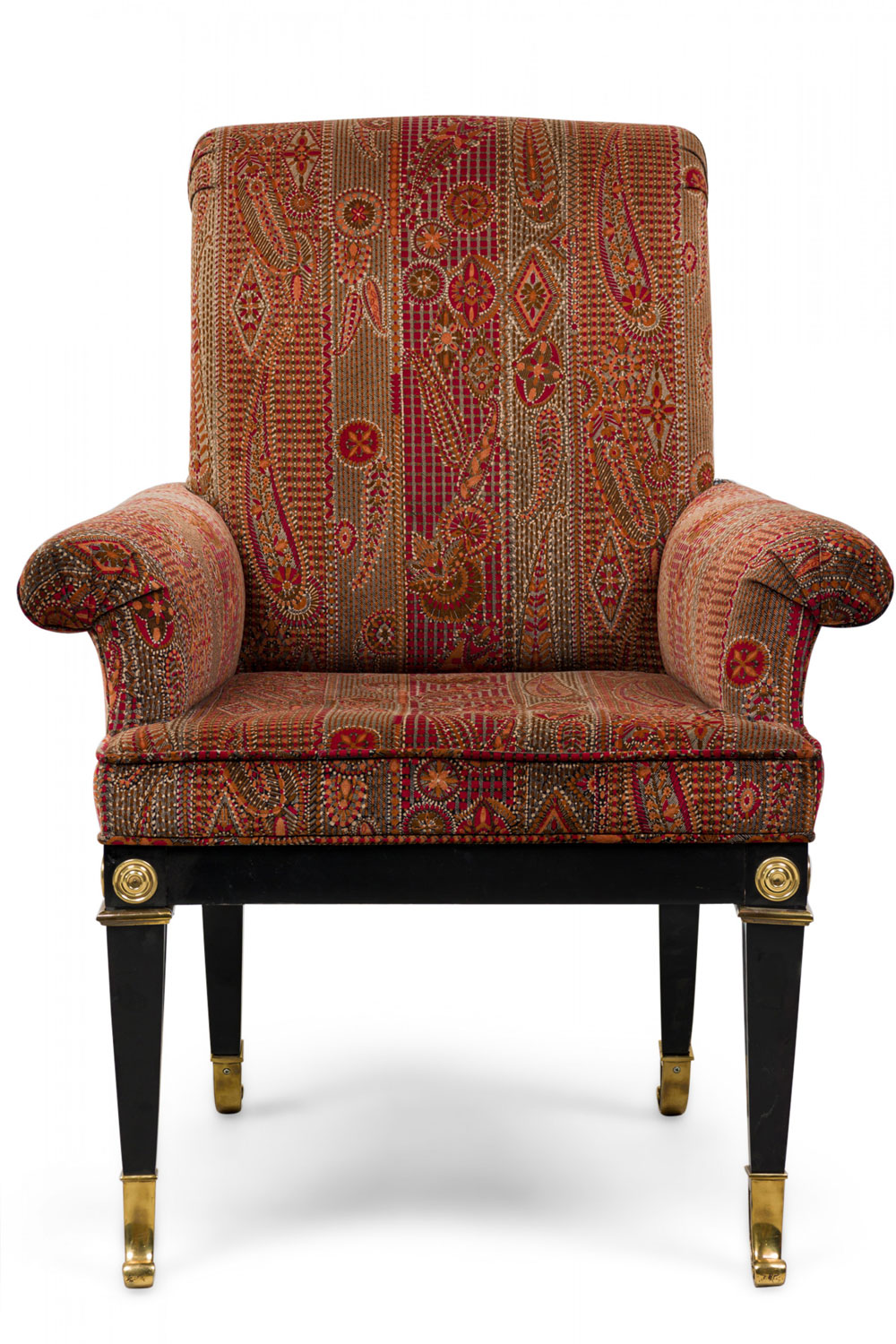 SET of 8 Russian Neo-Classic-style dining chairs (2 armchairs, 6 side chairs) with tall rectangular backs with scroll curved back rails and black lacquered wooden frames mounted with decorative polished bronze medallions and sabots, upholstered in a textured and patterned red, orange, and green fabric. (PRICED AS SET)(Available individually: armchairs: REG4042A, side chairs: REG4042B)