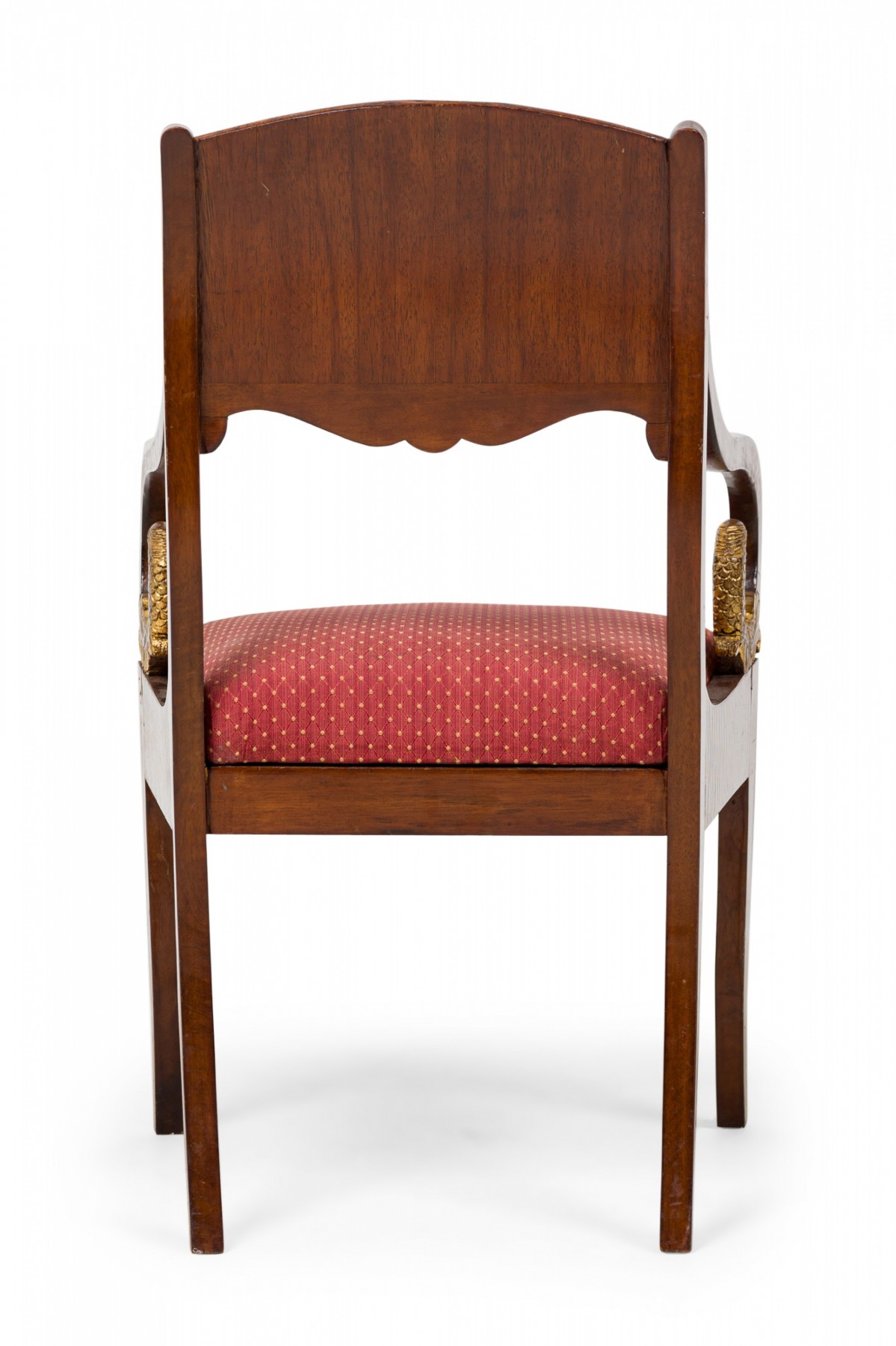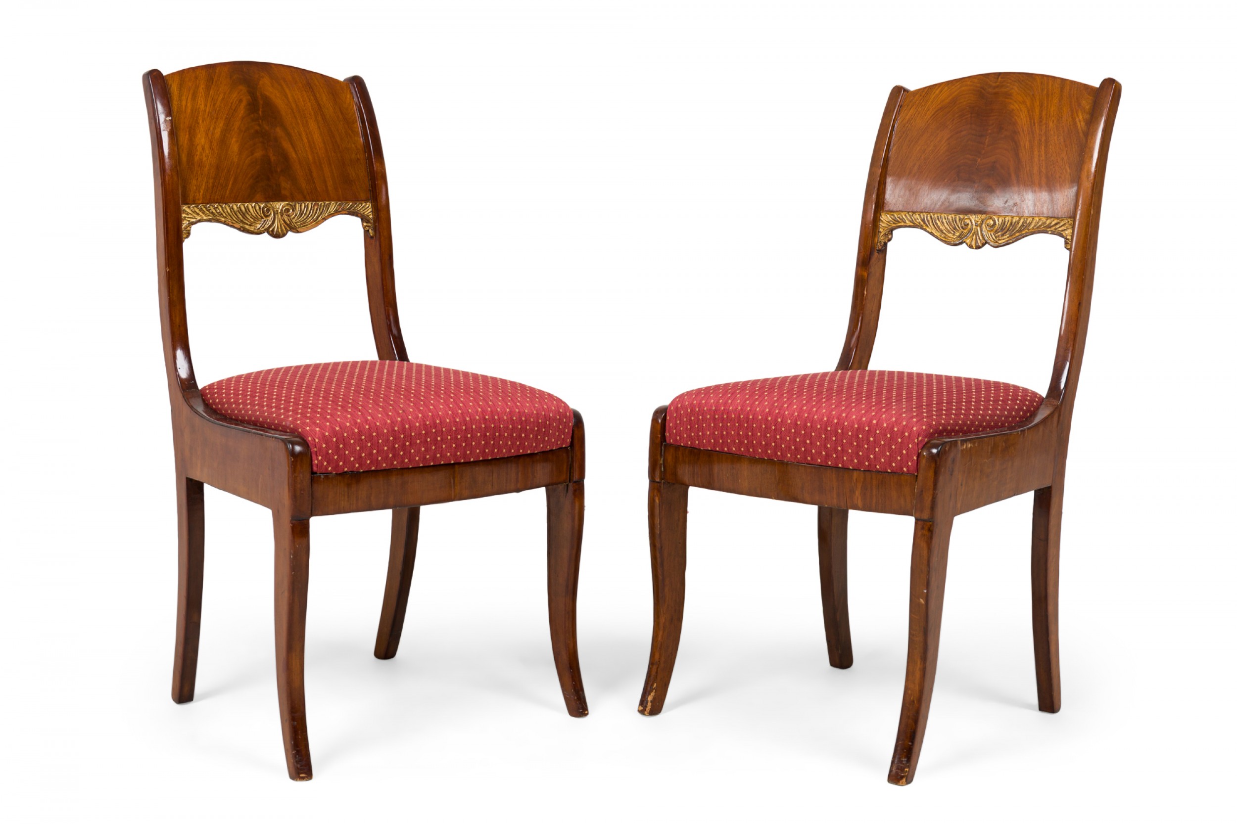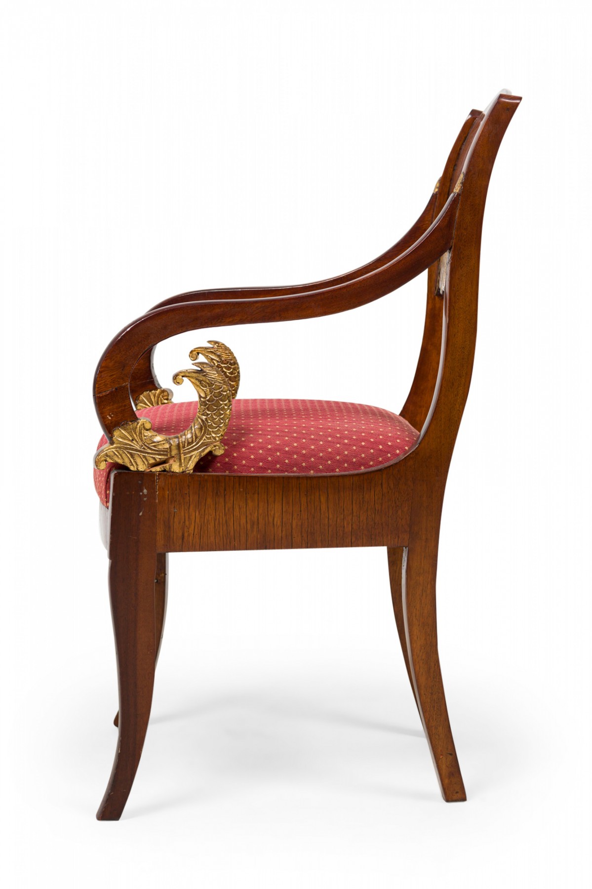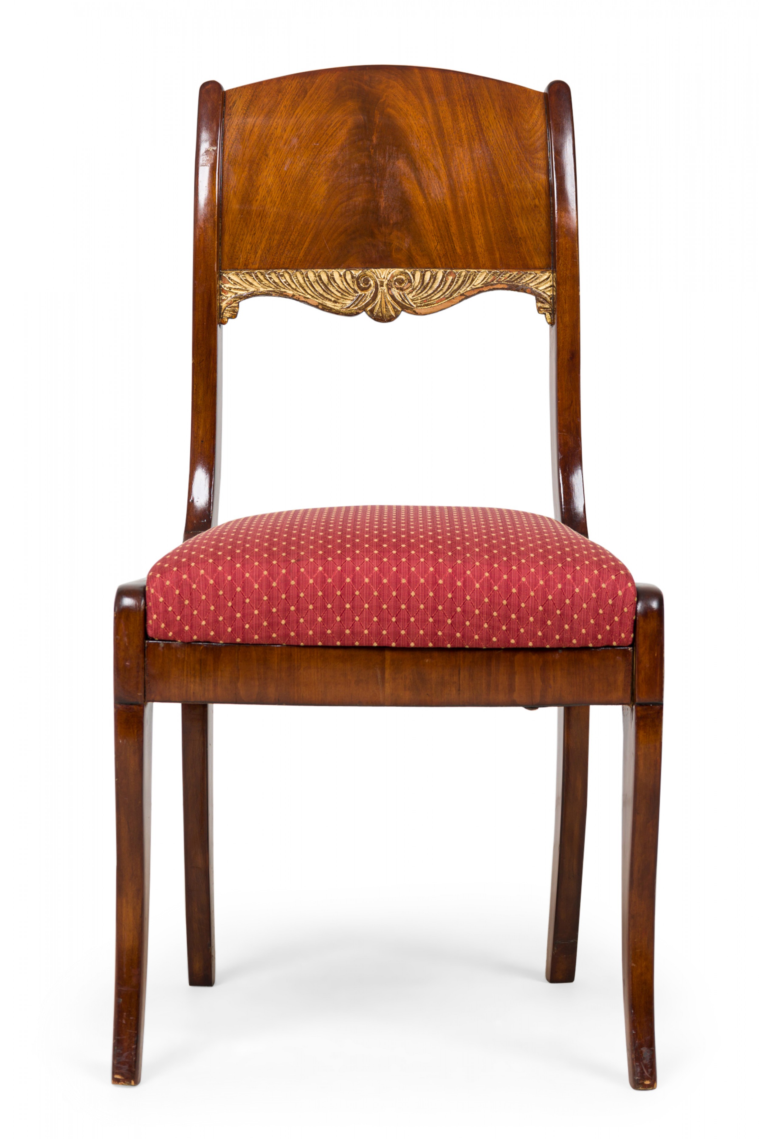 SET of 8 Russian Neo-Classical style dining chairs (2 armchairs, 6 side chairs) with carved mahogany parcel-gilt frames and slip seats upholstered in red fabric featuring a fine gold dot pattern, resting on four sabre legs. (PRICED AS SET)(Available individually: Armchairs: REG4020A, side chairs: REG4020B)