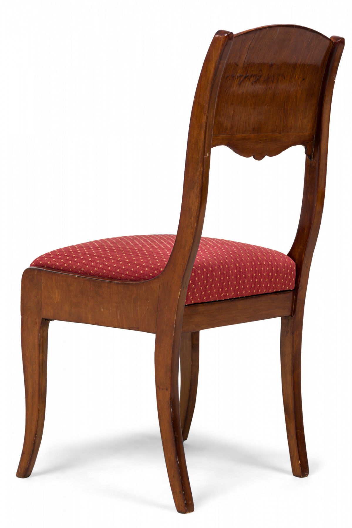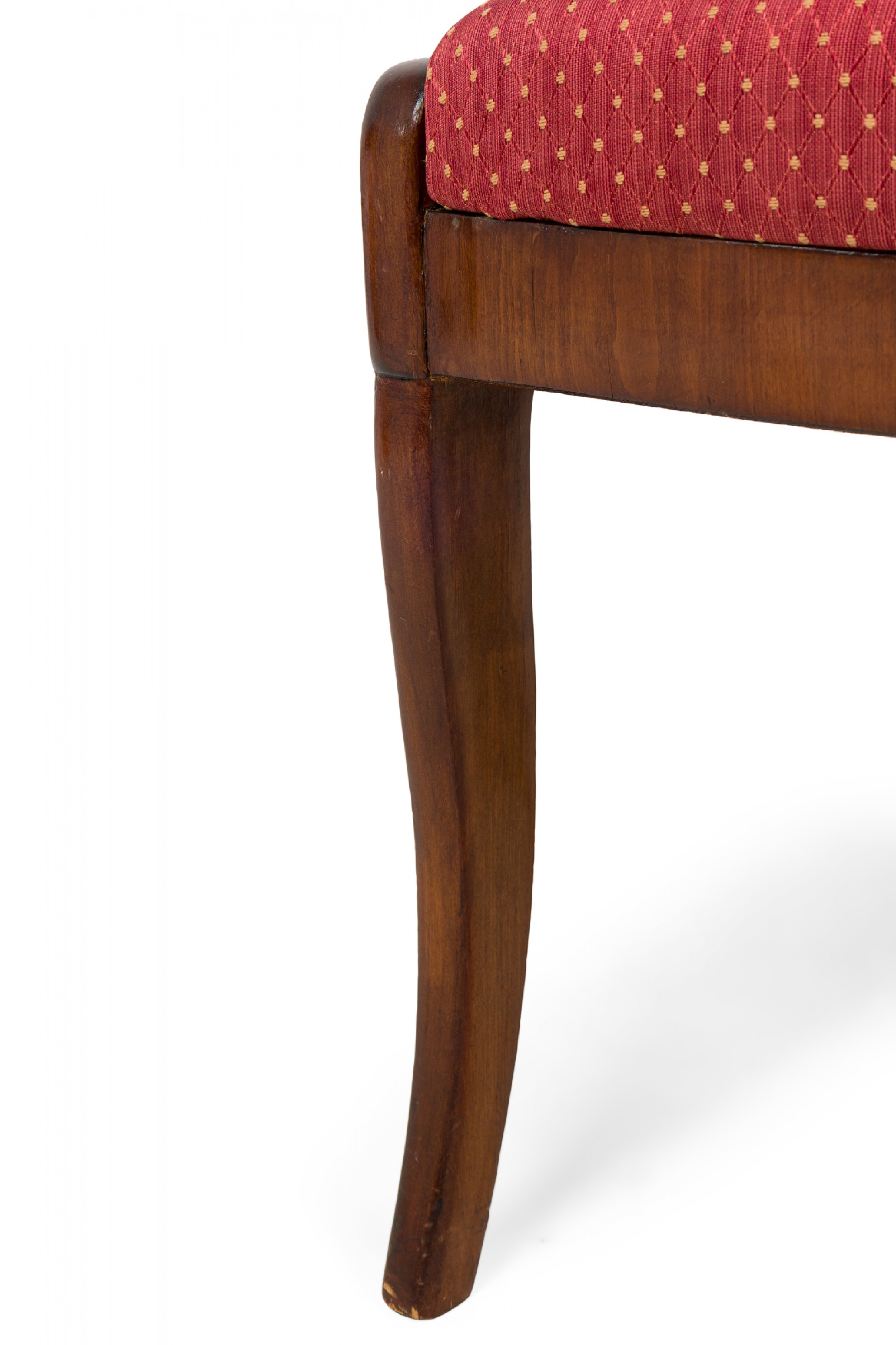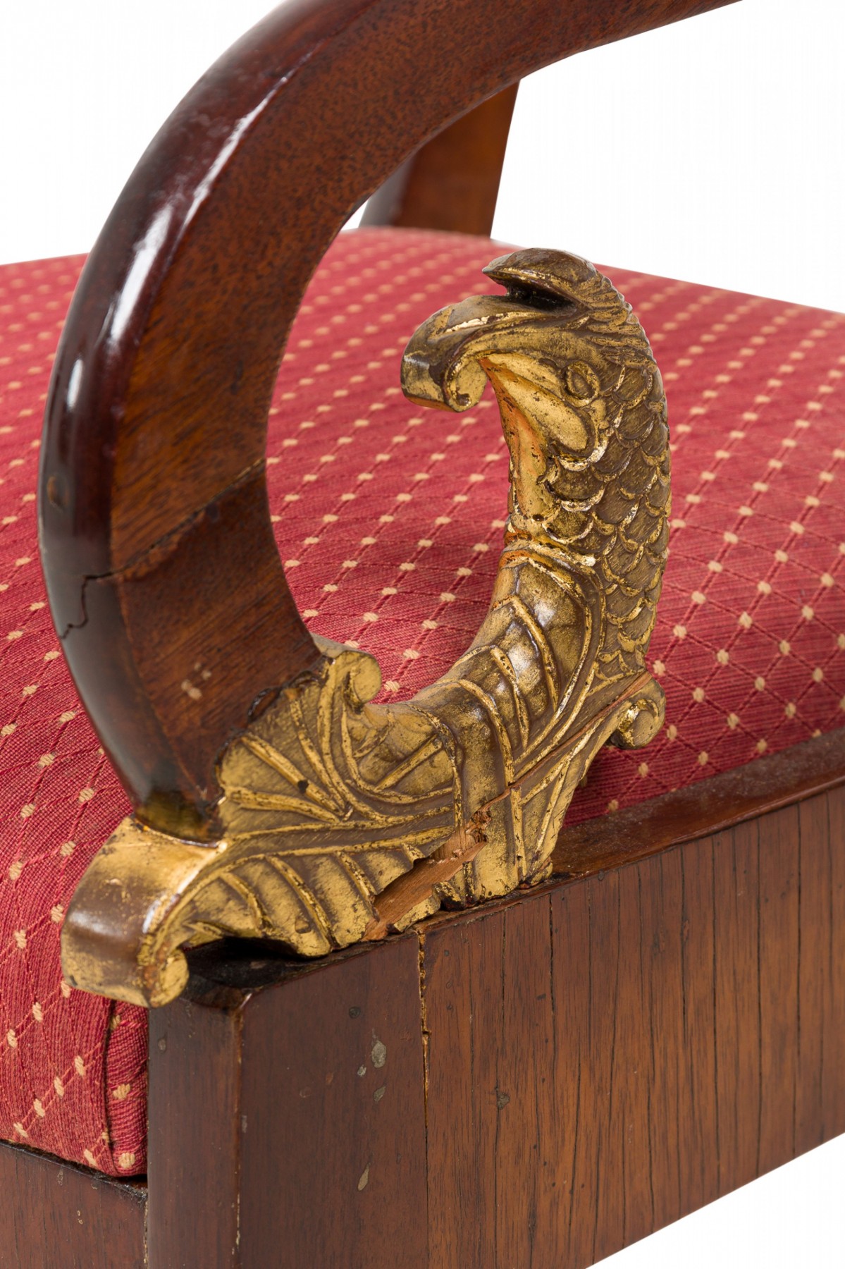 SET of 8 Russian Neo-Classical style dining chairs (2 armchairs, 6 side chairs) with carved mahogany parcel-gilt frames and slip seats upholstered in red fabric featuring a fine gold dot pattern, resting on four sabre legs. (PRICED AS SET)(Available individually: Armchairs: REG4020A, side chairs: REG4020B)