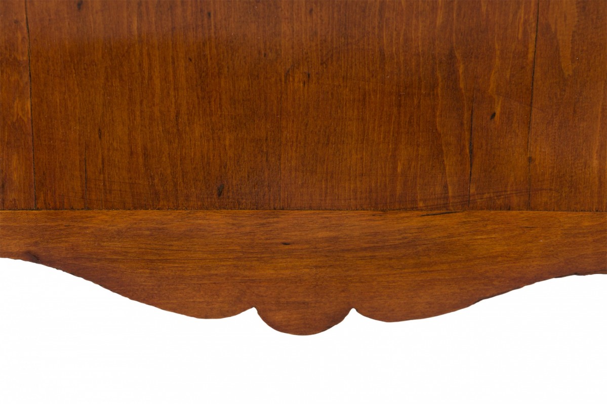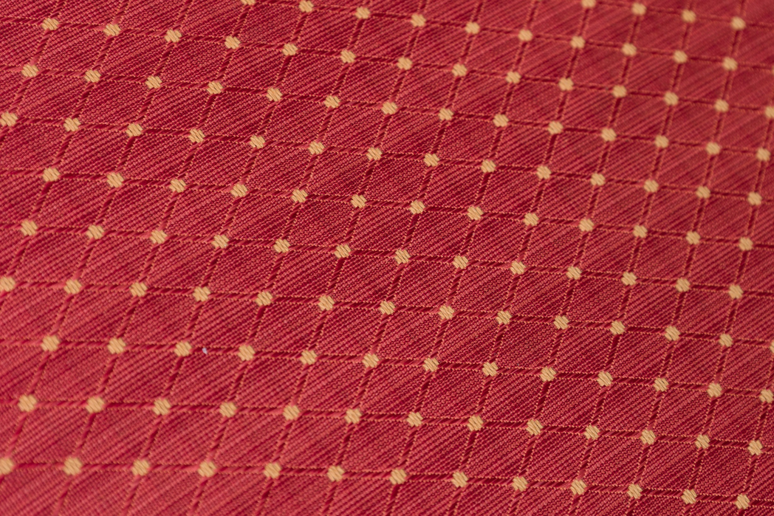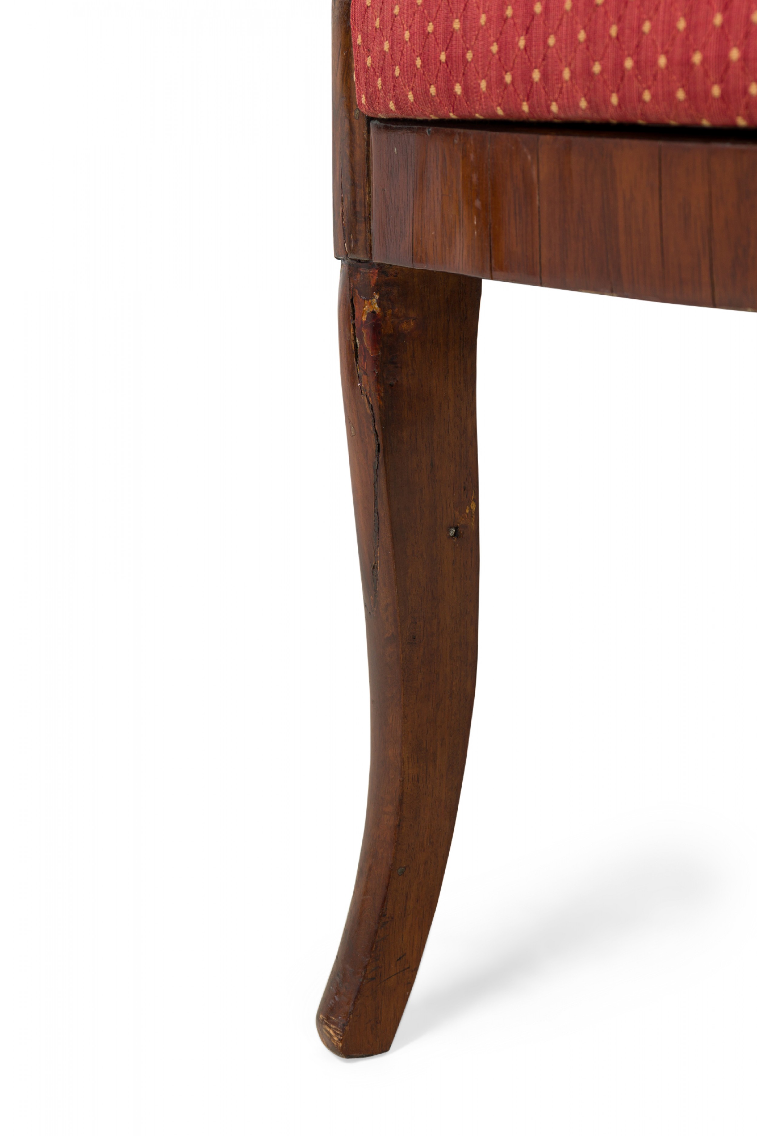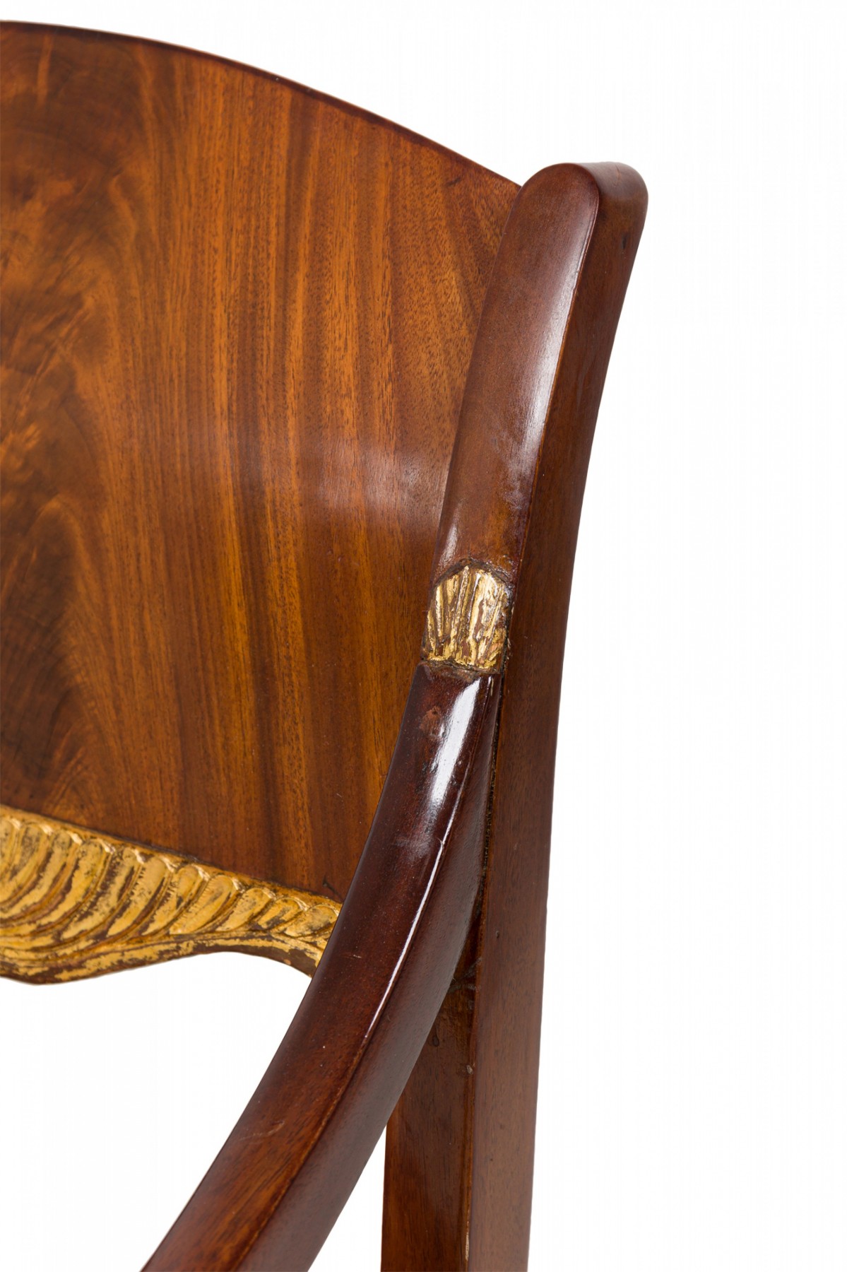 SET of 8 Russian Neo-Classical style dining chairs (2 armchairs, 6 side chairs) with carved mahogany parcel-gilt frames and slip seats upholstered in red fabric featuring a fine gold dot pattern, resting on four sabre legs. (PRICED AS SET)(Available individually: Armchairs: REG4020A, side chairs: REG4020B)