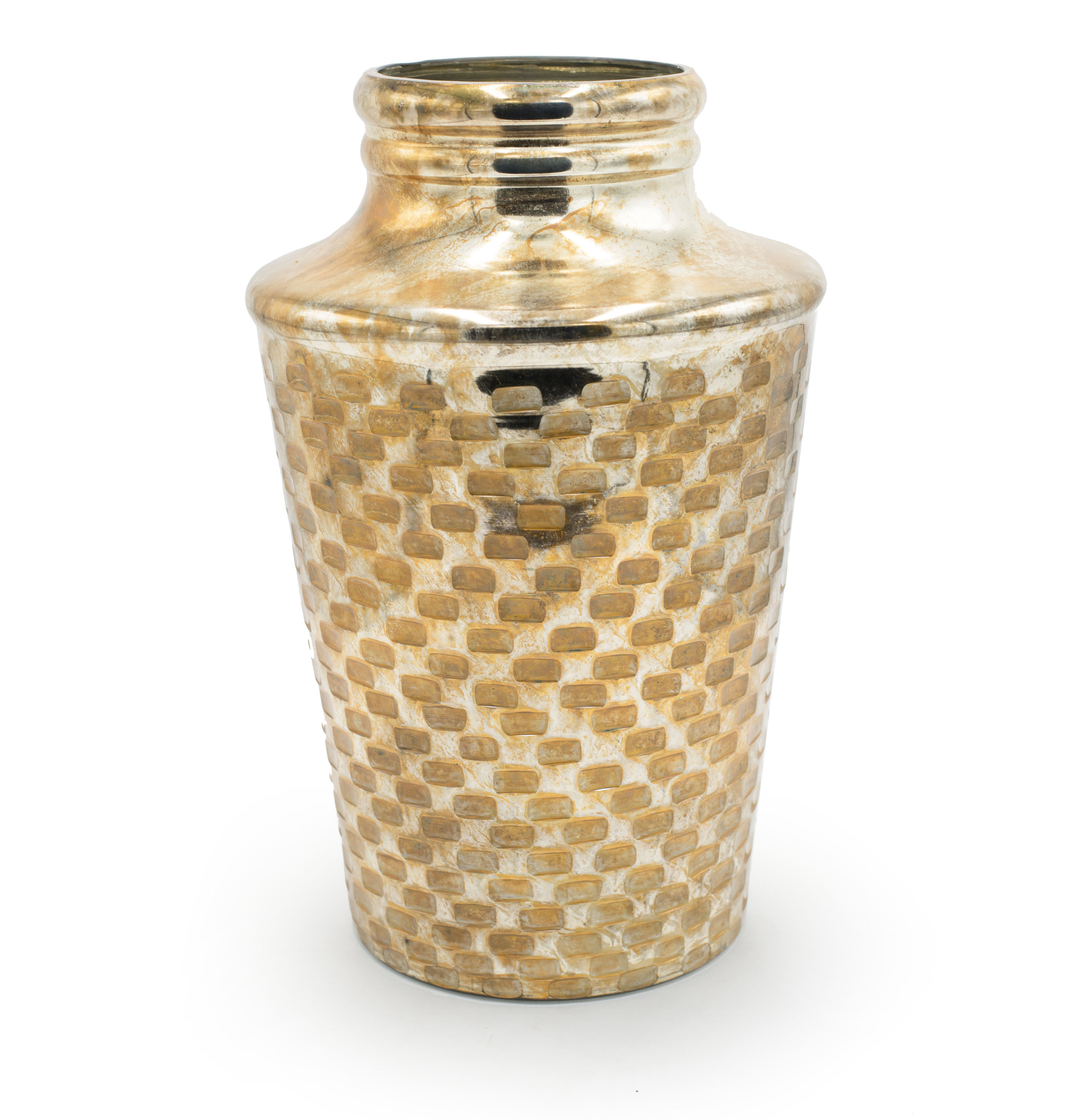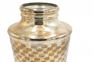 Contemporary urn-shaped ceramic vase with silver metallic finish and impressed rectangular geometric pattern