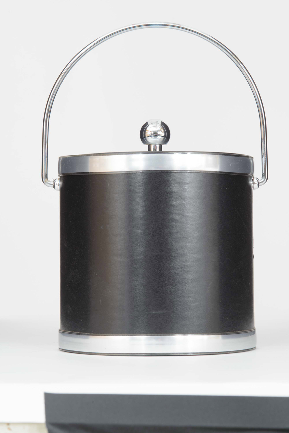 Contemporary ice bucket with faux black leather finish and a silver metal rim and lid with a knob