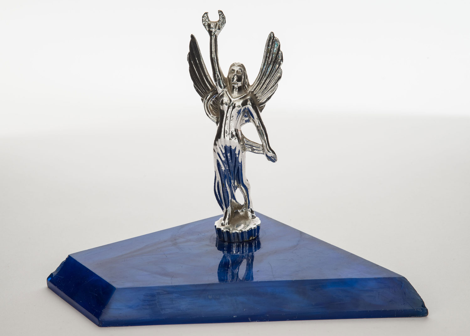 Silver metal trophy in the figure of Nike, the greek goddess of victory, on a blue resin base