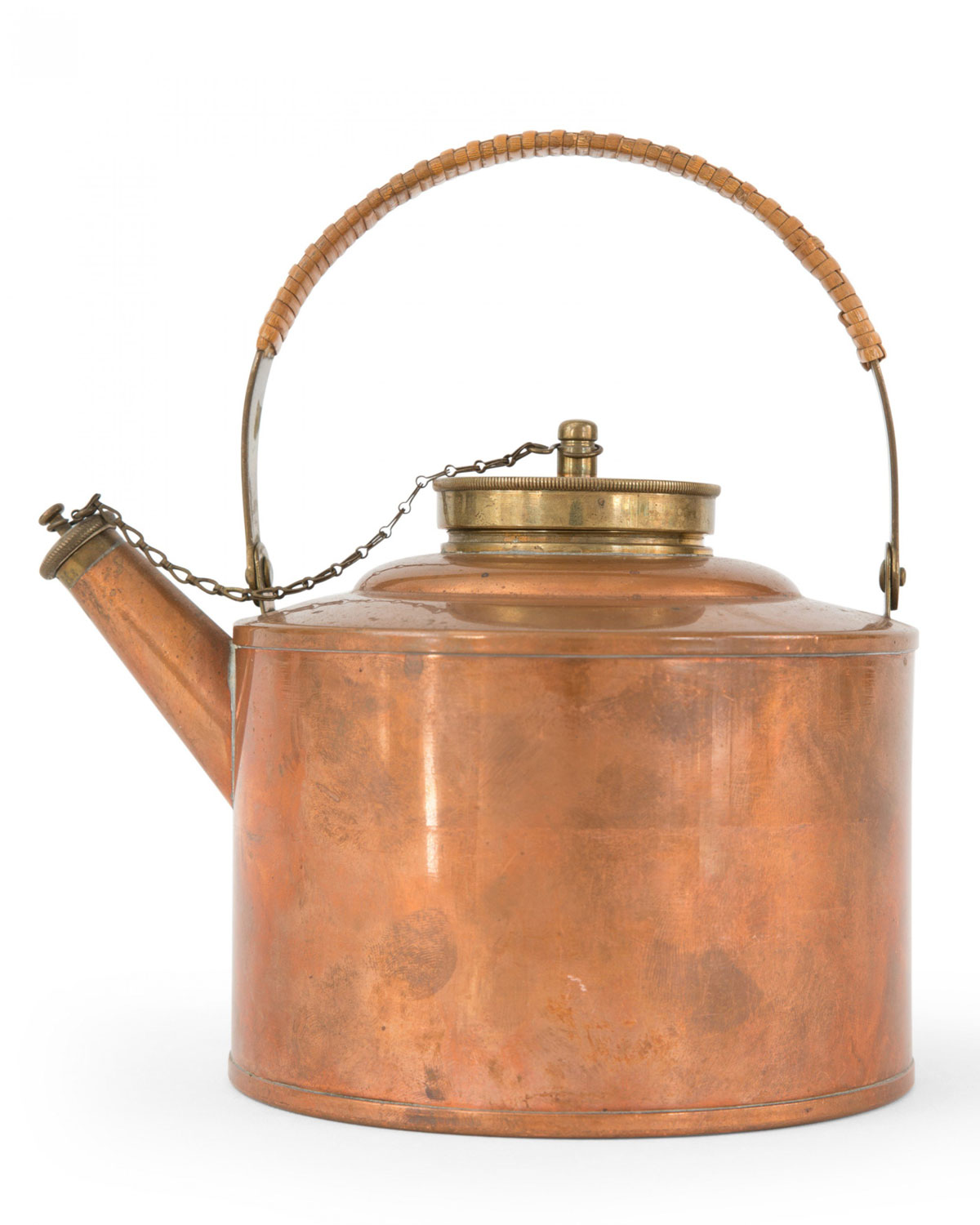 Small copper tea kettle with a woven reed handle cover and spout and caraffe stoppers