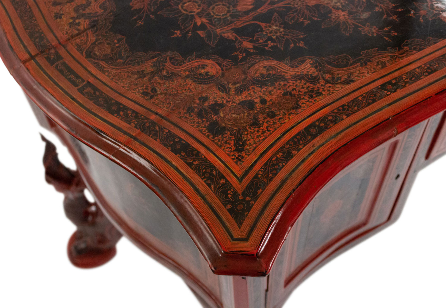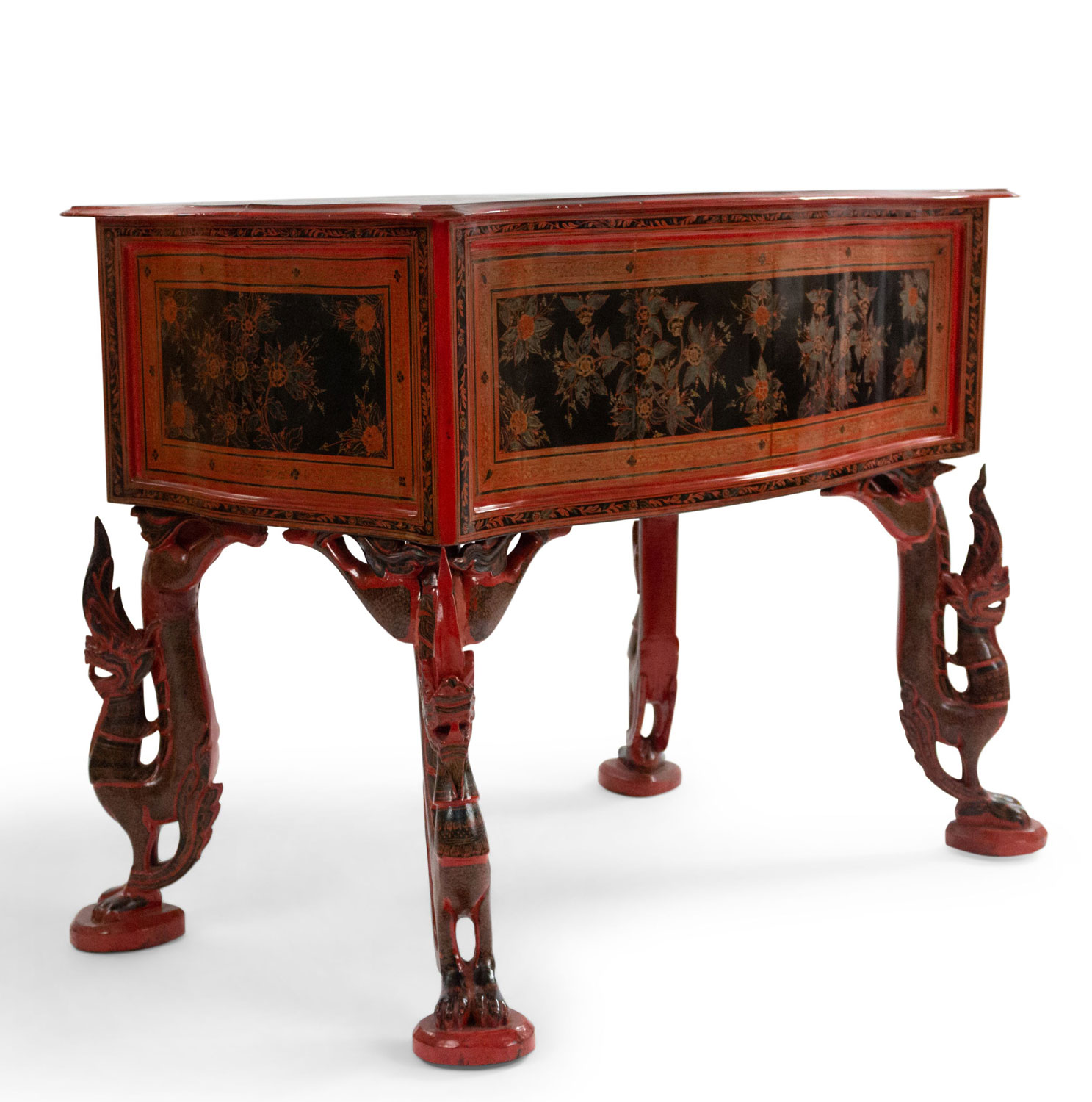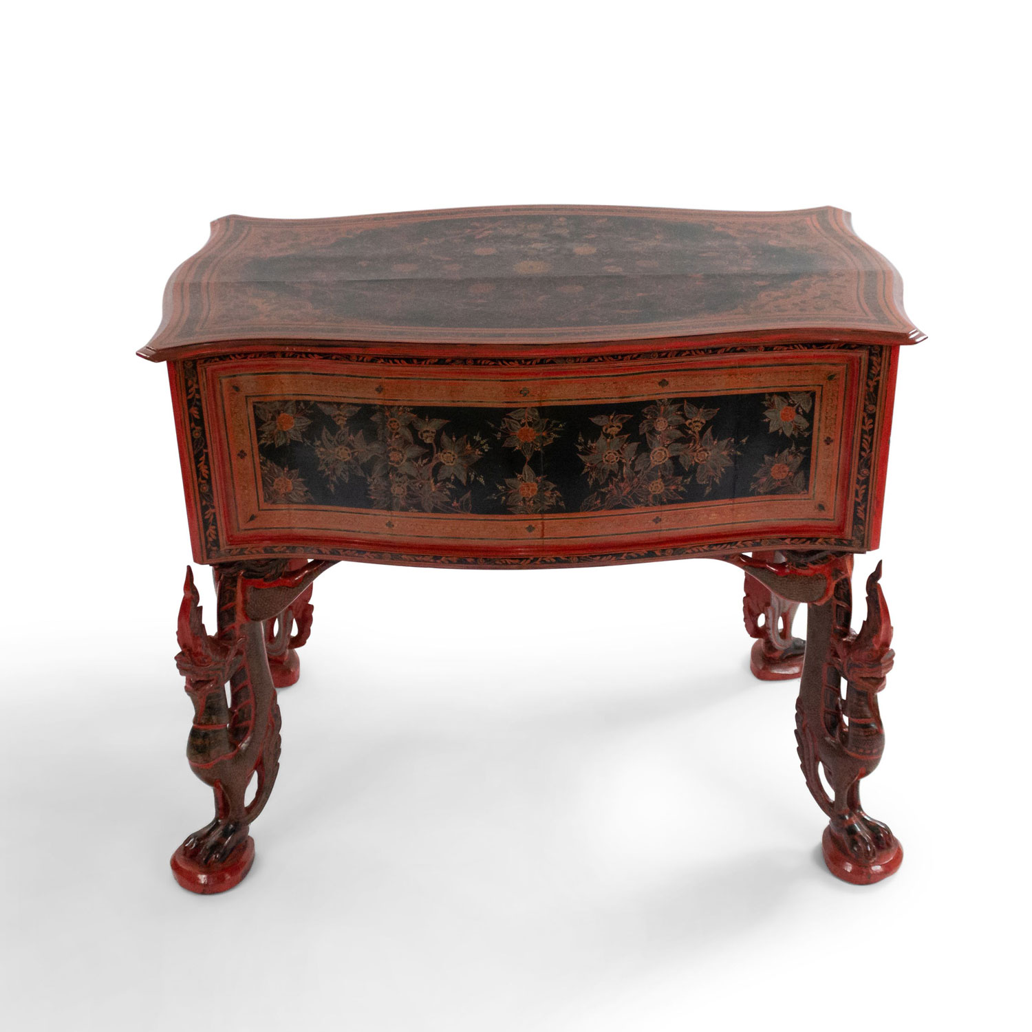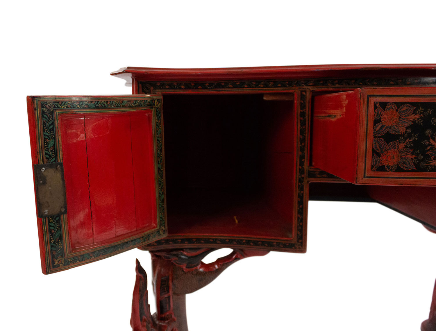 Southeast Asian style (19th Century) red lacquer decorated desk with figural bird legs.