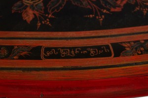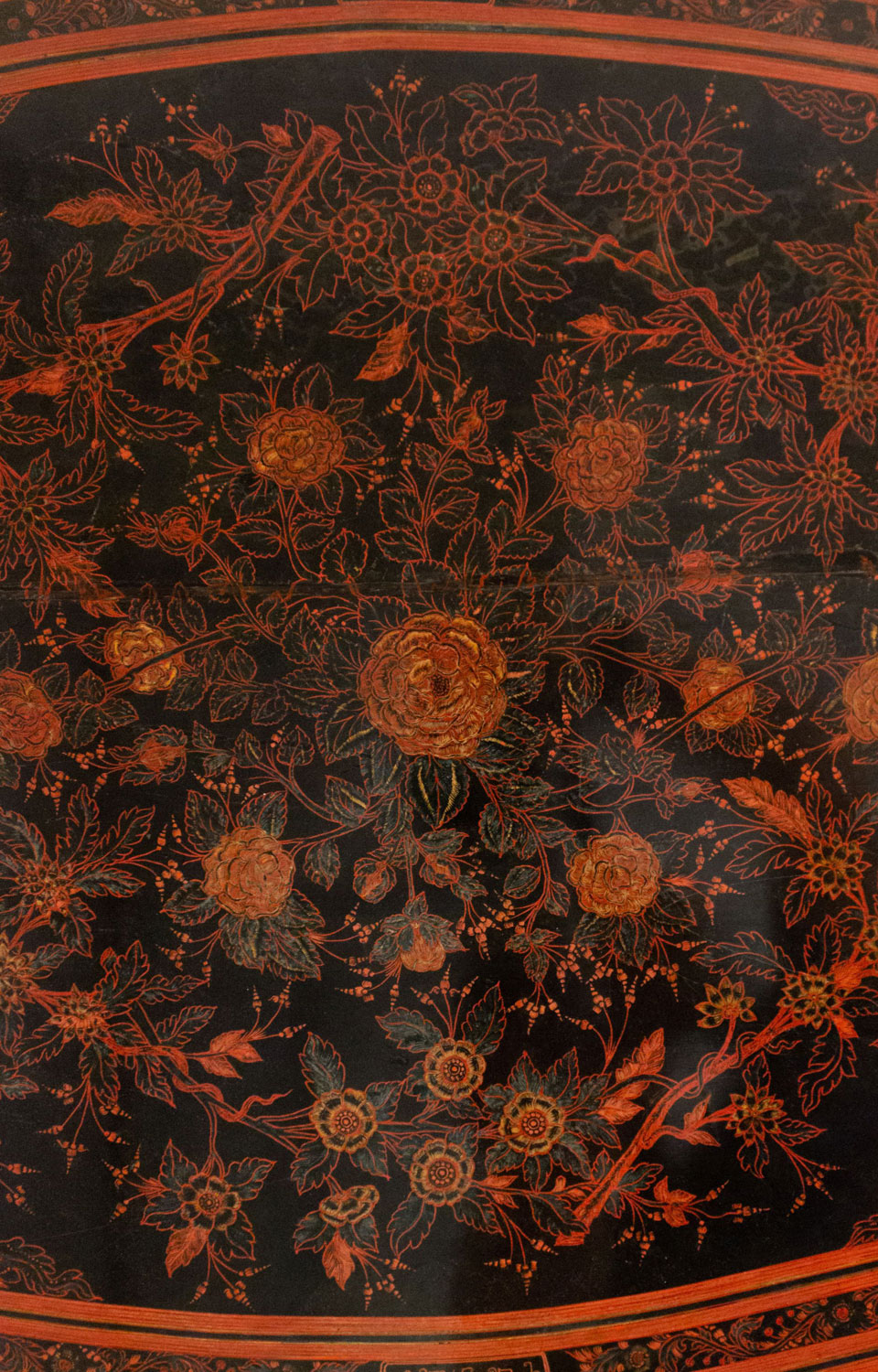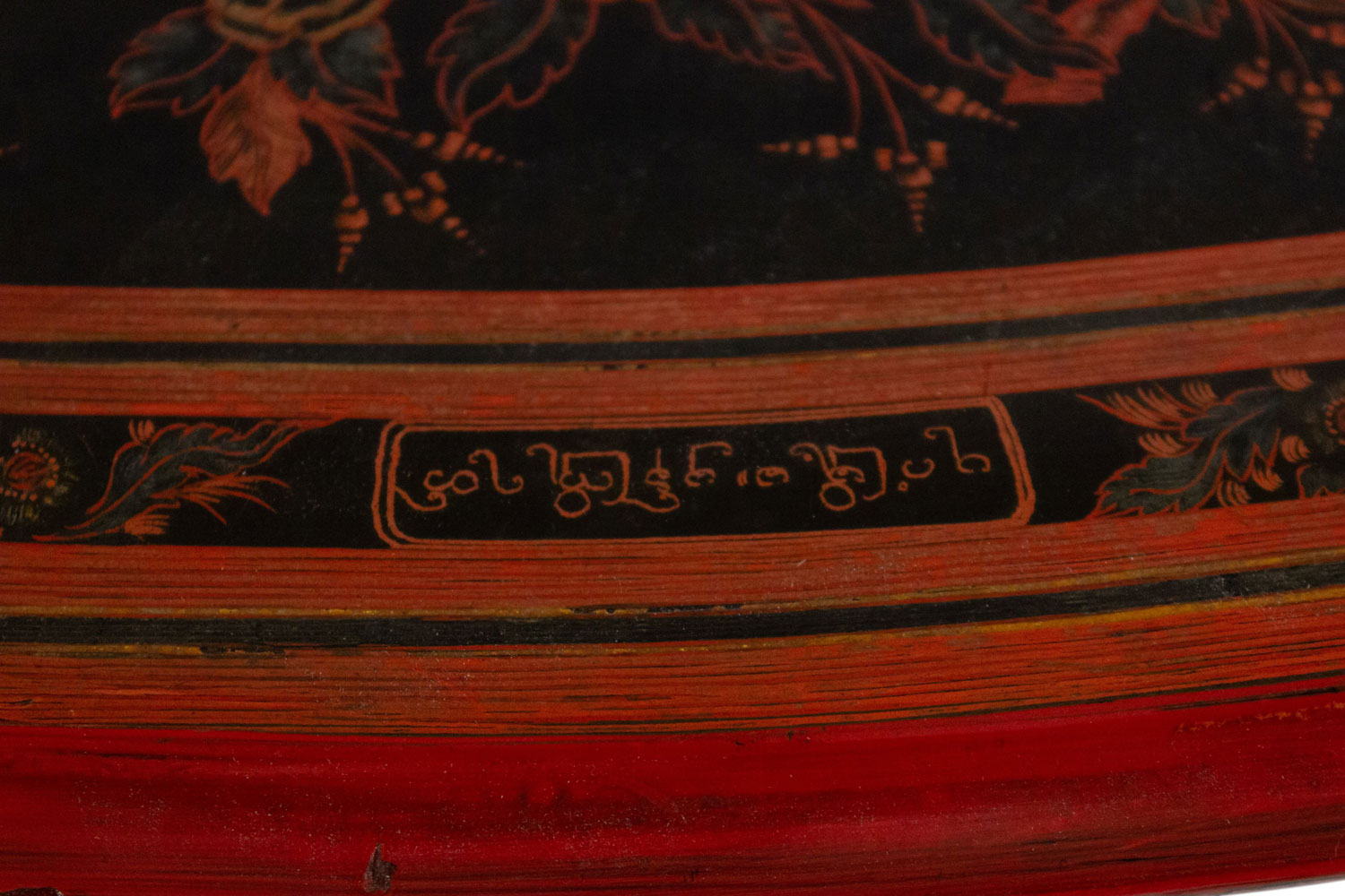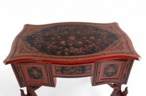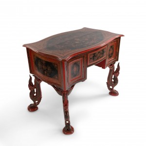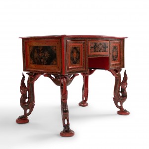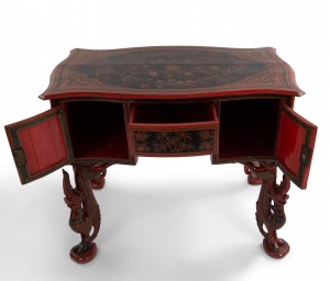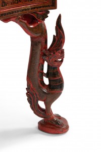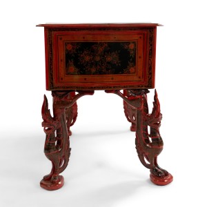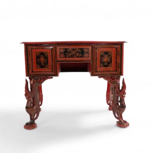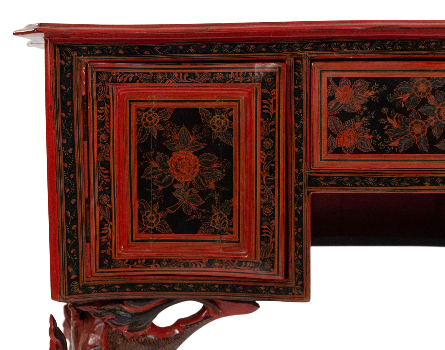 Southeast Asian style (19th Century) red lacquer decorated desk with figural bird legs.