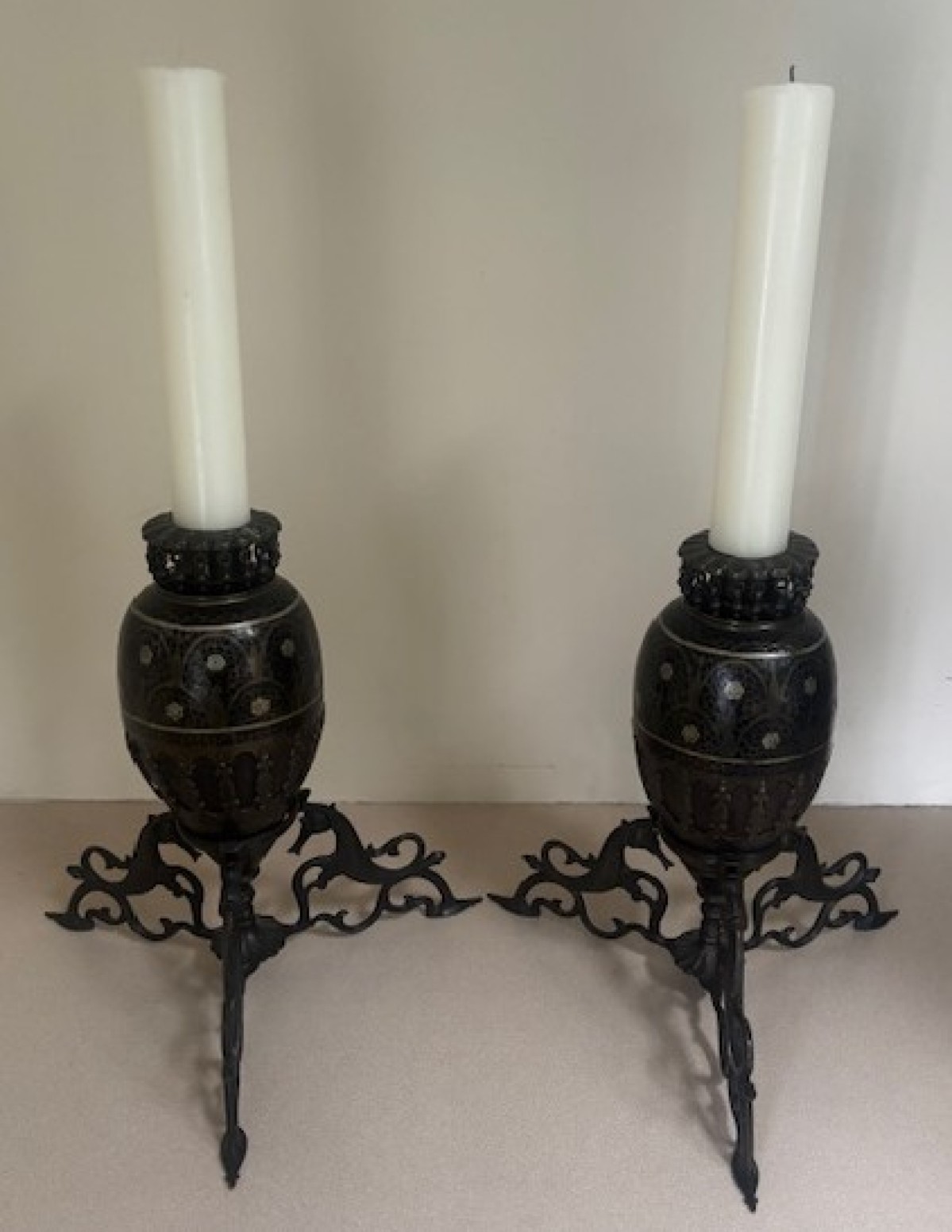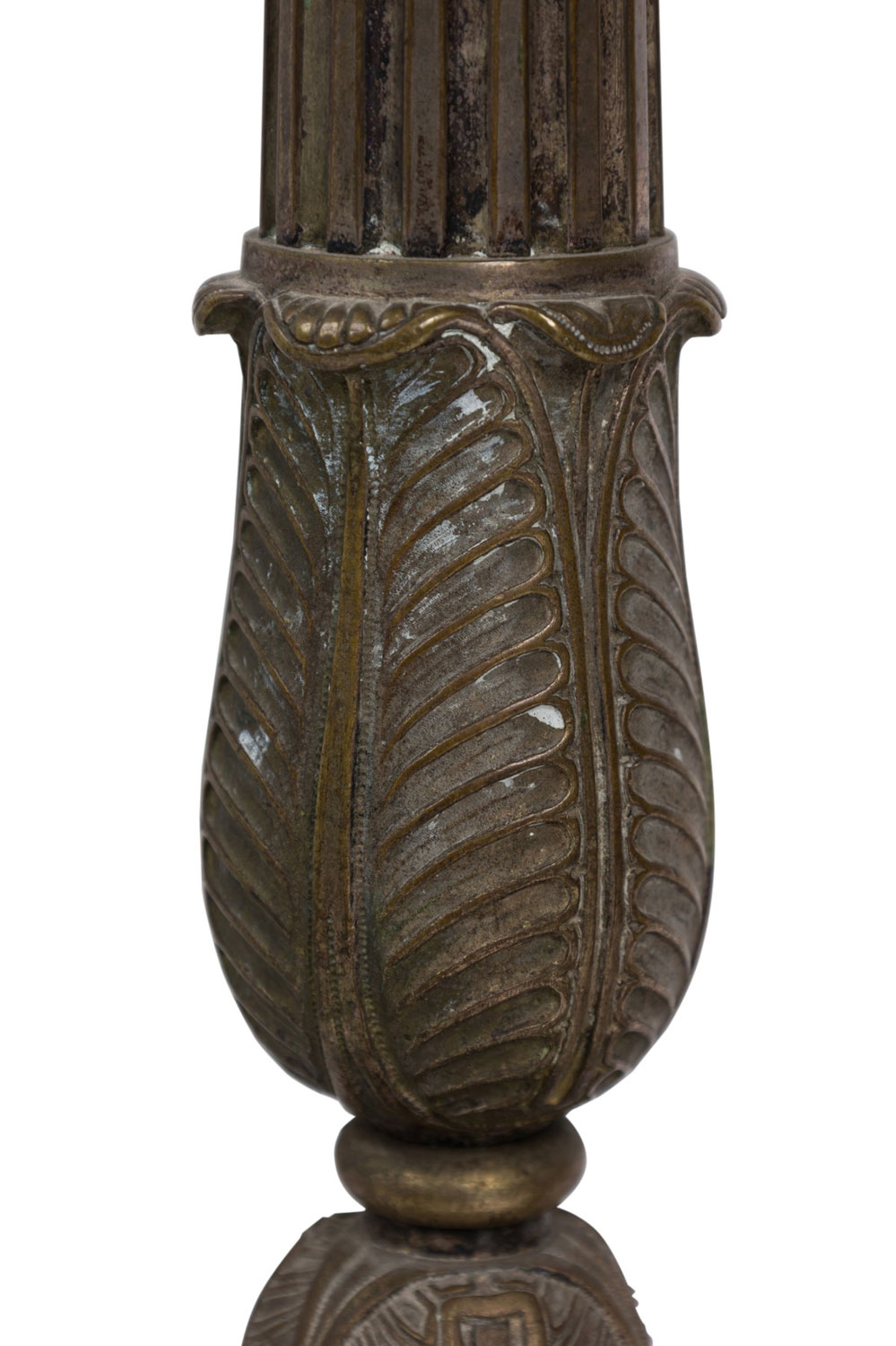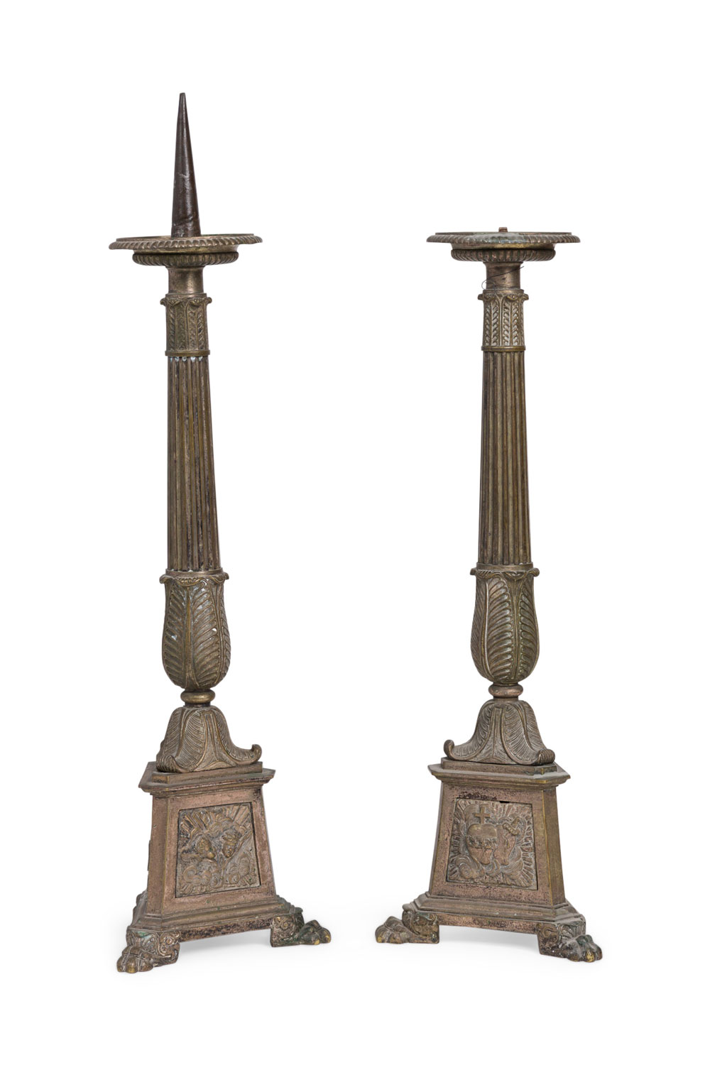 PAIR of Spanish Renaissance-style (19th Century) style silver plate fluted column altar sticks on tripod base (PRICED AS PAIR)