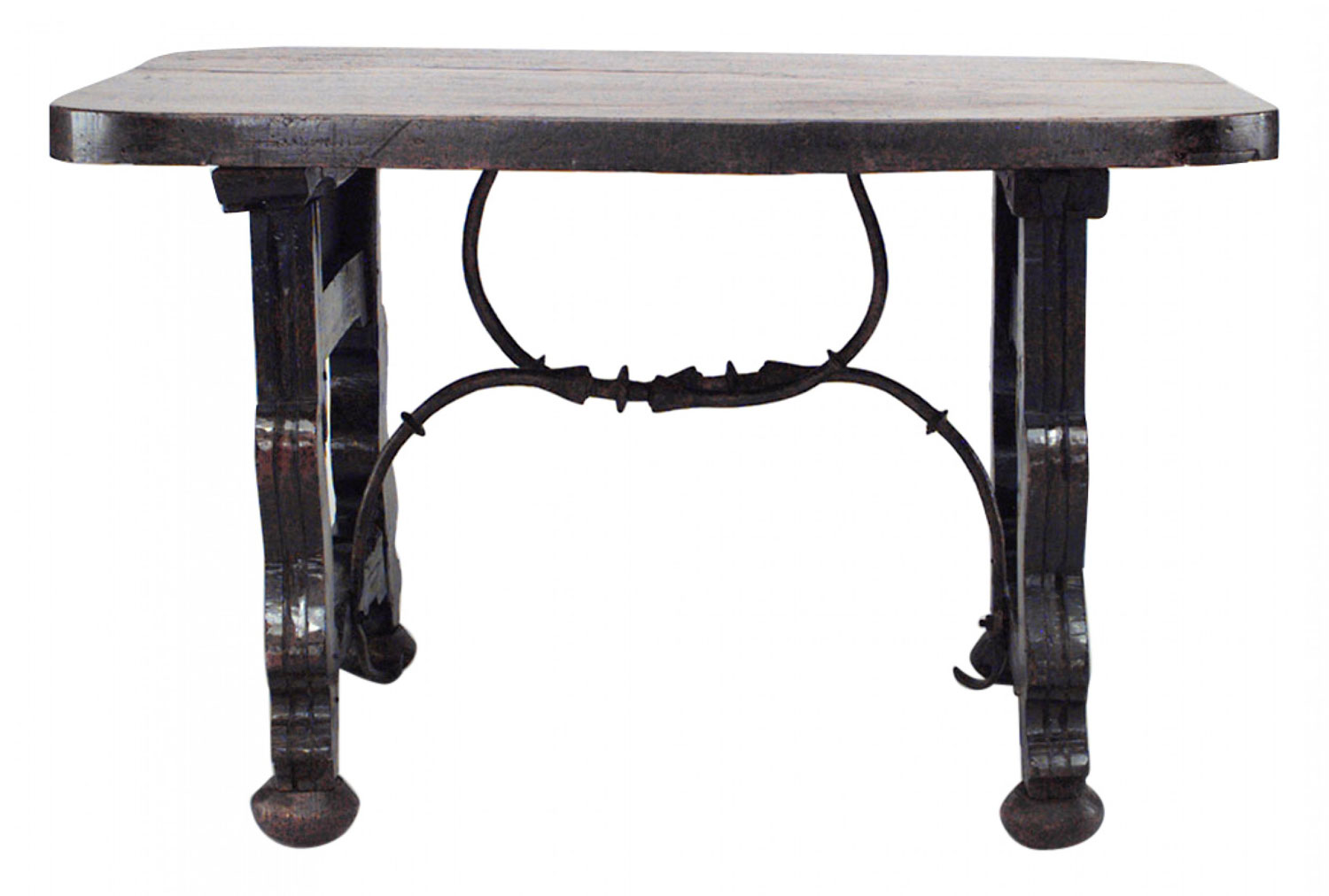 Antique Spanish Renaissance style (18/19th Century) walnut rectangular center table with plank top and double iron stretcher.