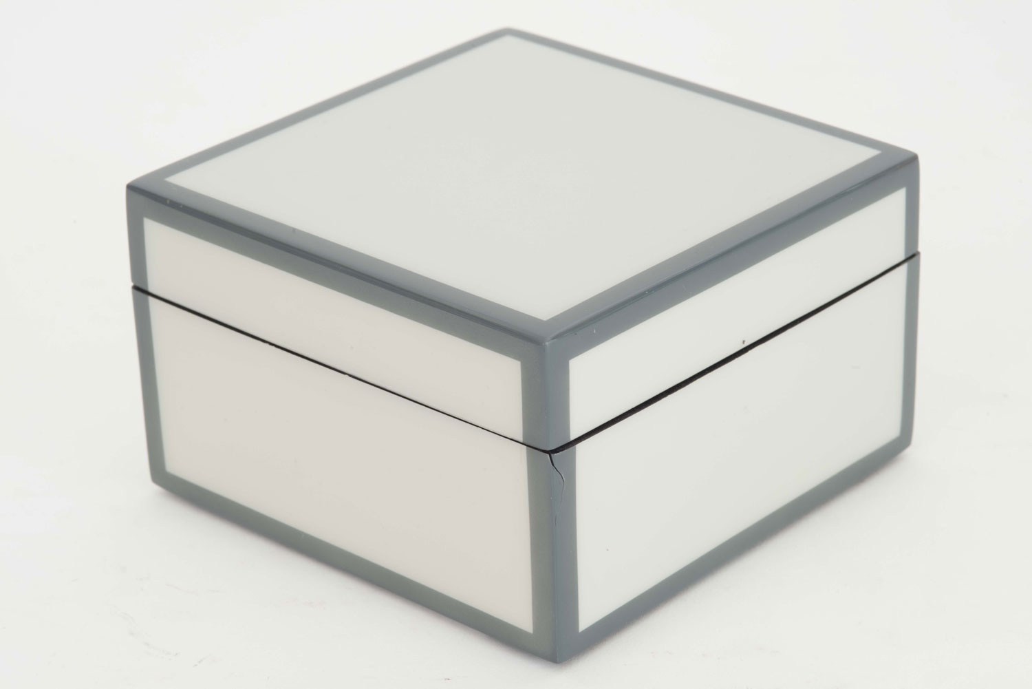 Square light gray lacquered wood box with a dark gray trim and a lift-off cover
