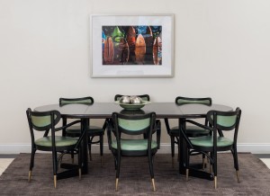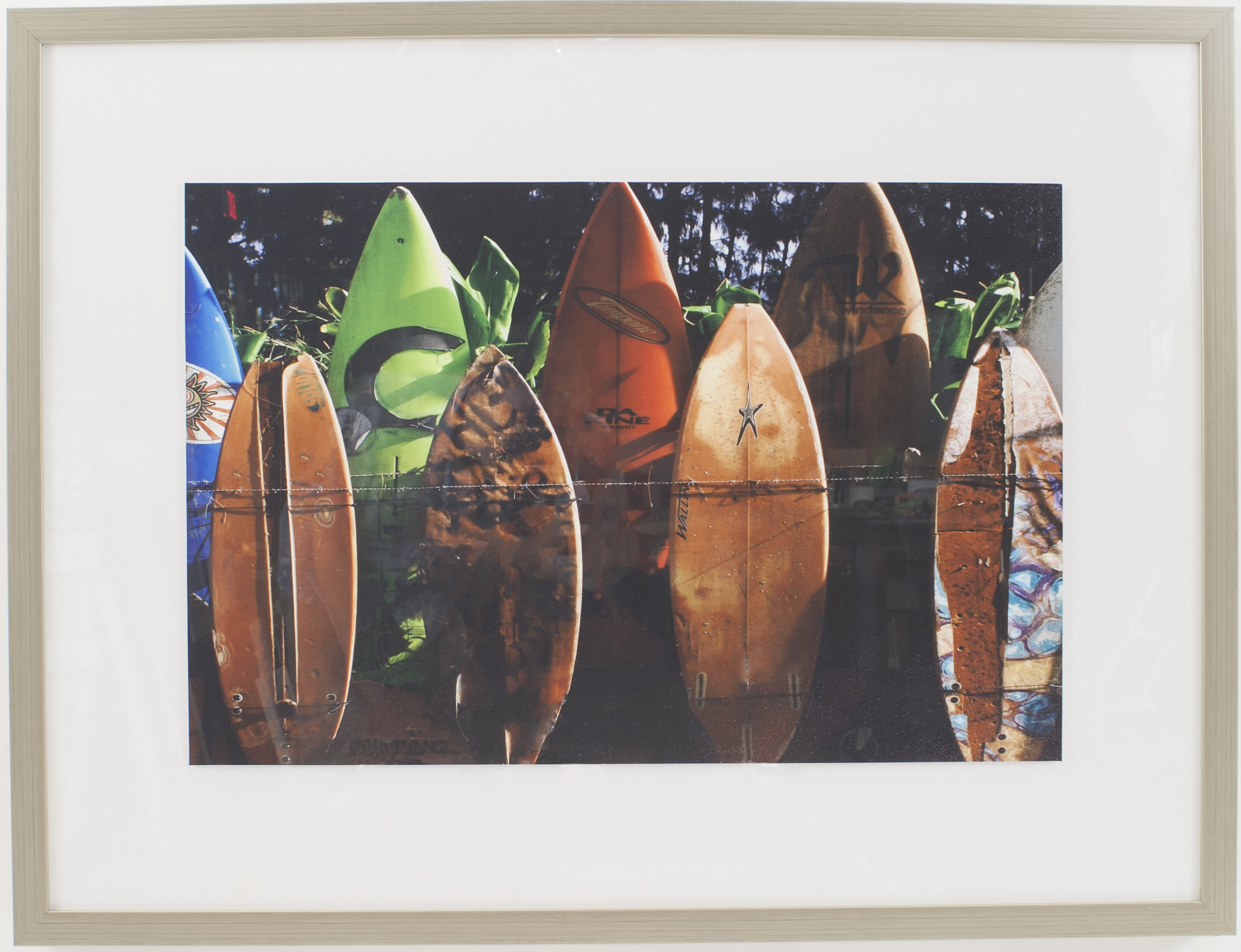 Contemporary abstract photo print of several surfboards titled, "Surfing" in white matting in a brushed silver metal rectangular frame