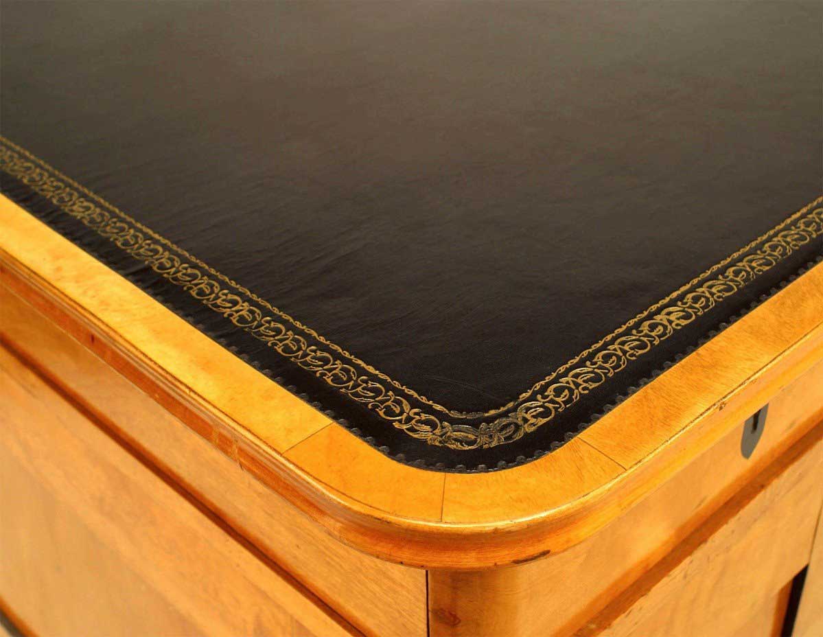 Swedish Biedermeier style (19/20th Century) birch and black trimmed kneehole desk with black leather top.