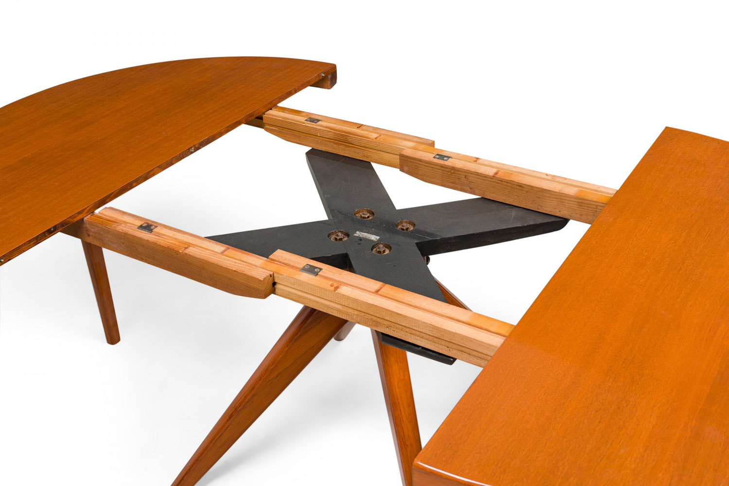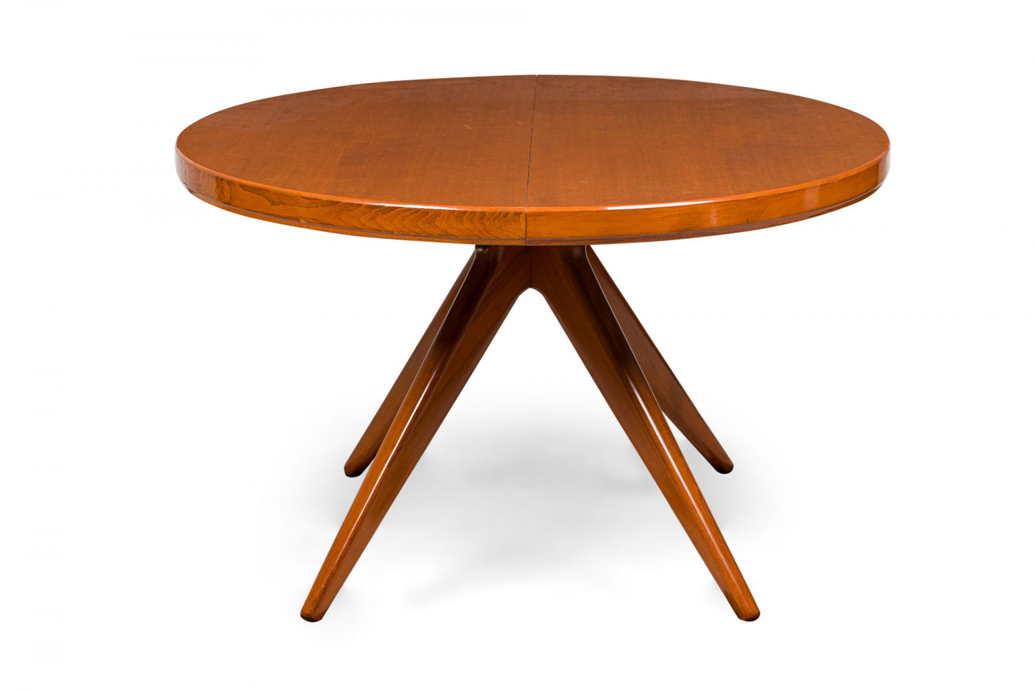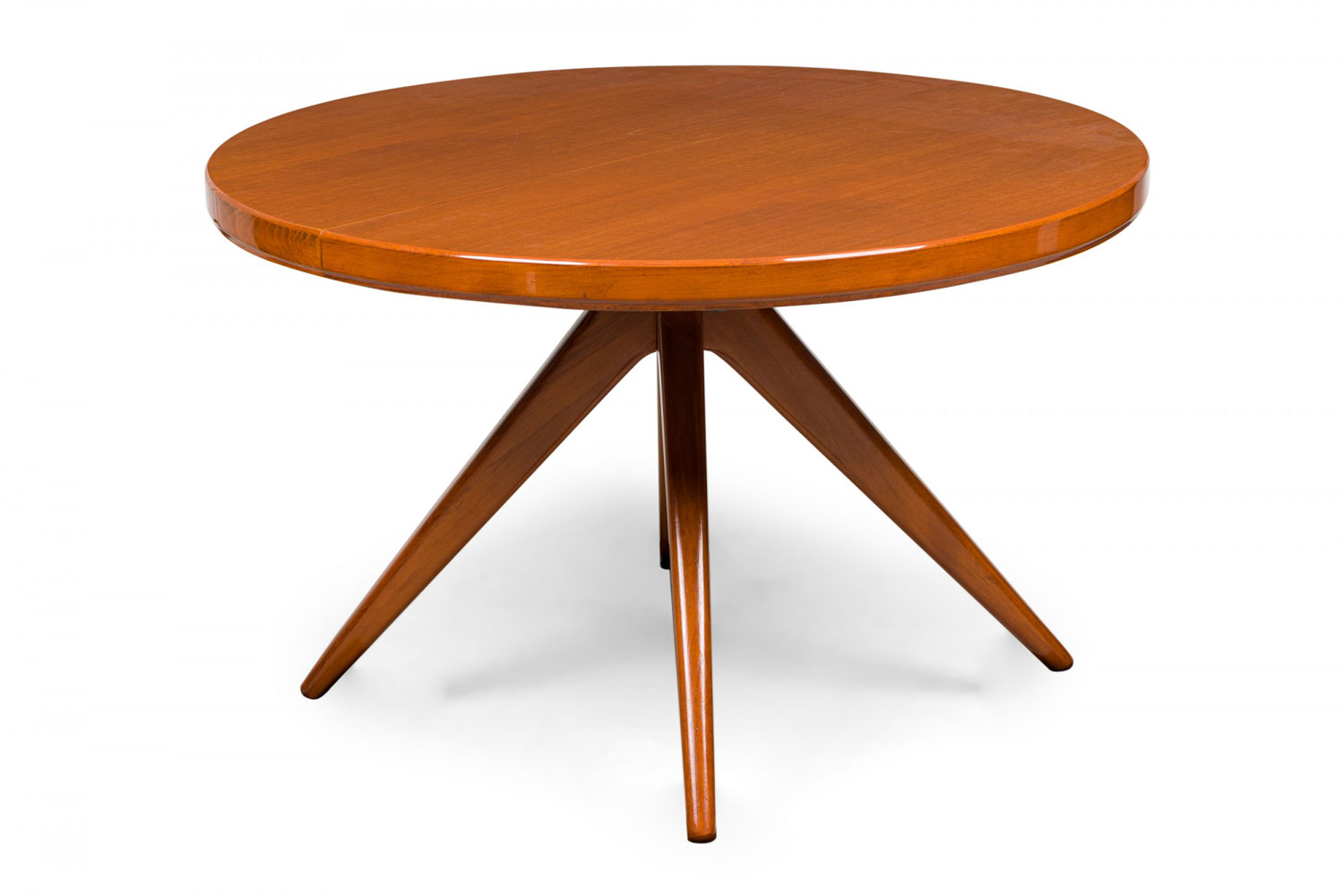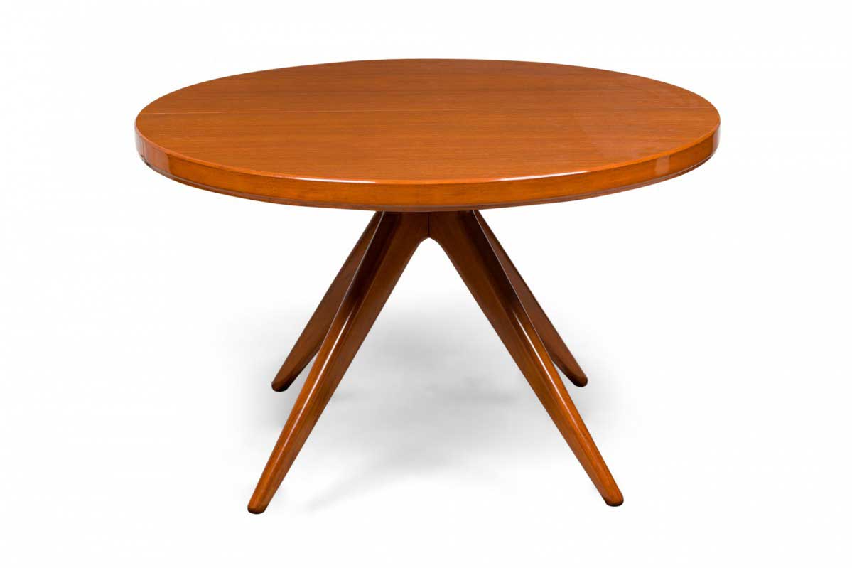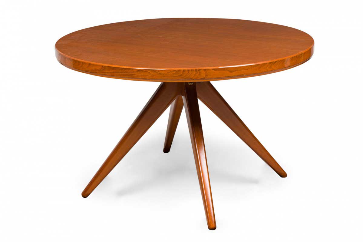 Swedish Mid-Century Modern circular extension dining / center table with two removable leaves, resting on four center-mounted tapered wooden legs.