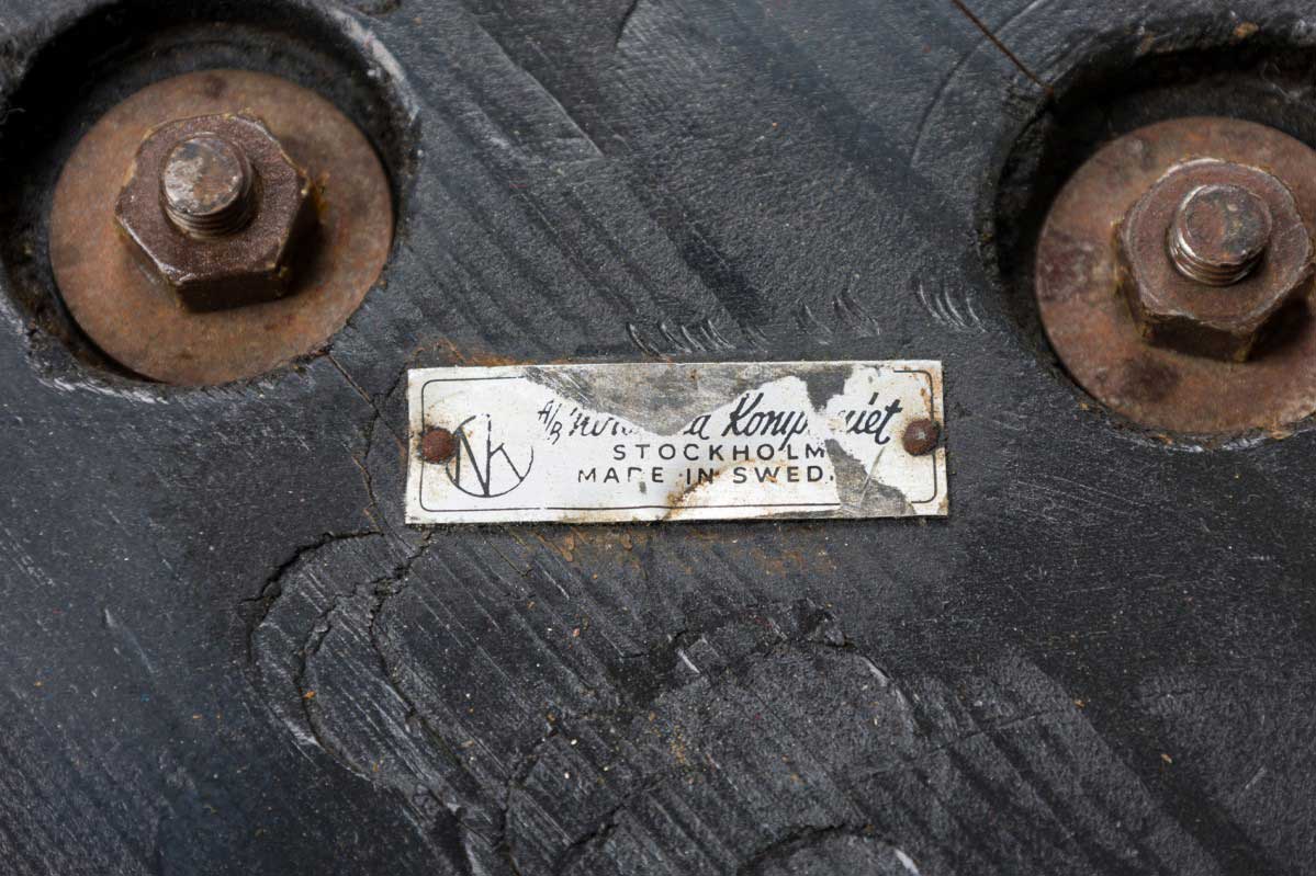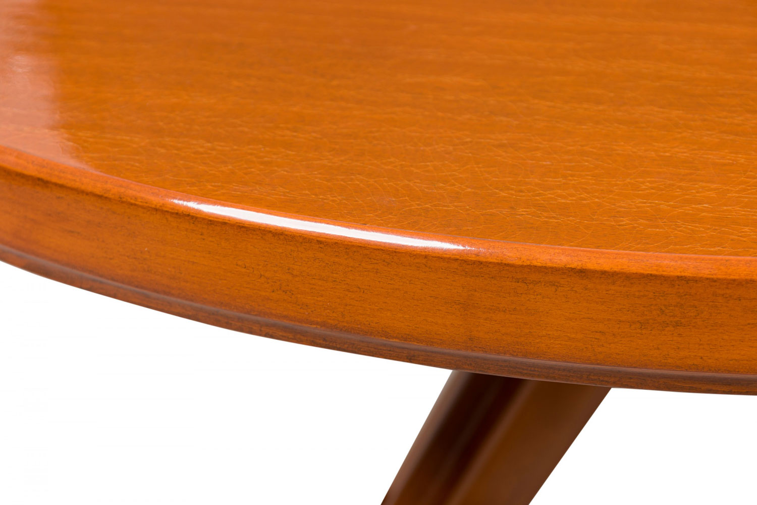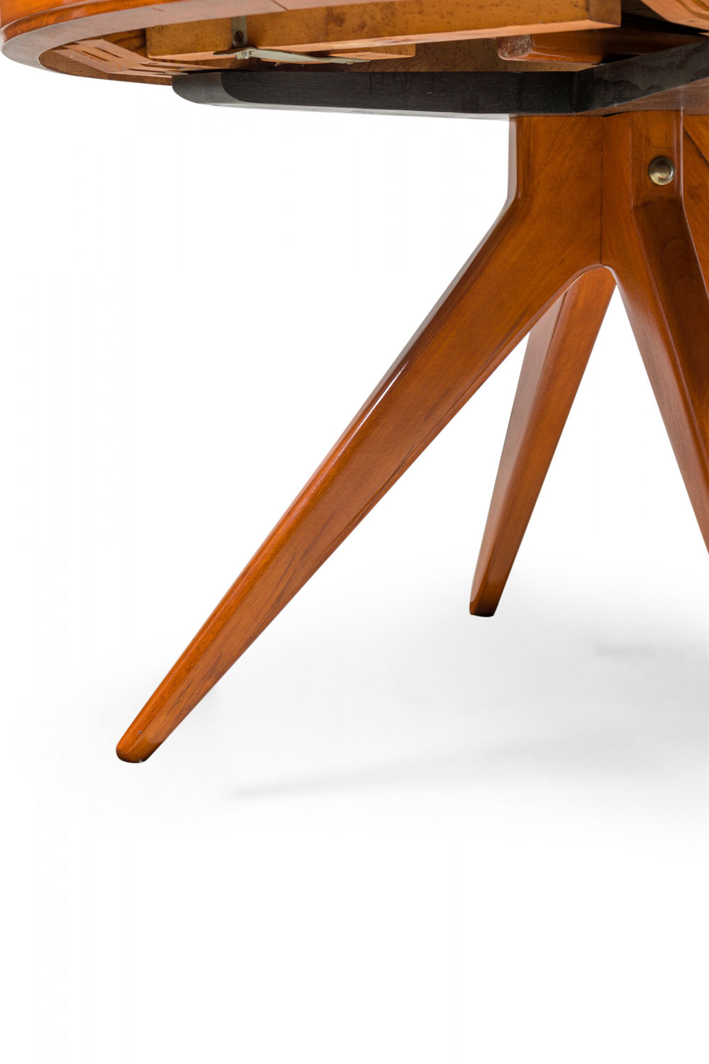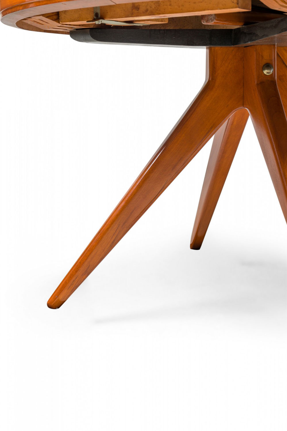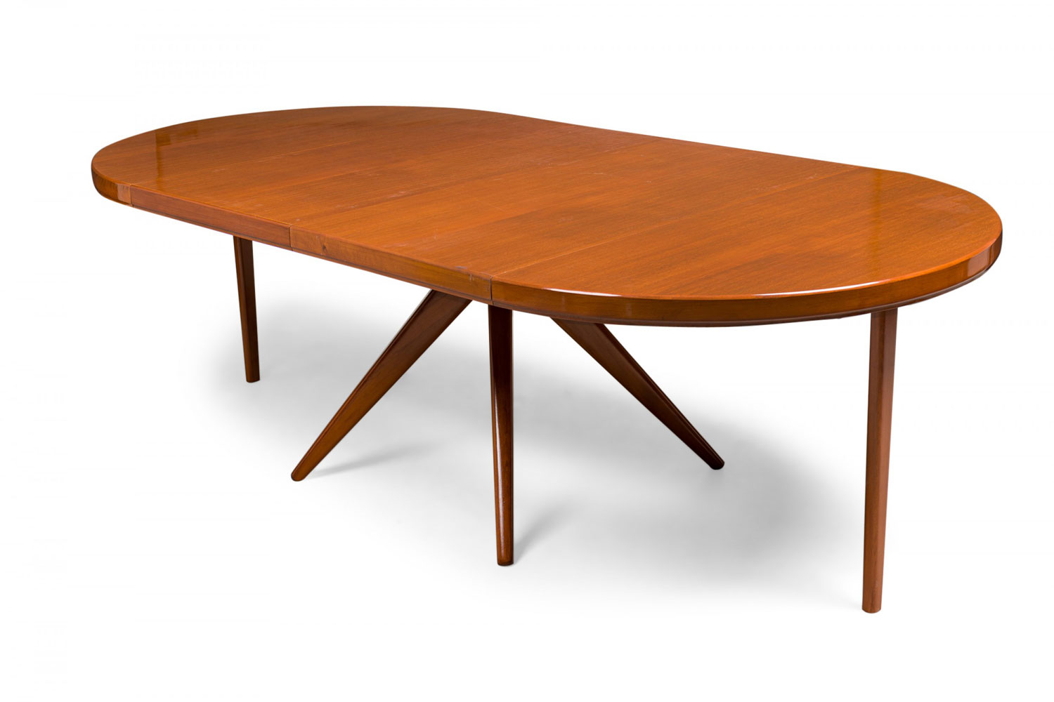 Swedish Mid-Century Modern circular extension dining / center table with two removable leaves, resting on four center-mounted tapered wooden legs.