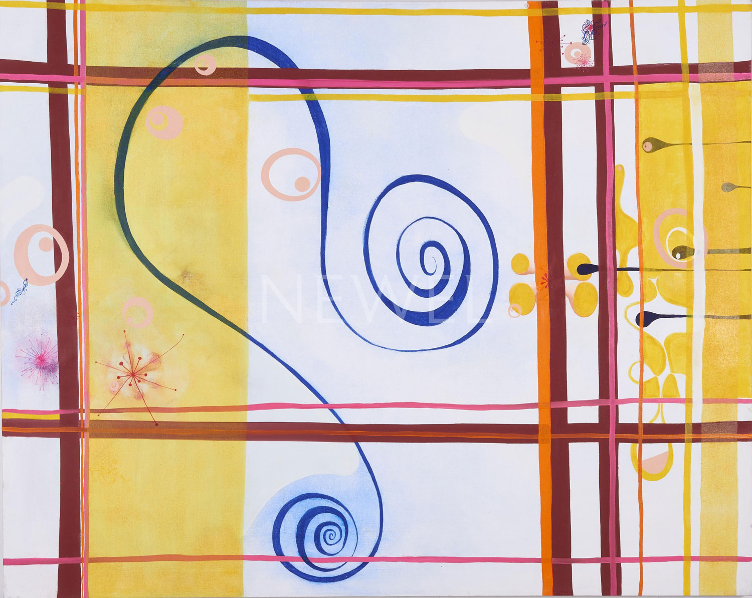 Contemporary abstract painting of multicolored shapes titled, "Swirly Blue Thing" on canvas (Similar pieces: AAP136, AAP137, AAP138, AAP140)