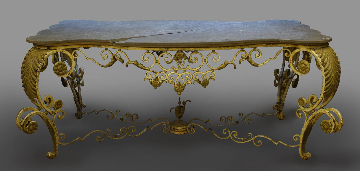 Outdoor French Victorian white painted iron rmonumental ectangular center table with scrolled & cabriole legs and a stretcher having floral decoration & finial with a grey marble top (as is)