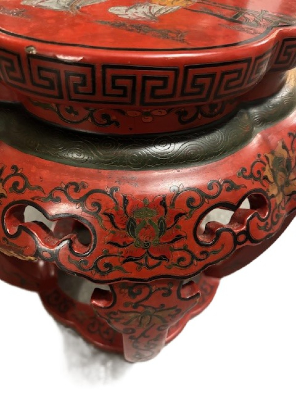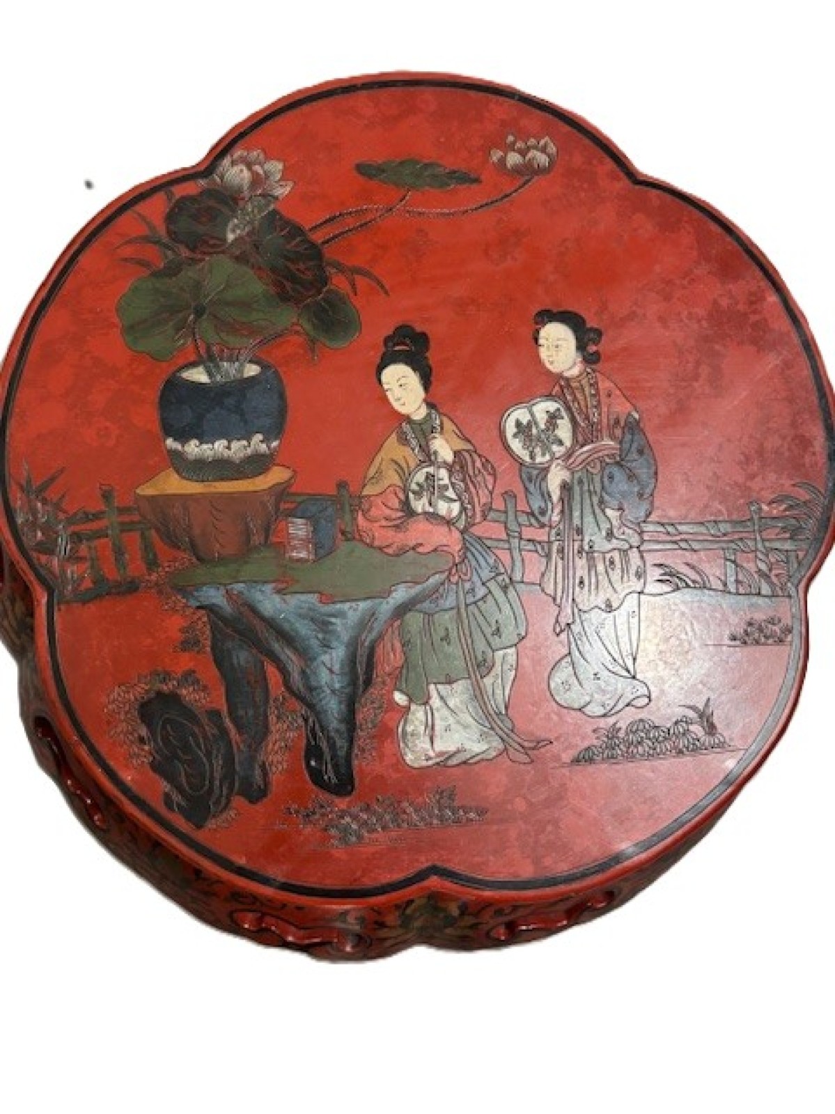 Asian Chinese style (Mid-20th Cent) red coromandel 5 leg taboret with stretcher and Chinoiserie decorated scene top and trim