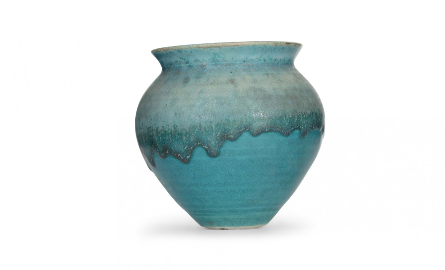 Wide bodied, tapered ceramic vase with teal-colored drip glaze and a wide opening