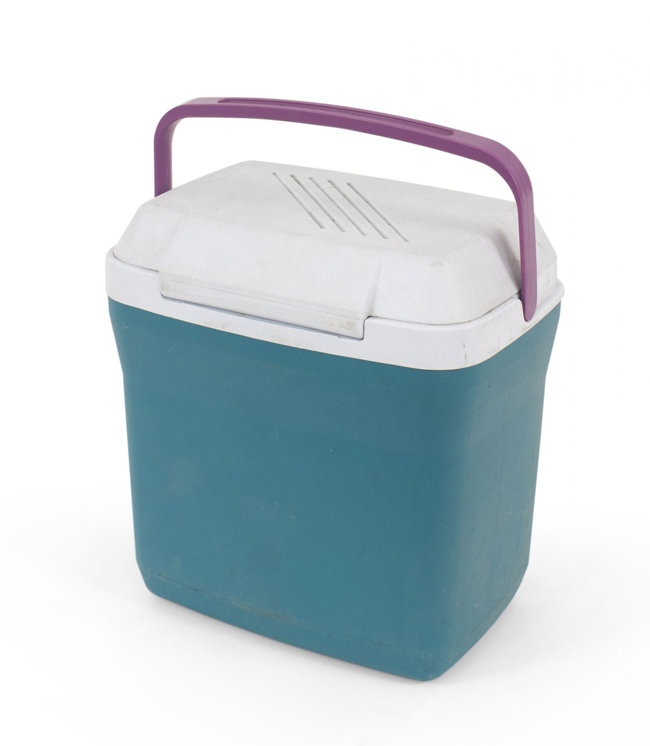 Green and white plastic lunchbox/cooler with a hinged lid and a square purple handle