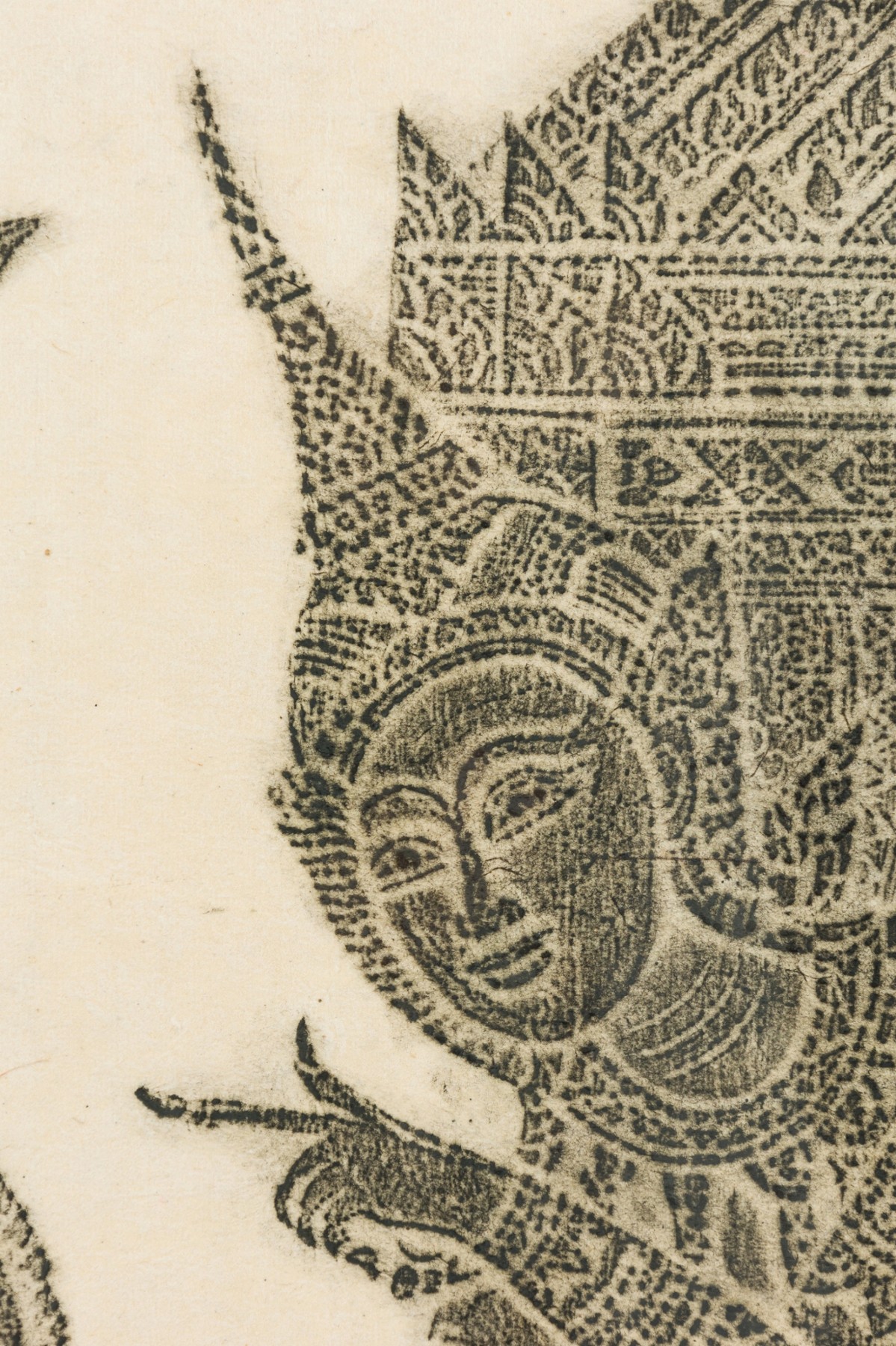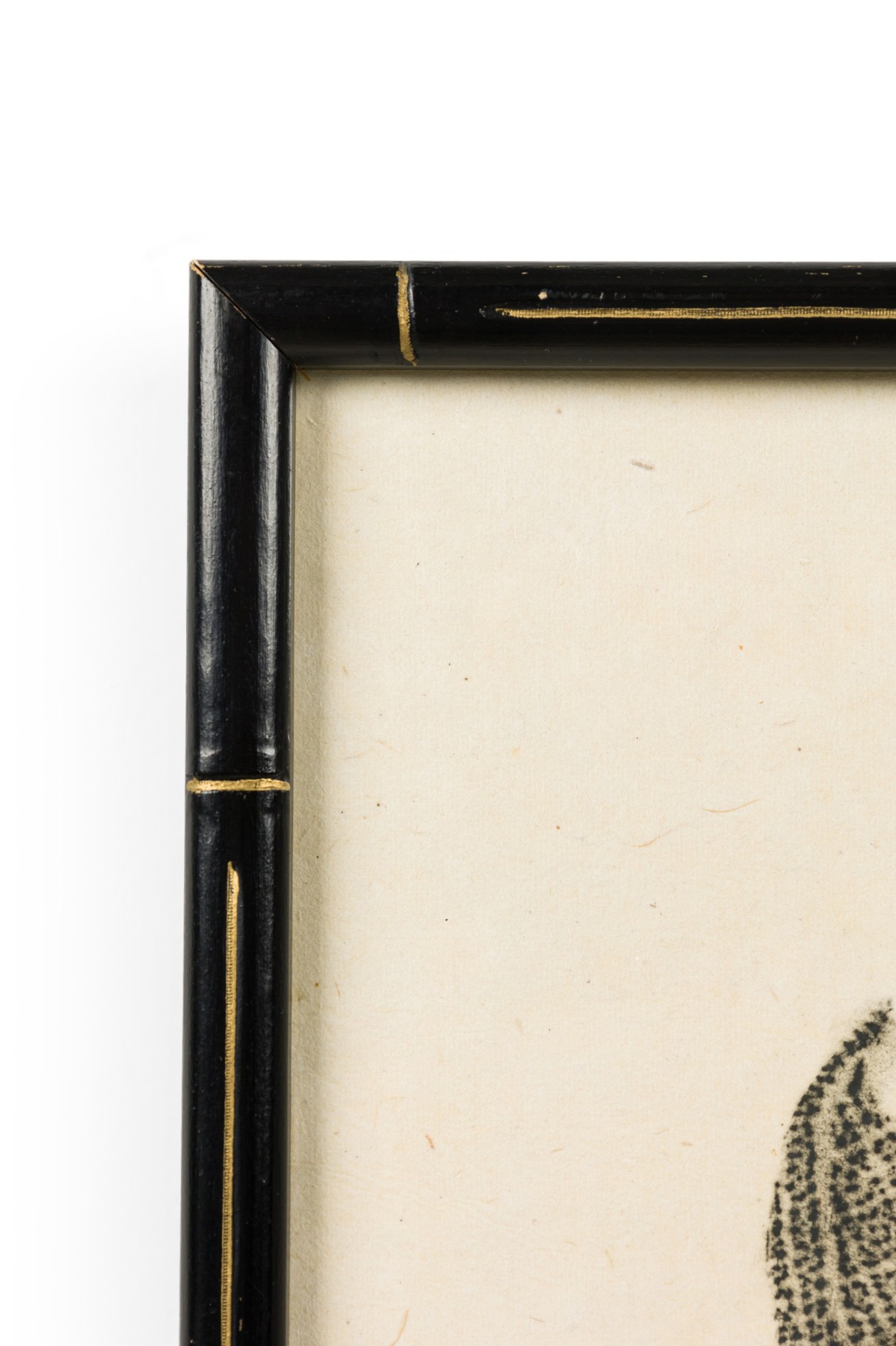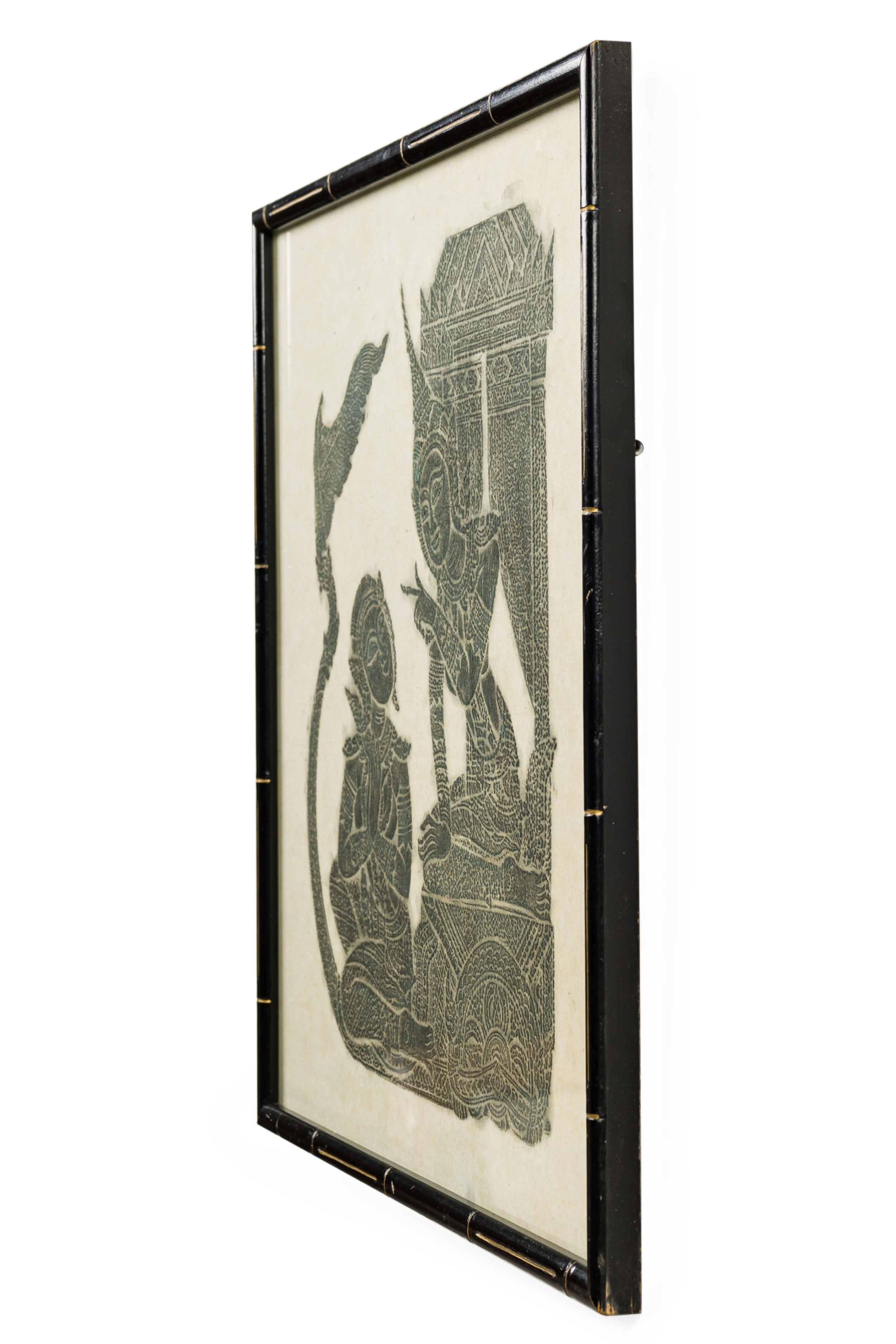 Thai Charcoal Rubbing of a scene with religious Siamese figures of a man and a wome sitting in a temple in a black and gilt trim faux bamboo frame (similar item: NWL7051)