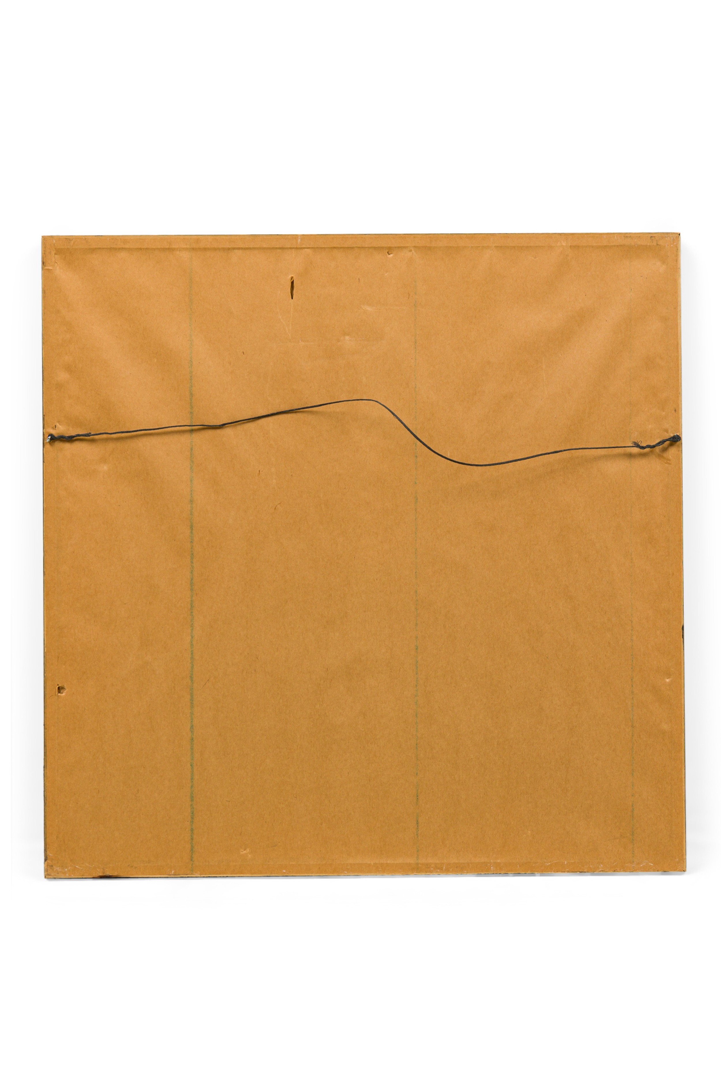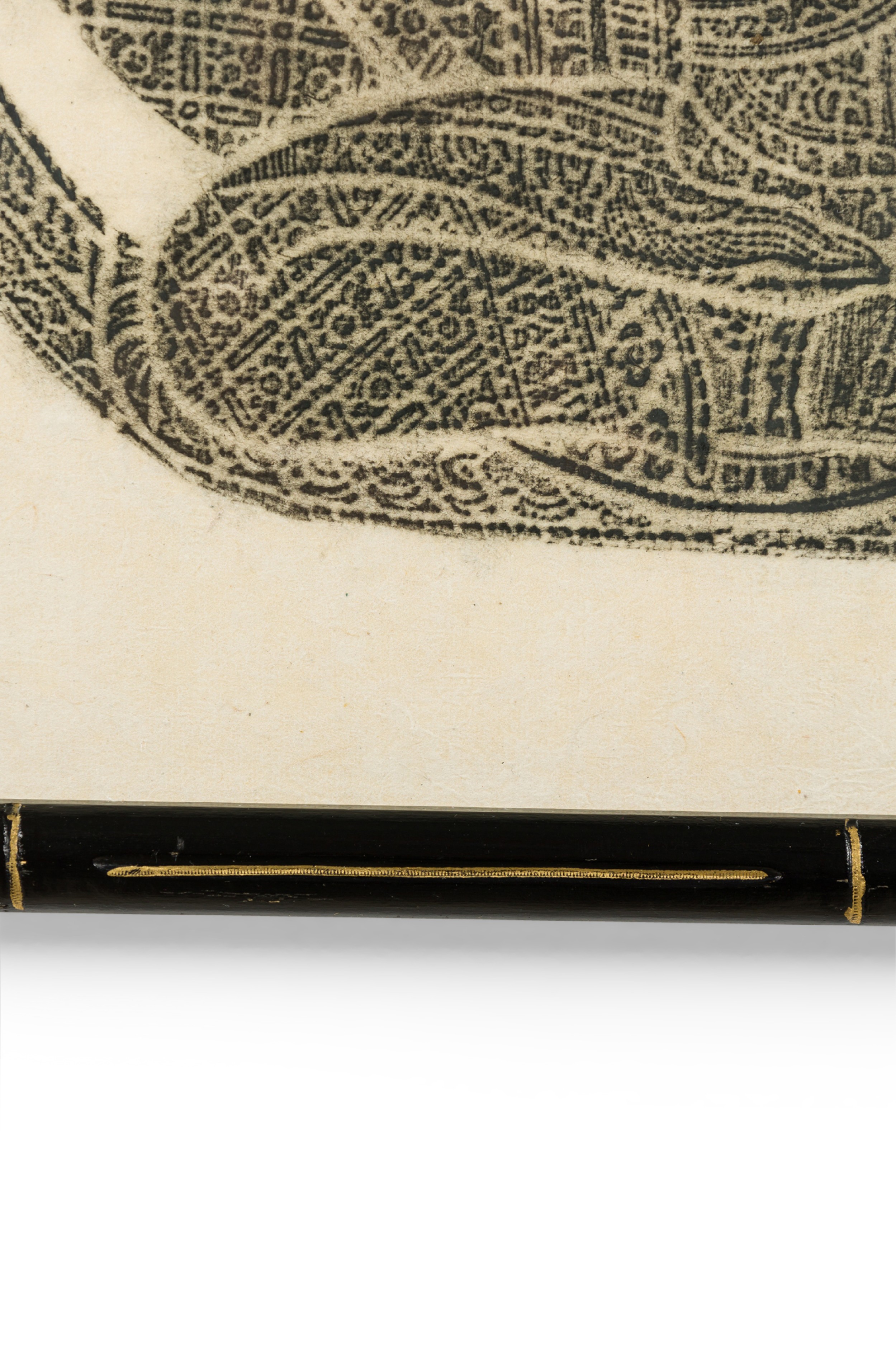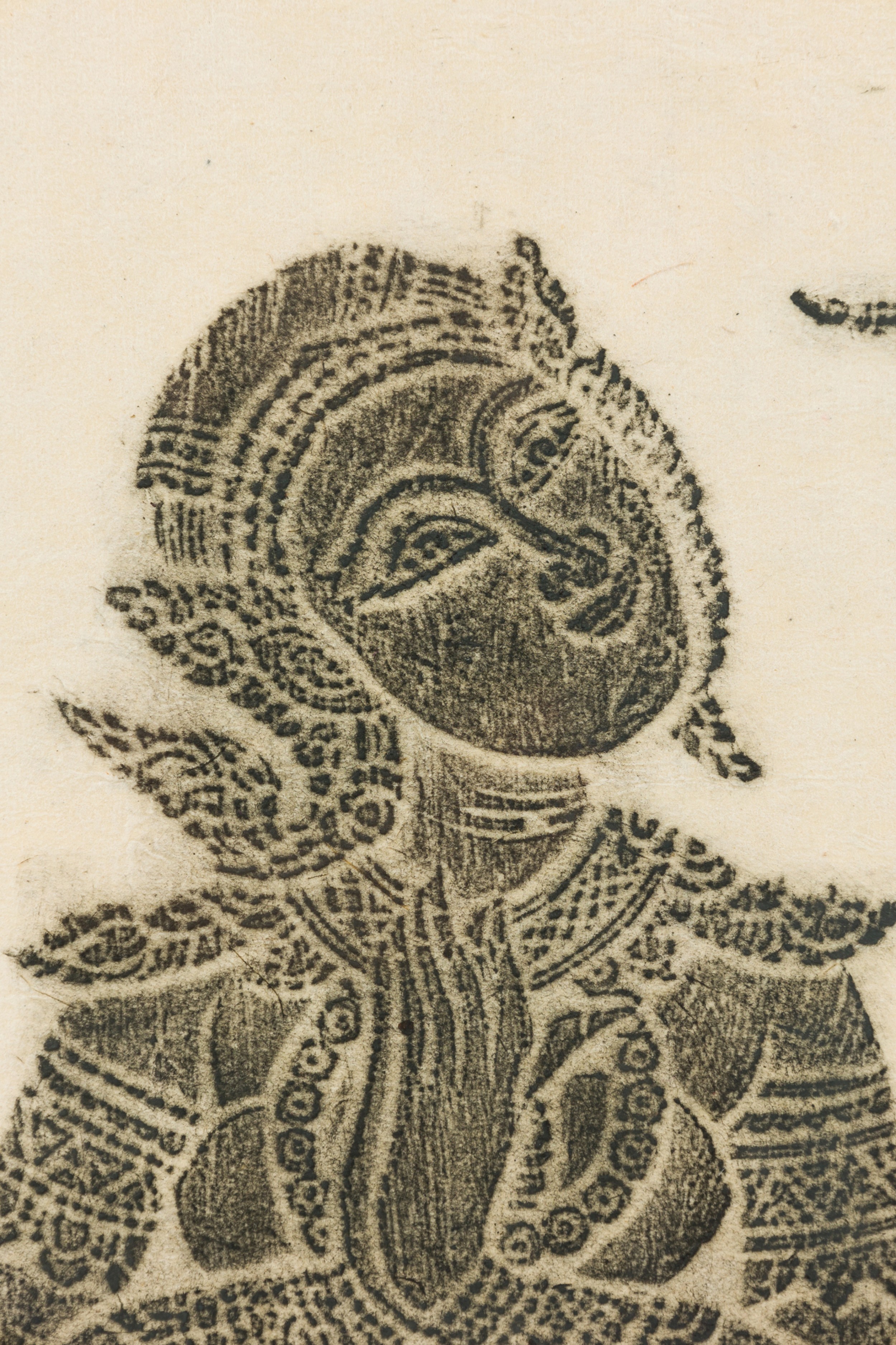 Thai Charcoal Rubbing of a scene with religious Siamese figures of a man and a wome sitting in a temple in a black and gilt trim faux bamboo frame (similar item: NWL7051)