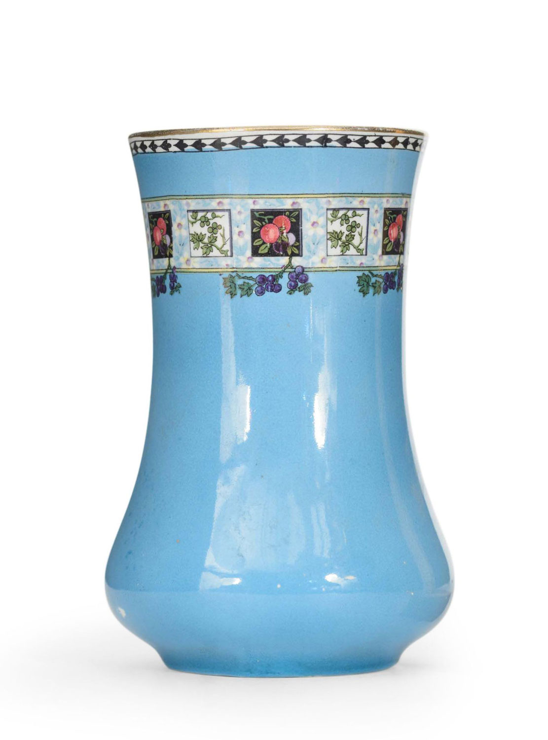 Vintage tapered cylindrical turquoise glazed vase with a gilded rim and decorative band with floral design
