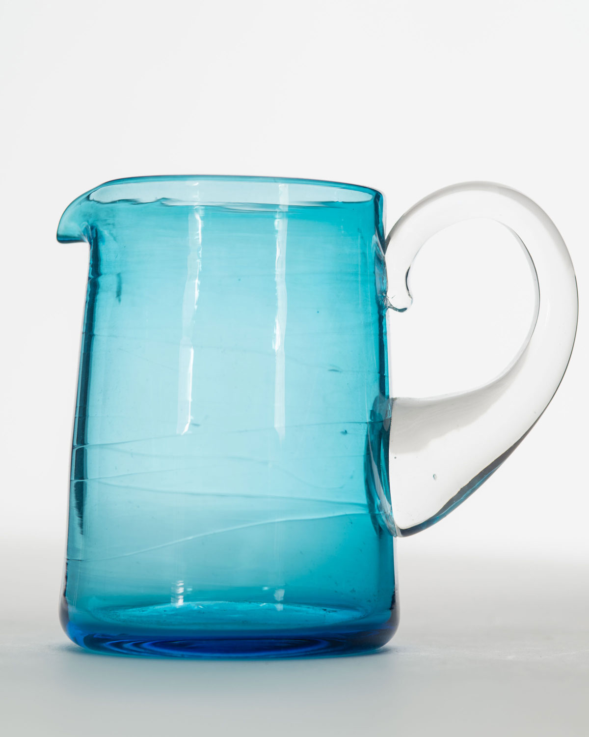Small tapered turquoise tinted blown glass pitcher with a clear glass handle