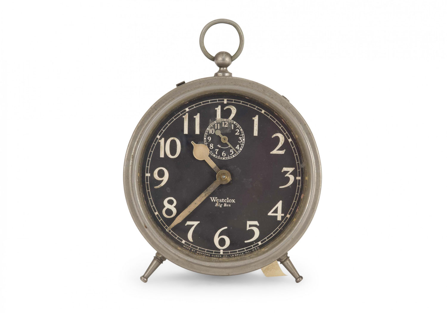 American Victorian-style round metal alarm clock with feet, a black face and white numbers