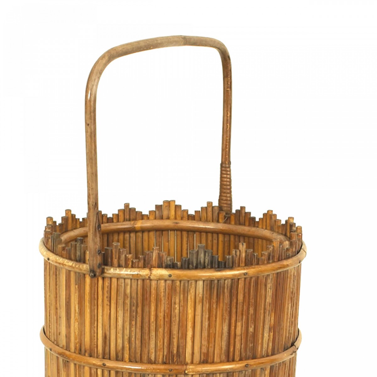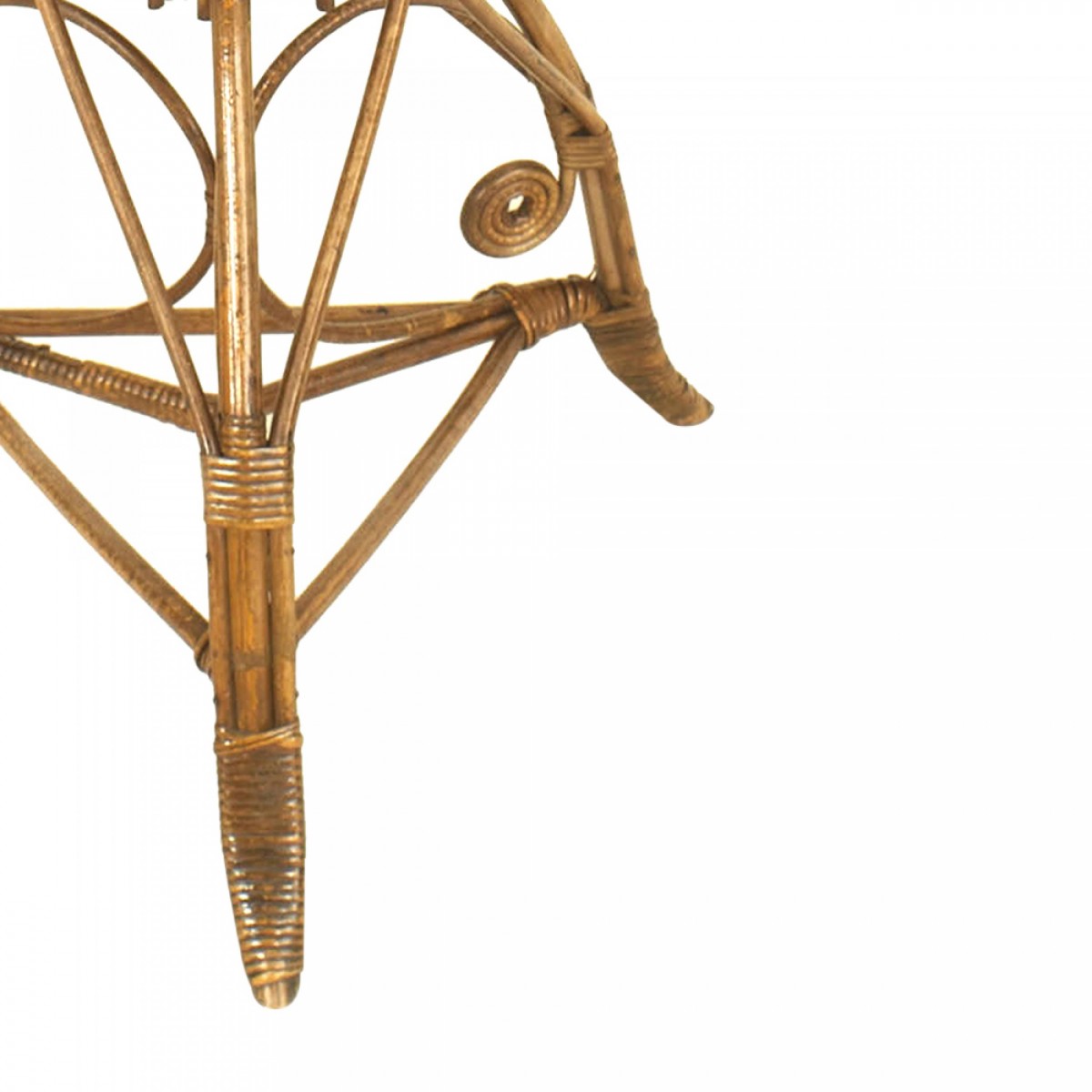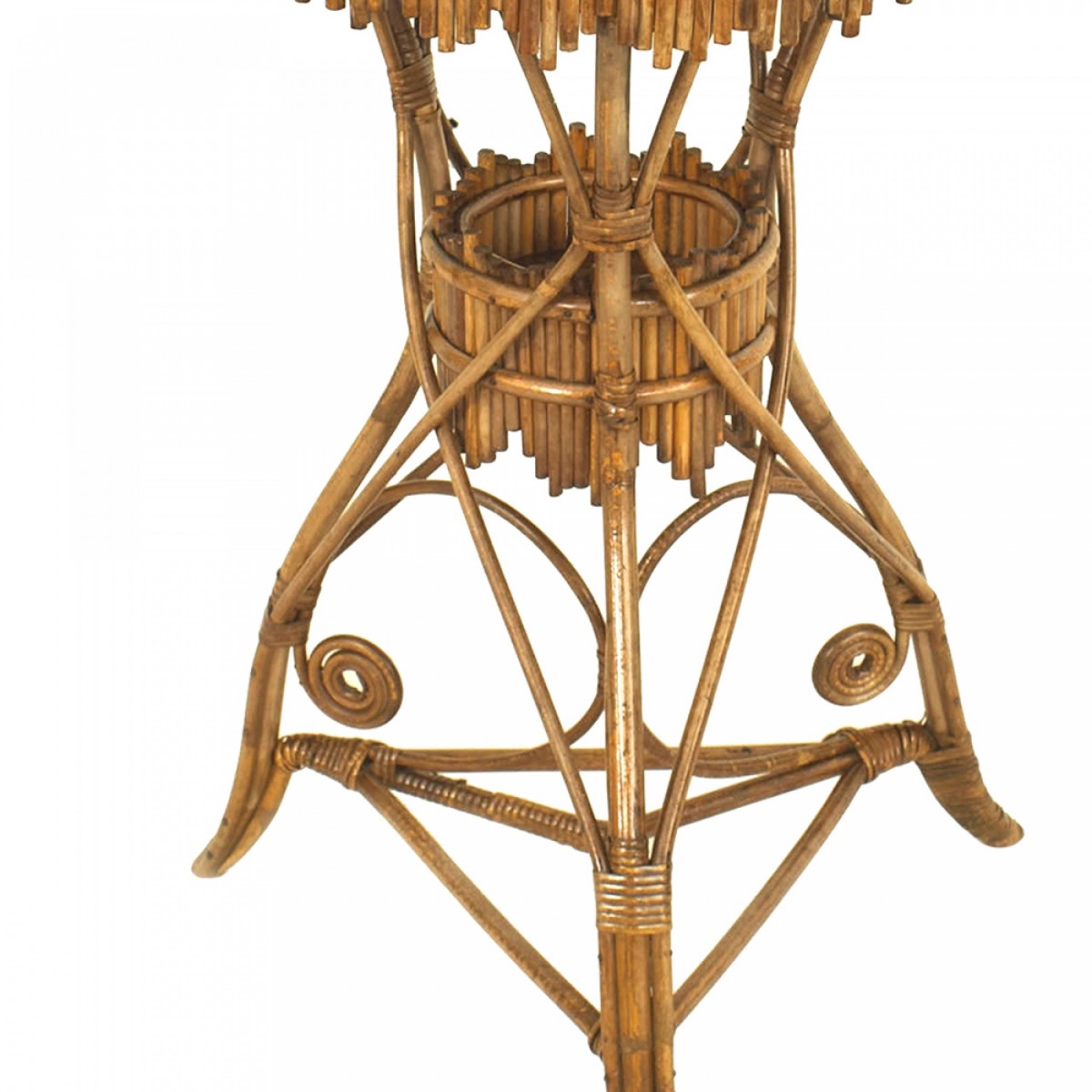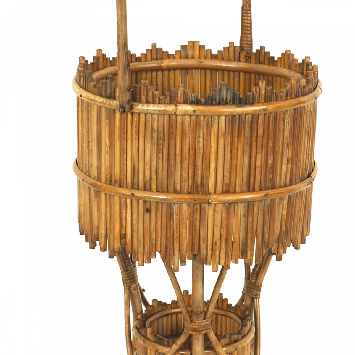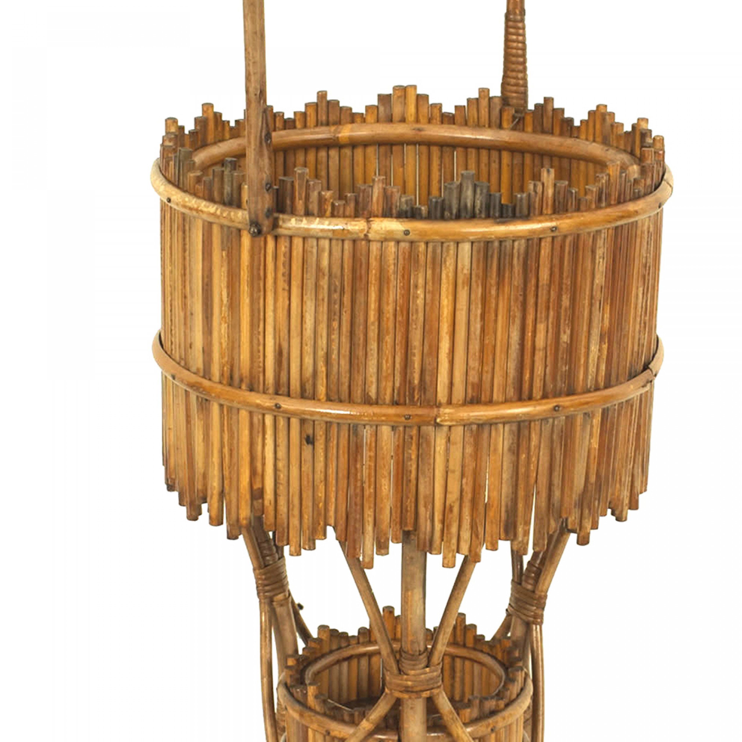 American Victorian natural stick round wicker fernery with a small shelf and supported on 3 legs.