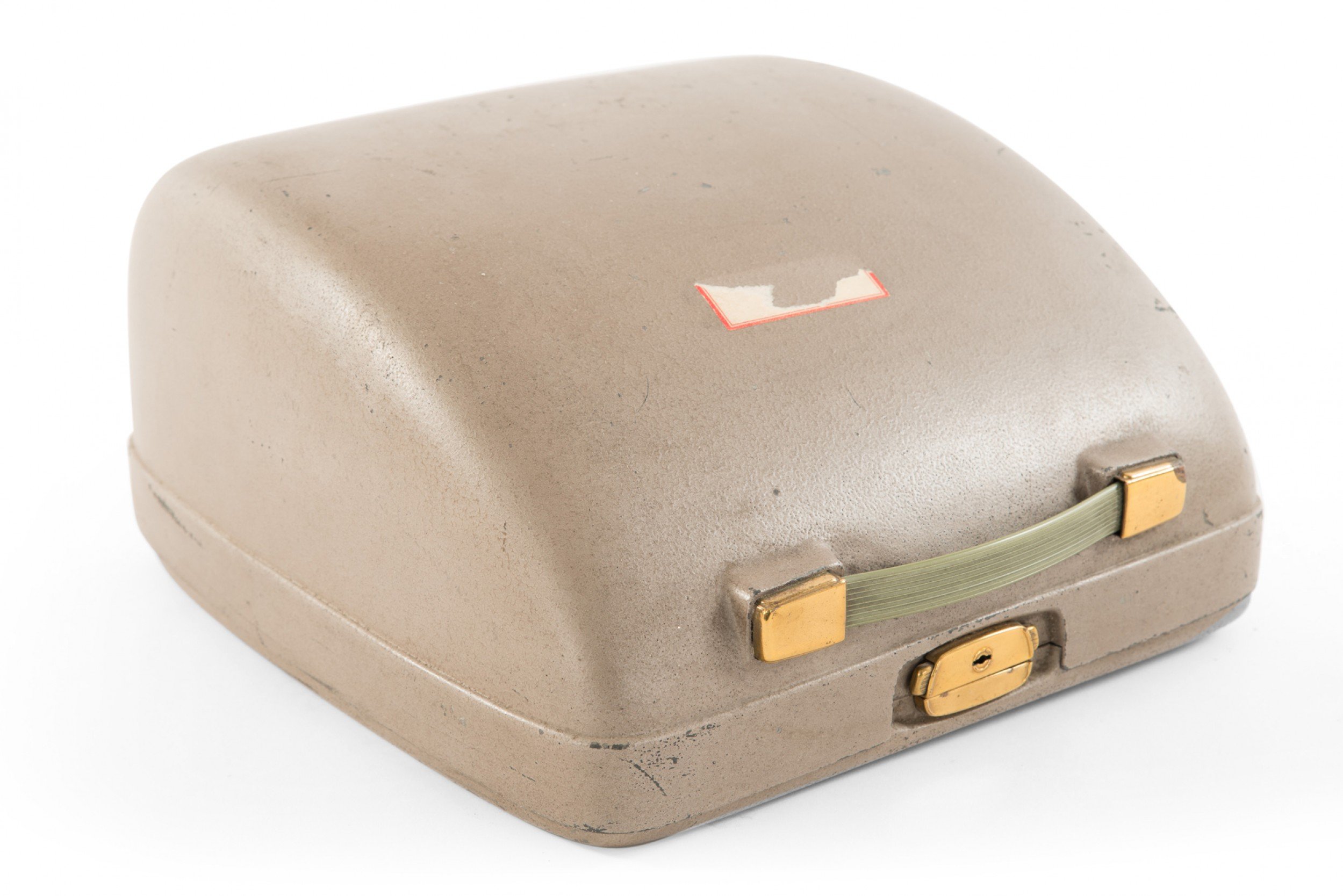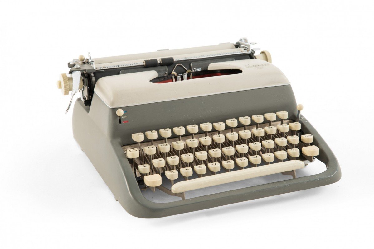 Vintage 1960s Everest K2 Deluxe portable light and dark gray metal typewriter with square gray keys and original brown metal travel case