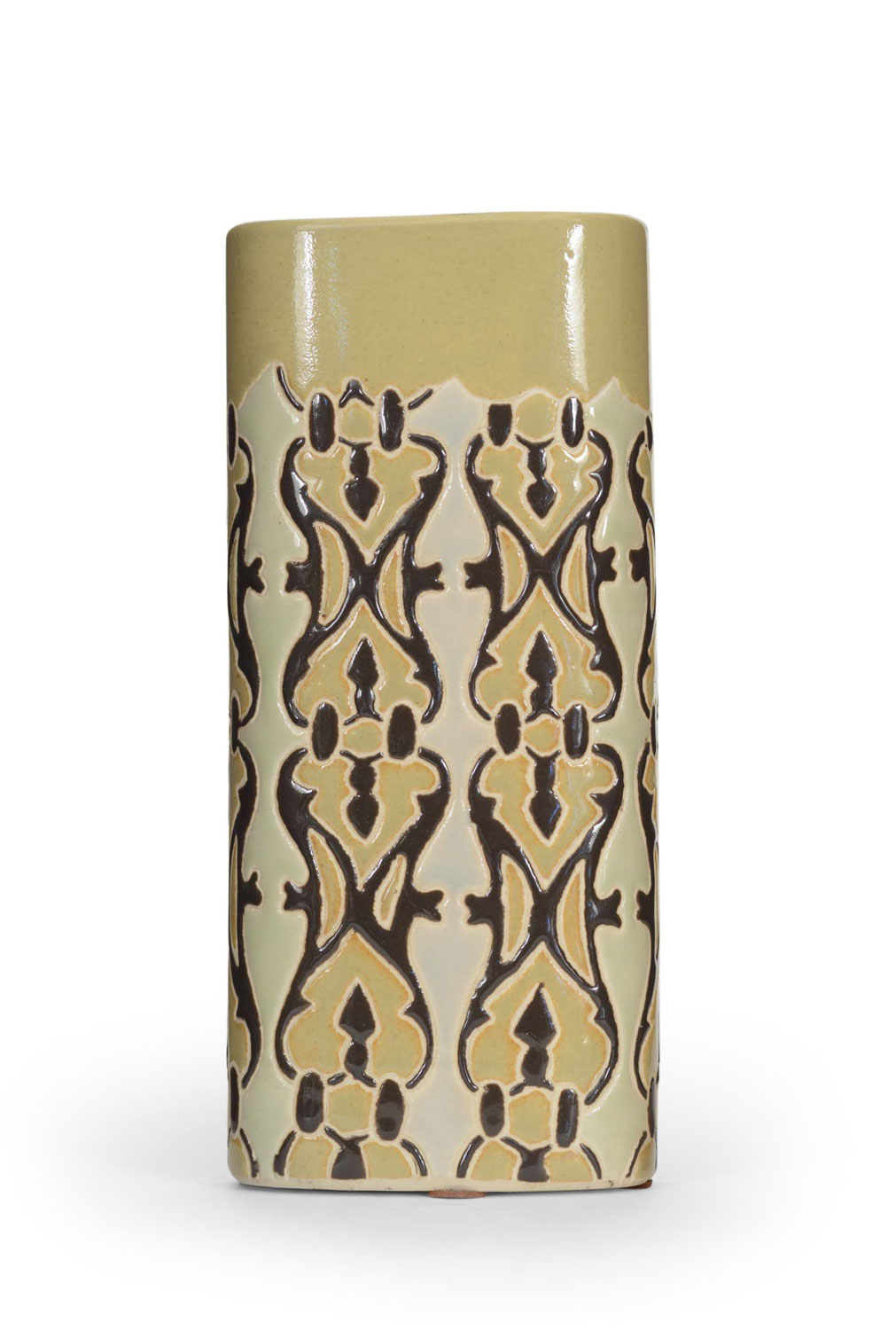 Vintage tall elliptical glazed ceramic vase with a decorative pattern in beige, mustard and brown