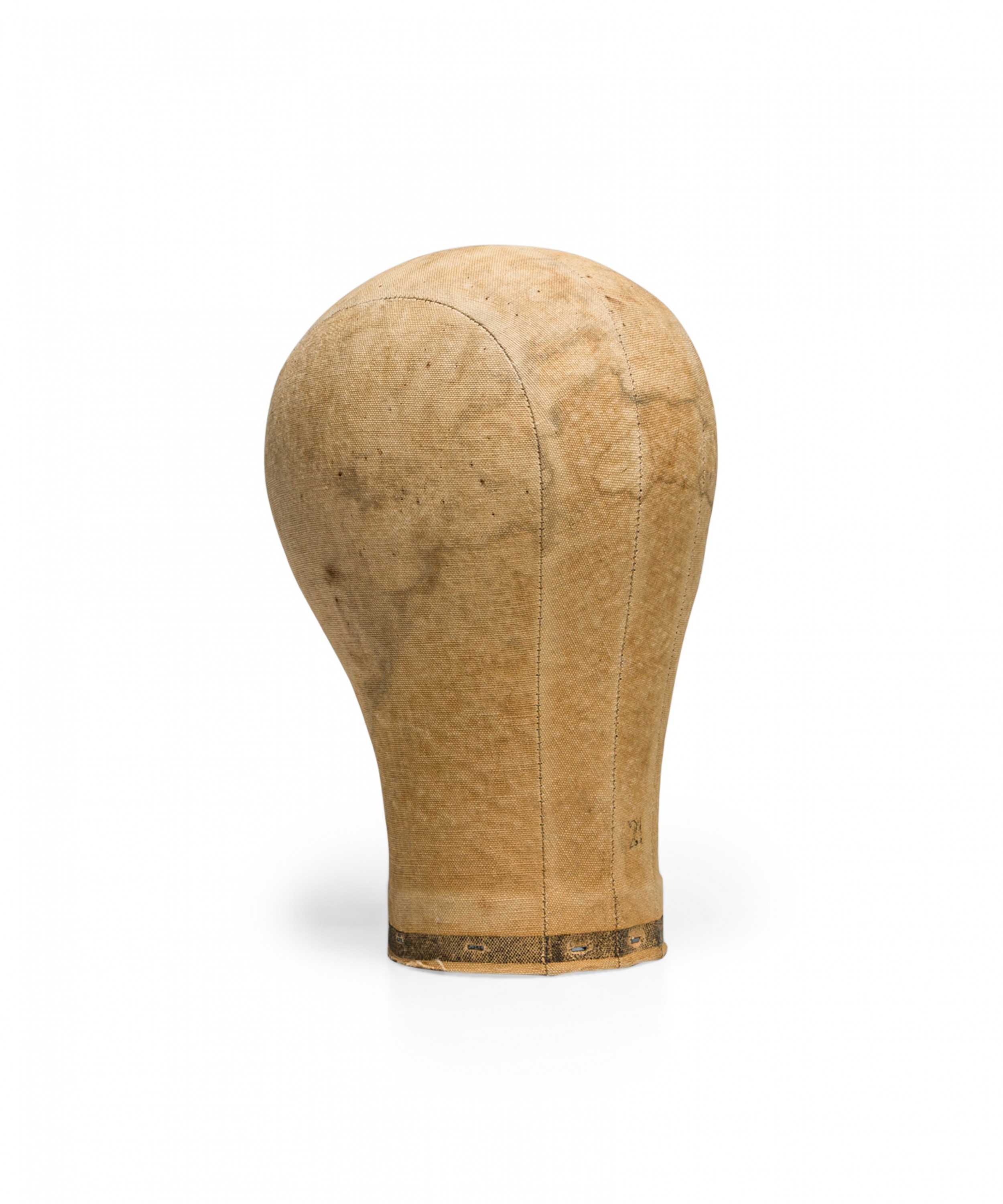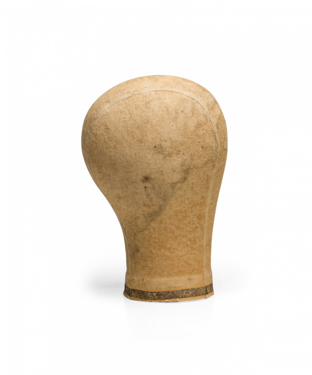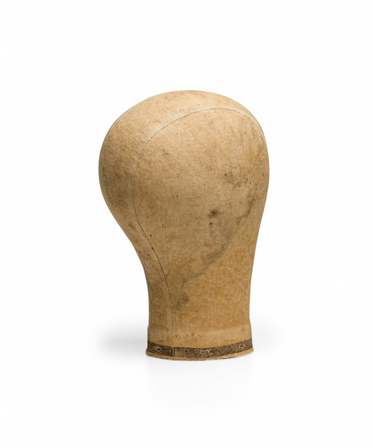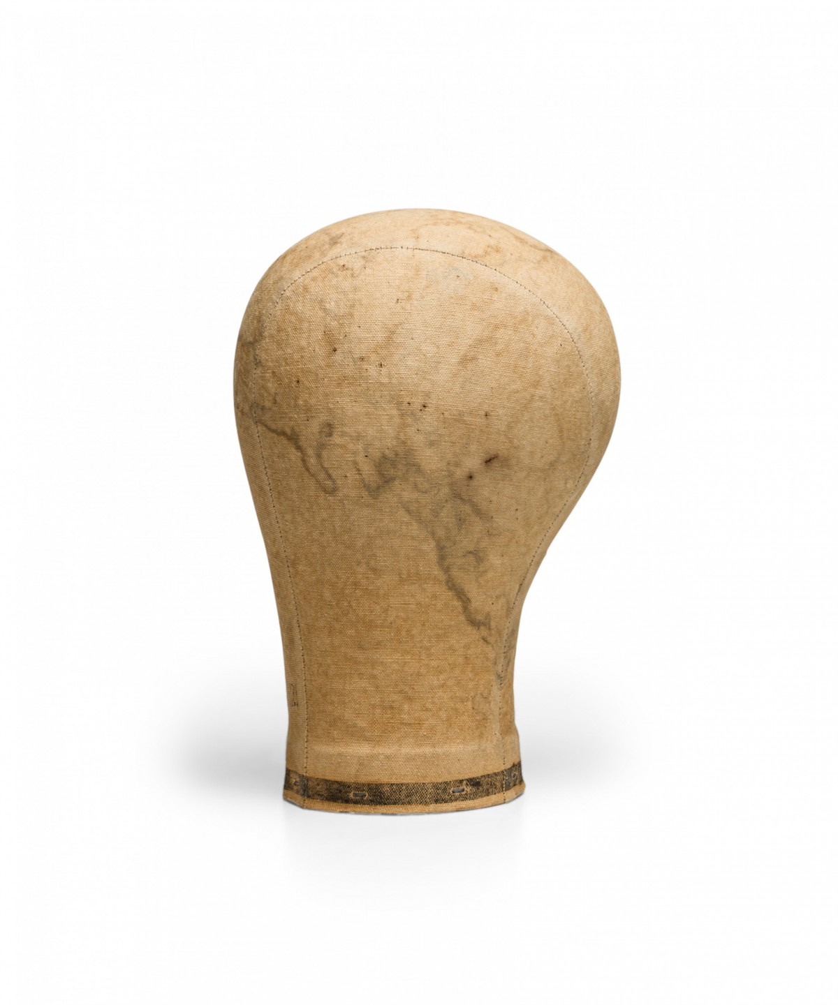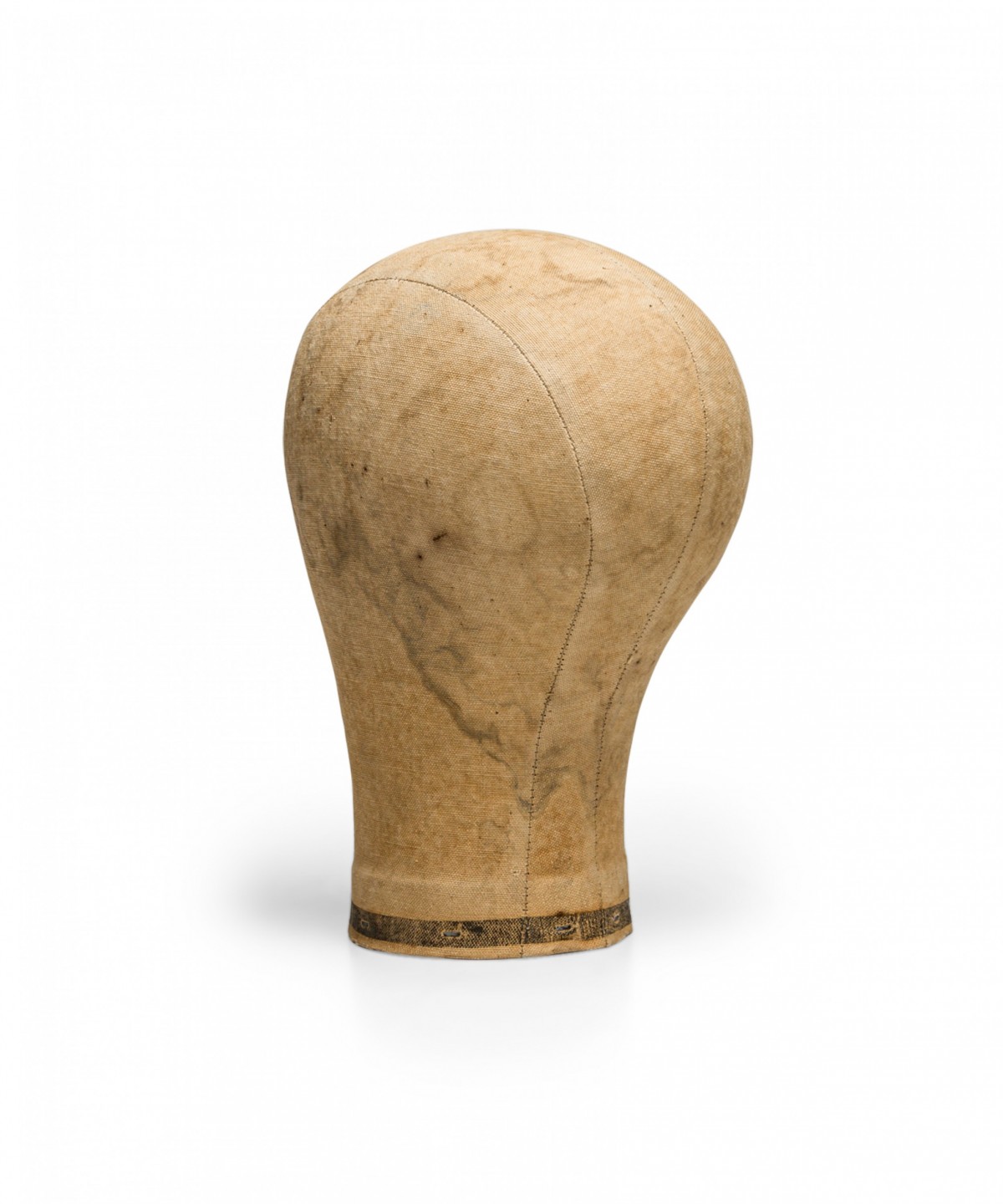 Vintage taupe-colored canvas padded millinery form on a brown circular plastic base