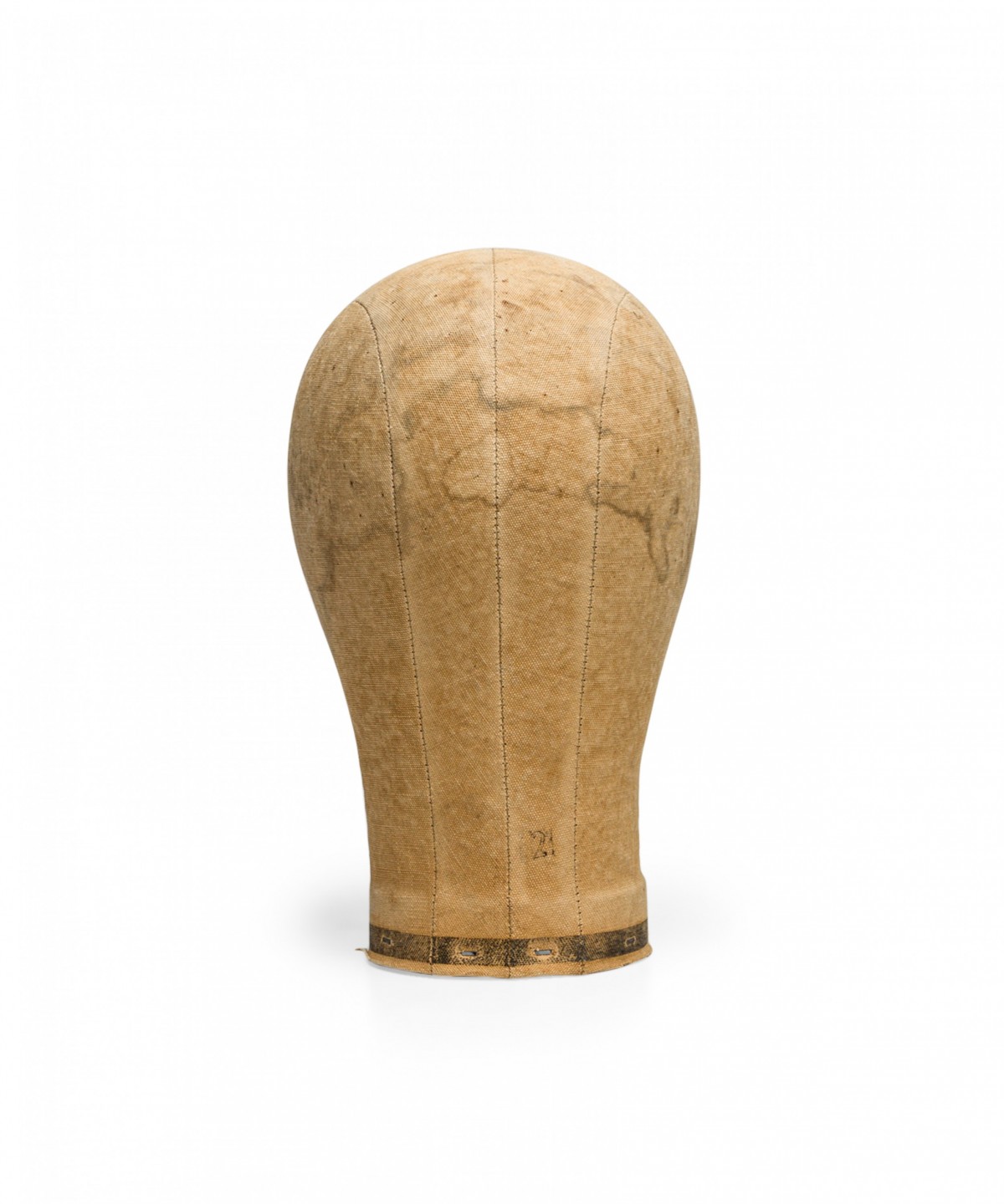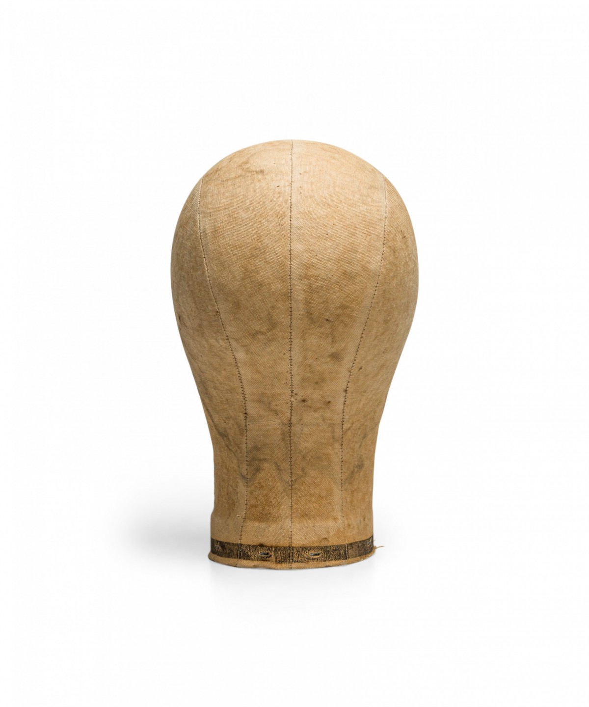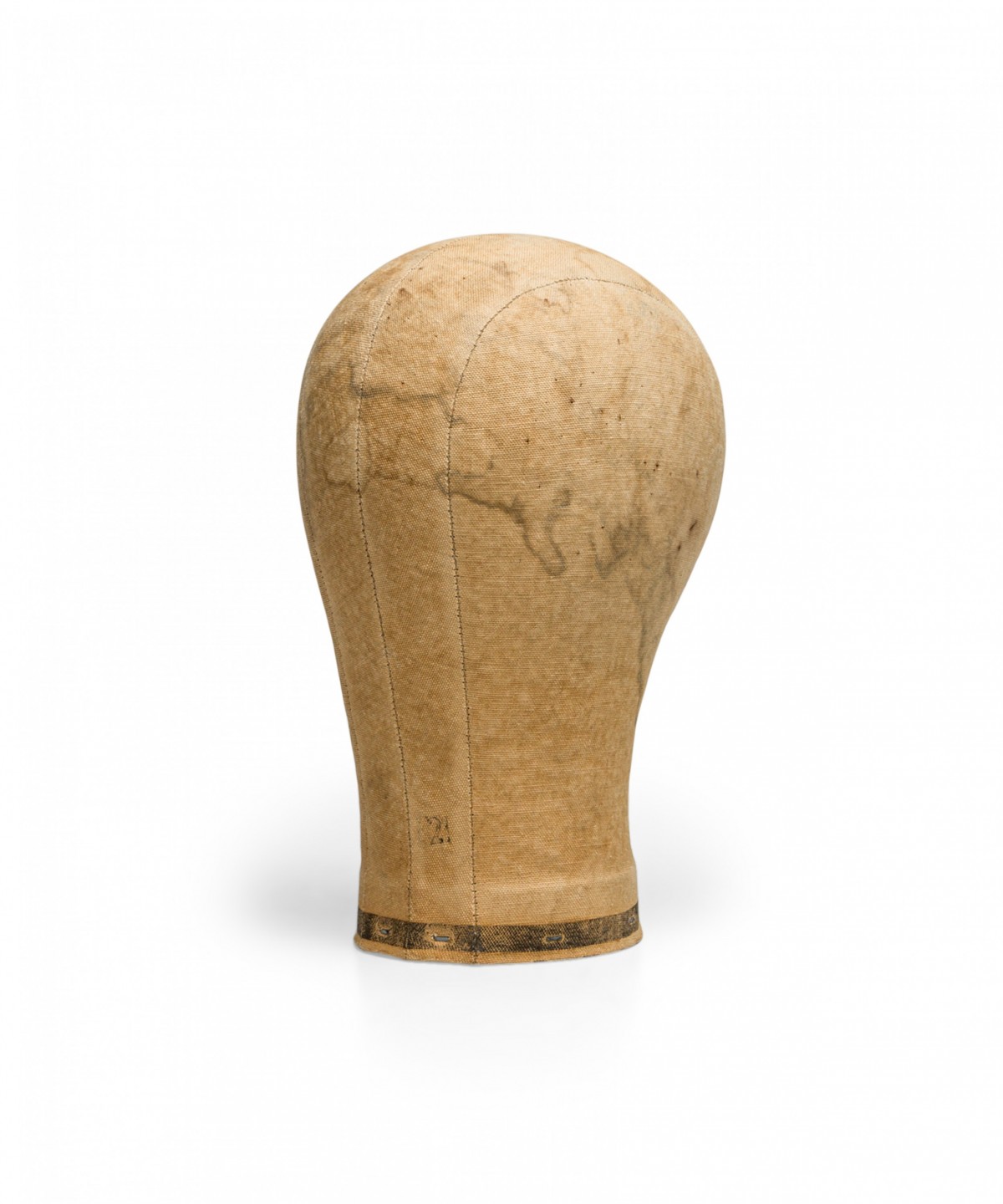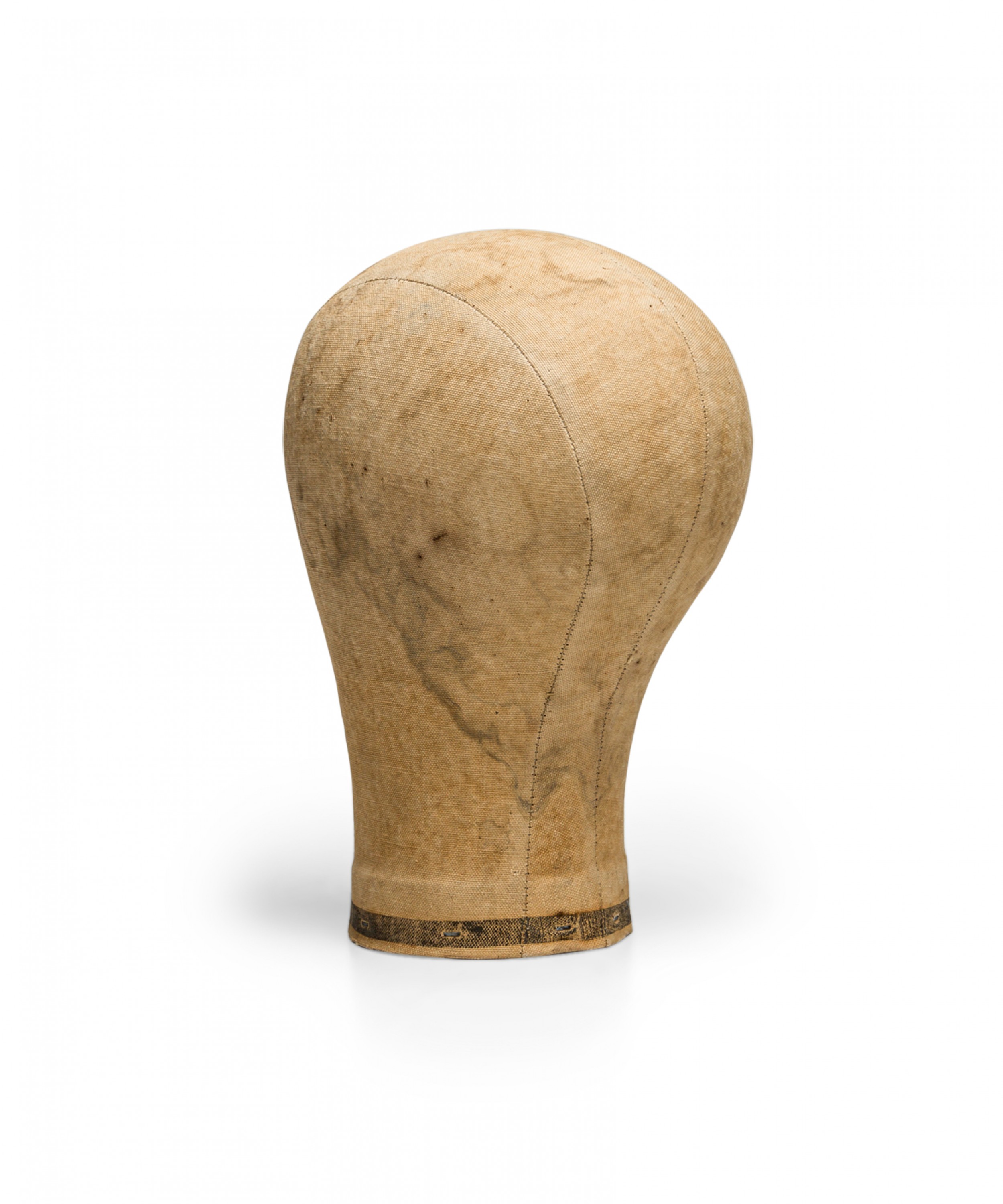 Vintage taupe-colored canvas padded millinery form on a brown circular plastic base